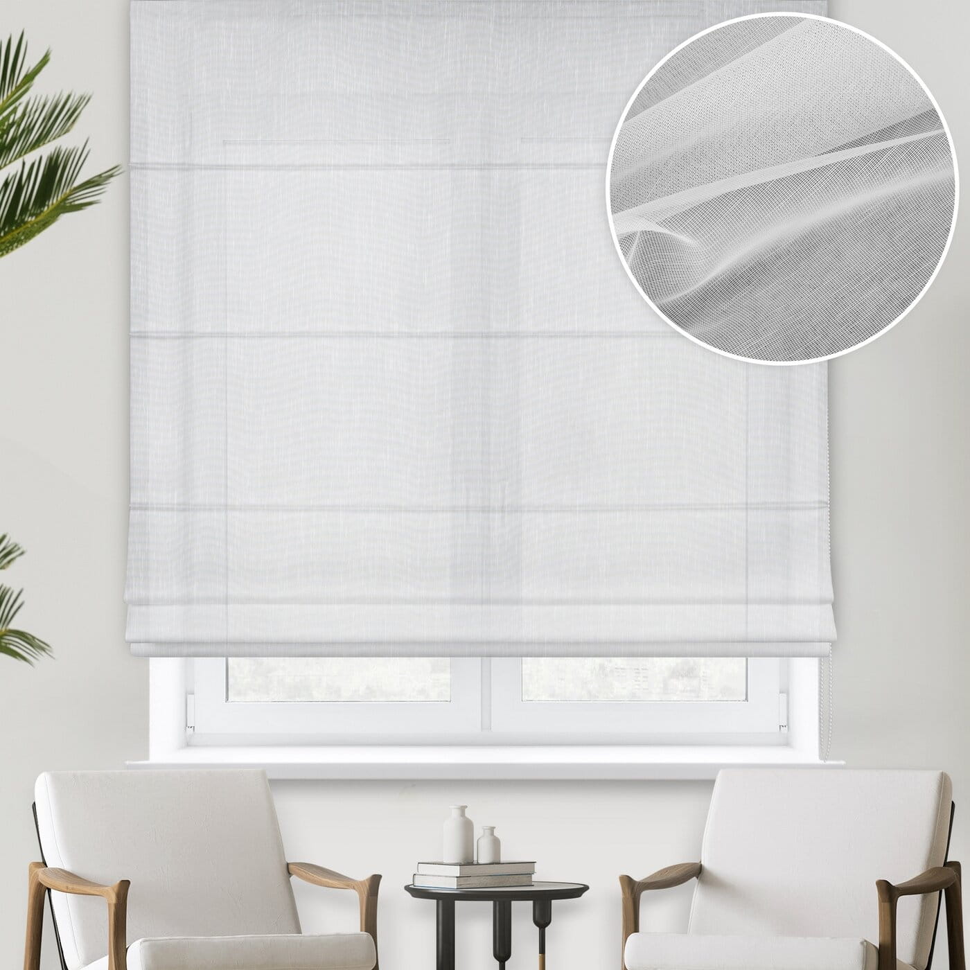 Záclonová římská roleta Aden, bílá, mikrosíťka s naznačeným vzorem deštíku, není třeba žehlit, šití na míru