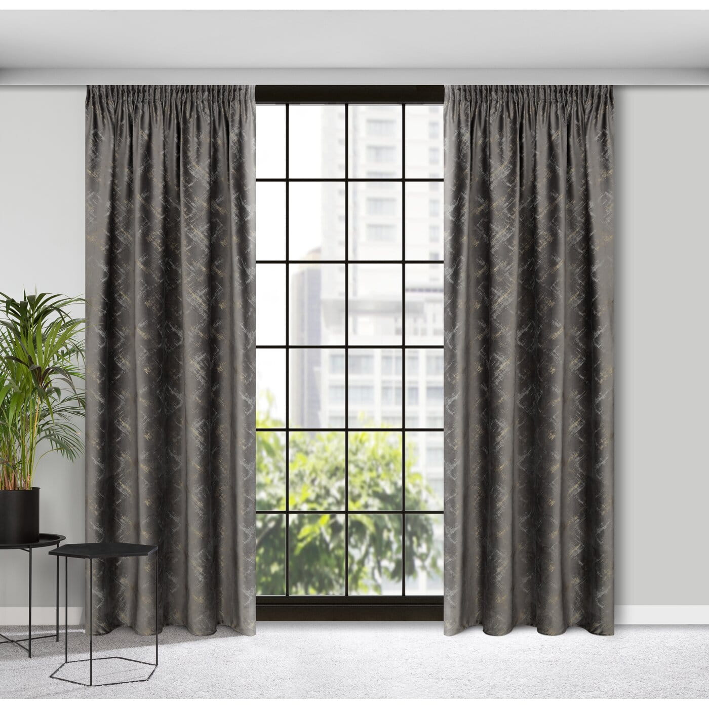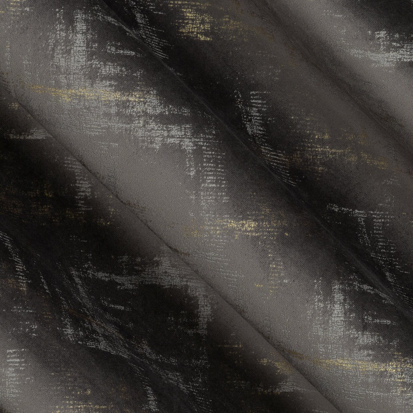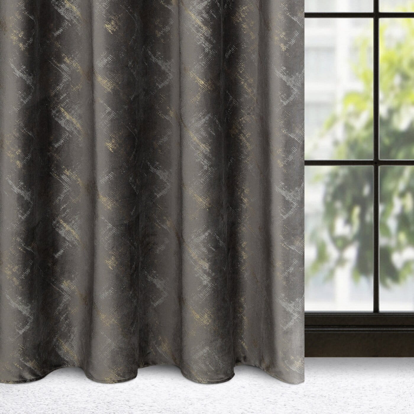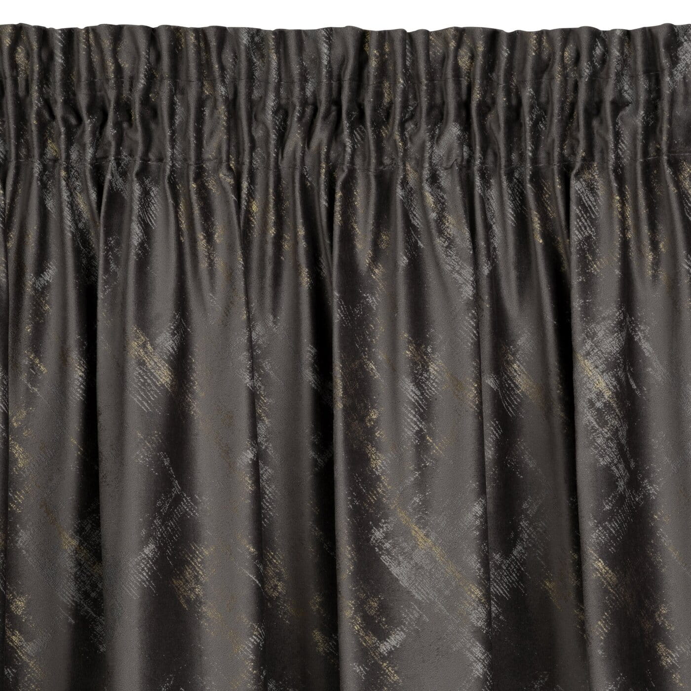Adria - originální design závěsů - hebký velvet v grafitové barvě, na ploše dekorace nepravidelnými tahy štětcem v šampaňské barvě.