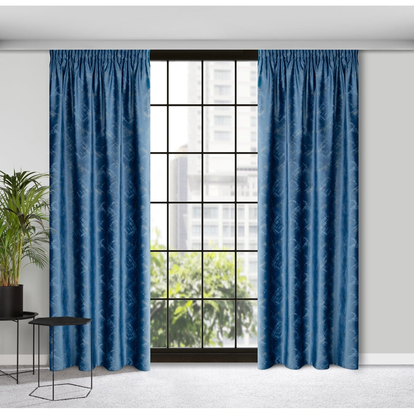 Adria - originální design závěsů - hebký velvet v tmavě blankytné barvě, na ploše dekorace nepravidelnými tahy štětcem v šampaňské barvě.
