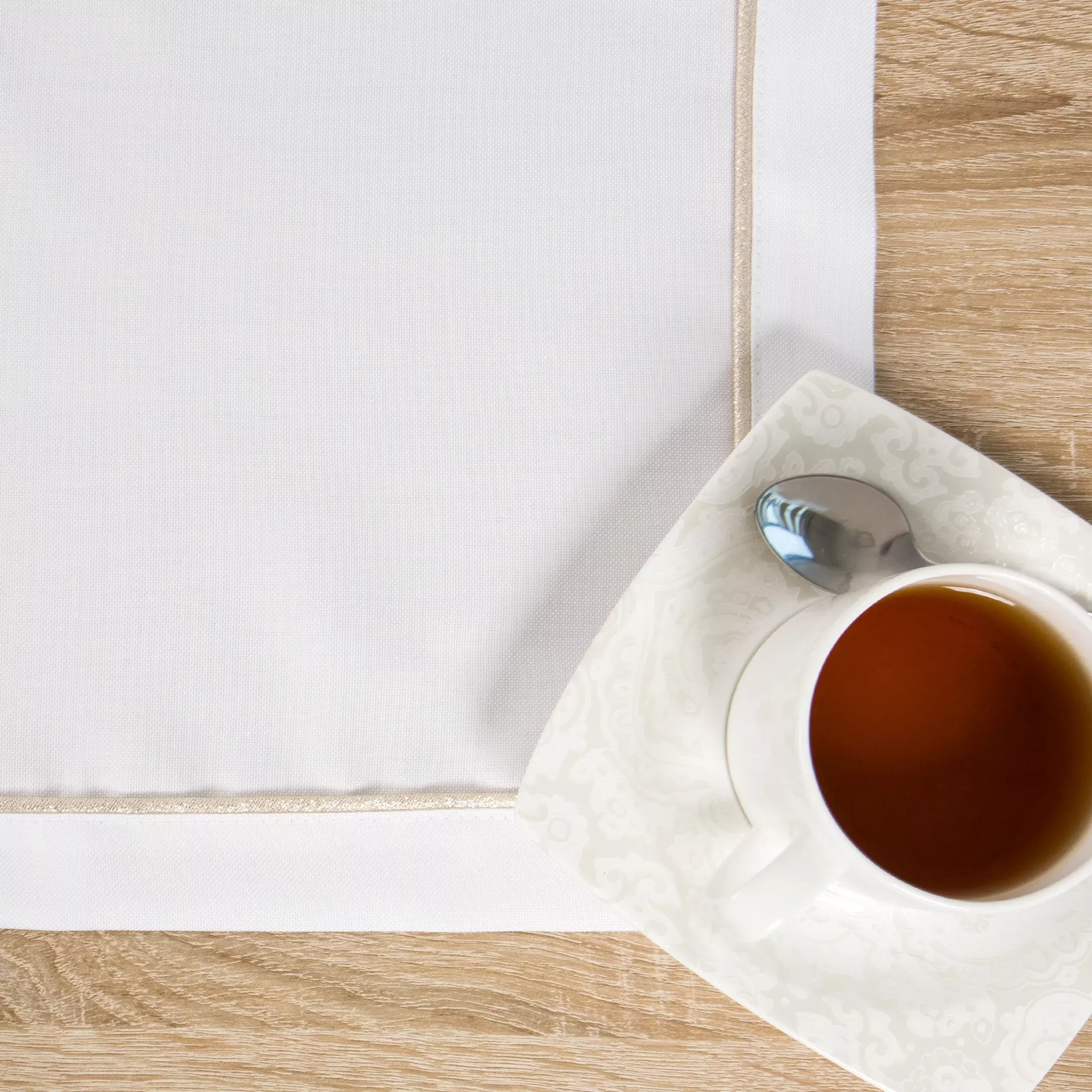 Stolní ubrus Karin, čtvrecový, bílá látka + zlatá paspulková lišta po obvodu, látka s jemně viditelnou strukturou, elegantní široký lem, velikost 85x85cm.