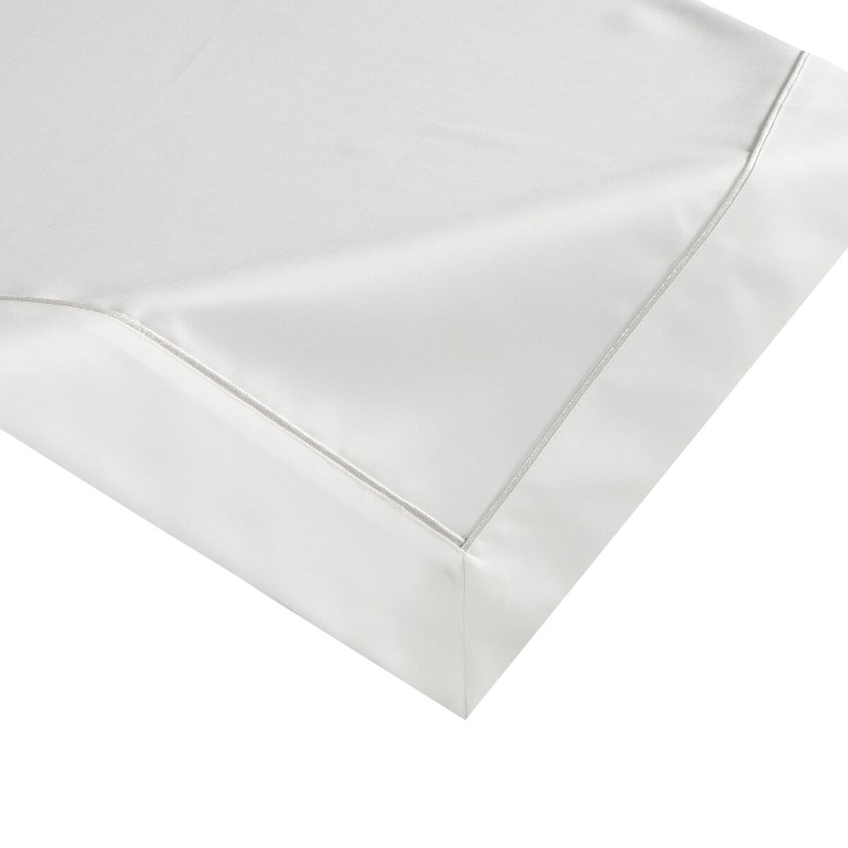 Stolní ubrus Madele, čtvrecový, bílá látka + stříbrná paspulková lišta po obvodu, látka s jemně viditelnou strukturou, elegantní široký lem, velikost 85x85cm.