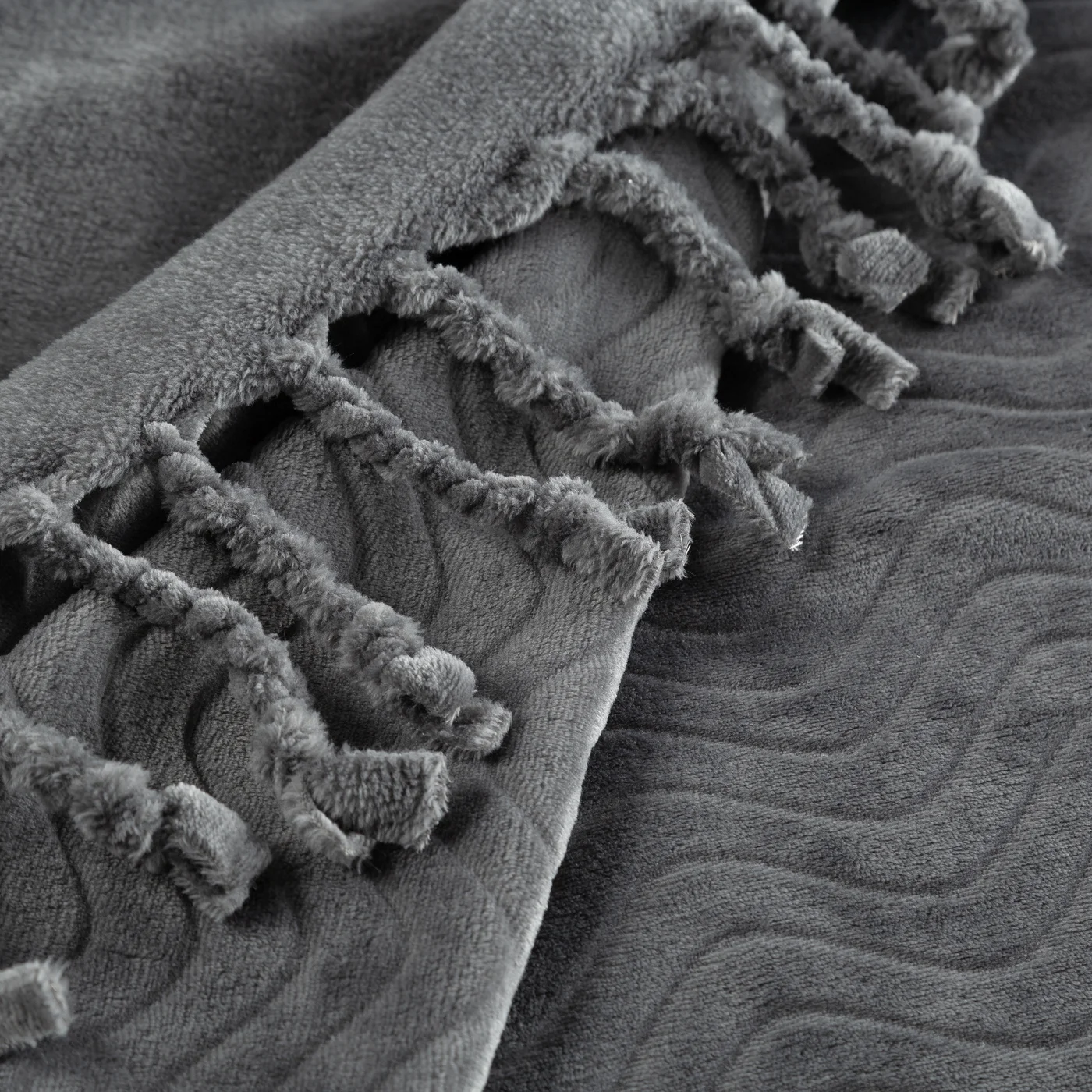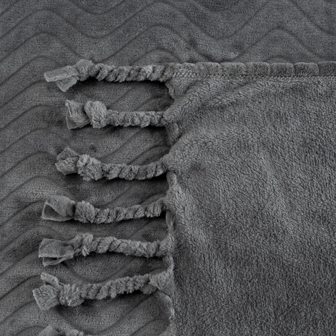 Deka řady Emma, měkká a příjemná látka typu flano, na ploše jemný vlnovaný vzor, splétané třásně na 2 stranách, barva ocelově šedá
