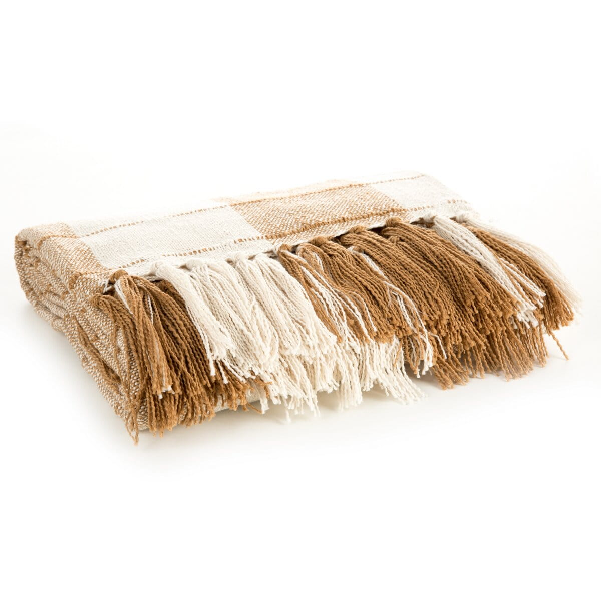 Deka Erie, klasicky tkaná látka, na 2 stranách dekorační třásně, vzor v medové barvě na krémovém podkladu