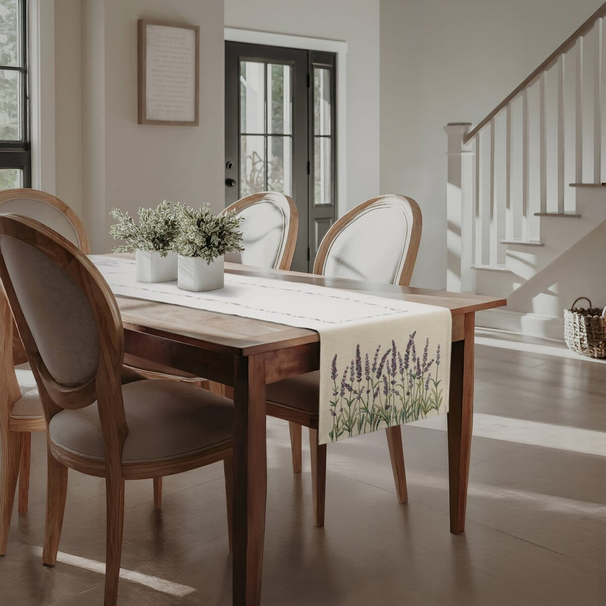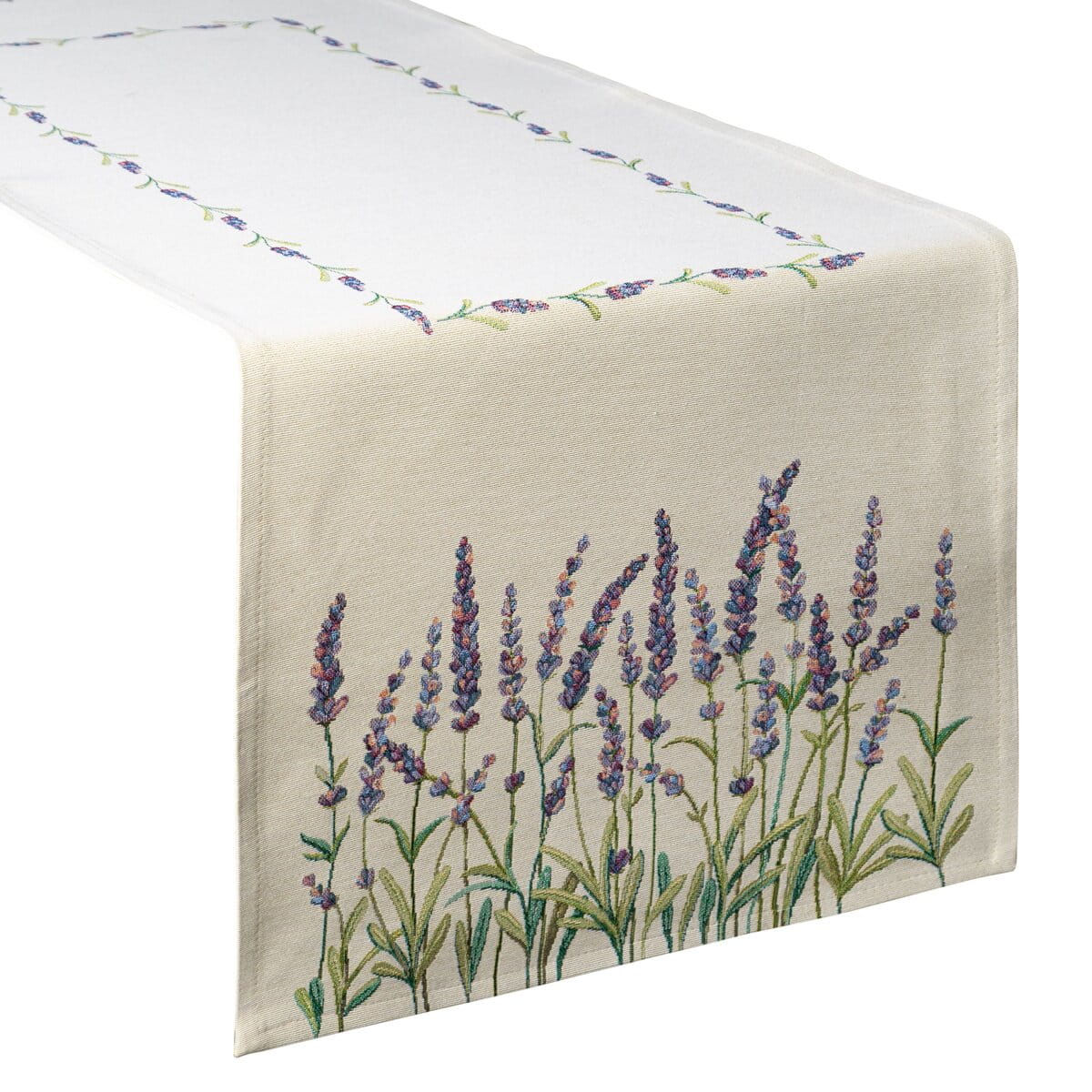 Gobelínový stolní běhoun, NENÍ TO POTISK - vzor je TKANÝ, motiv levandulí, vzor 129, světlý podklad v přírodní barvě