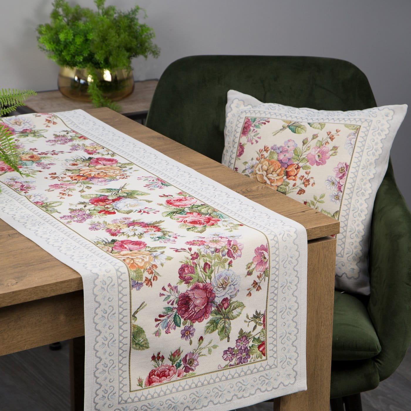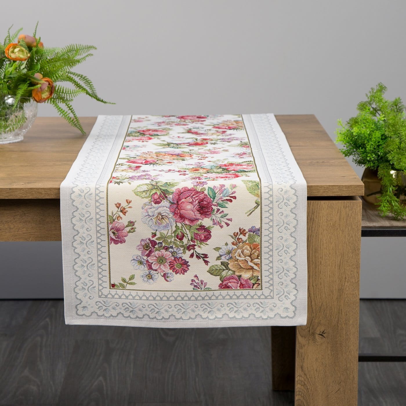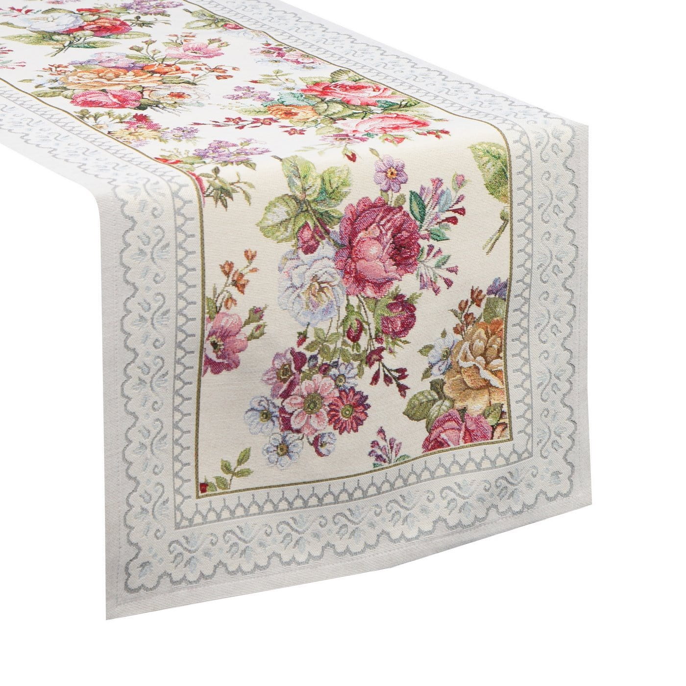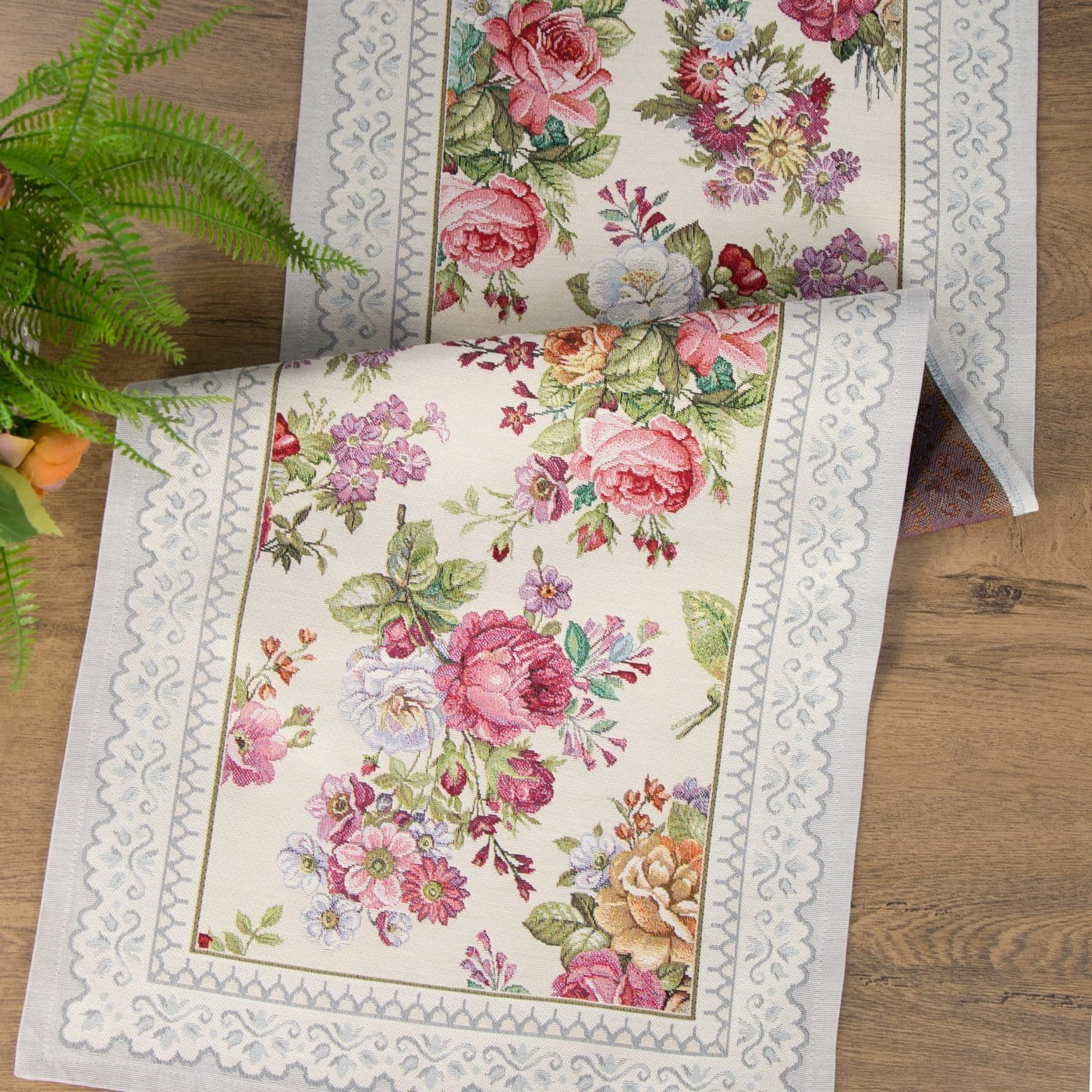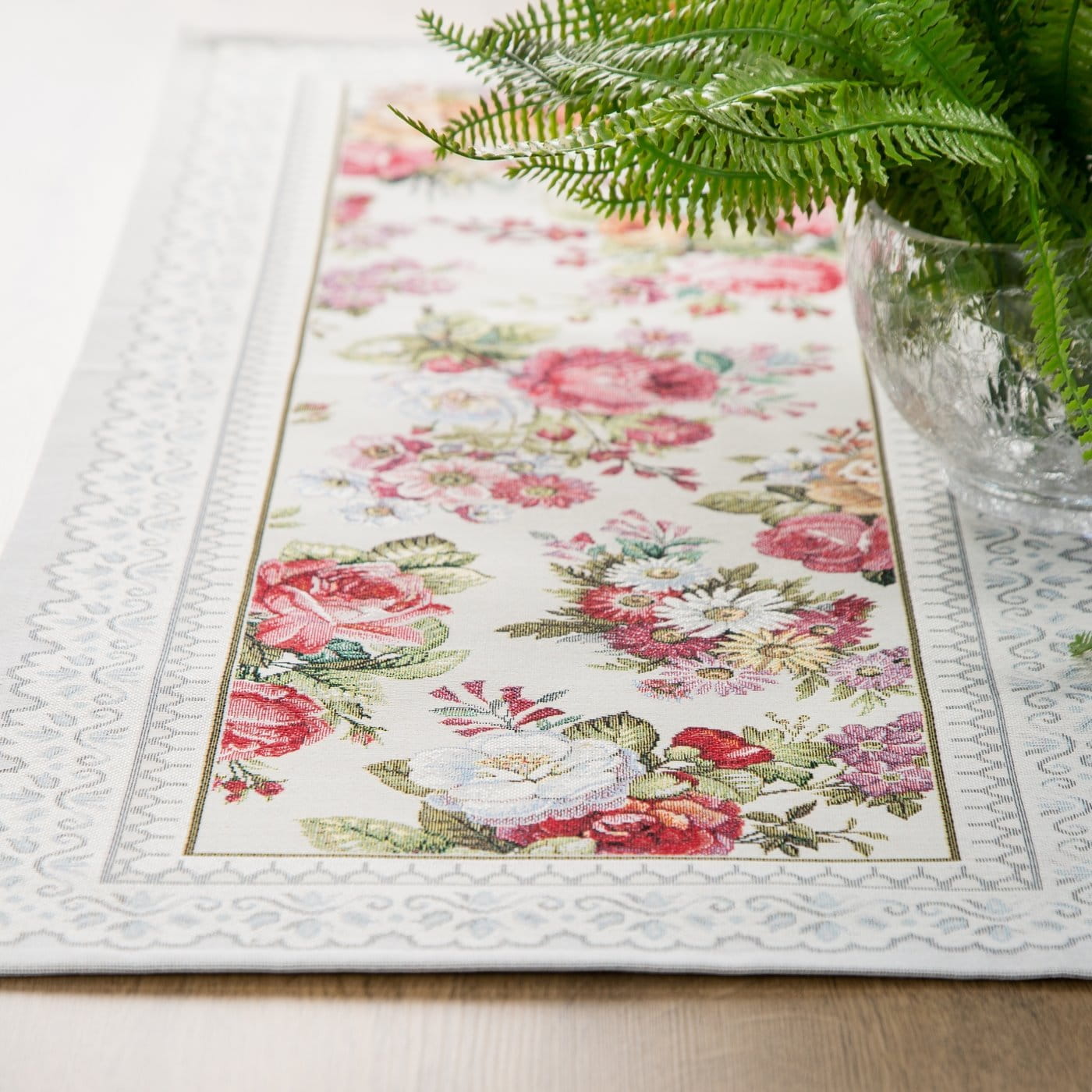 Dekorační stolní běhoun Gobelin, 40x100cm, tkaný pestrý vzor, šedavý okraj