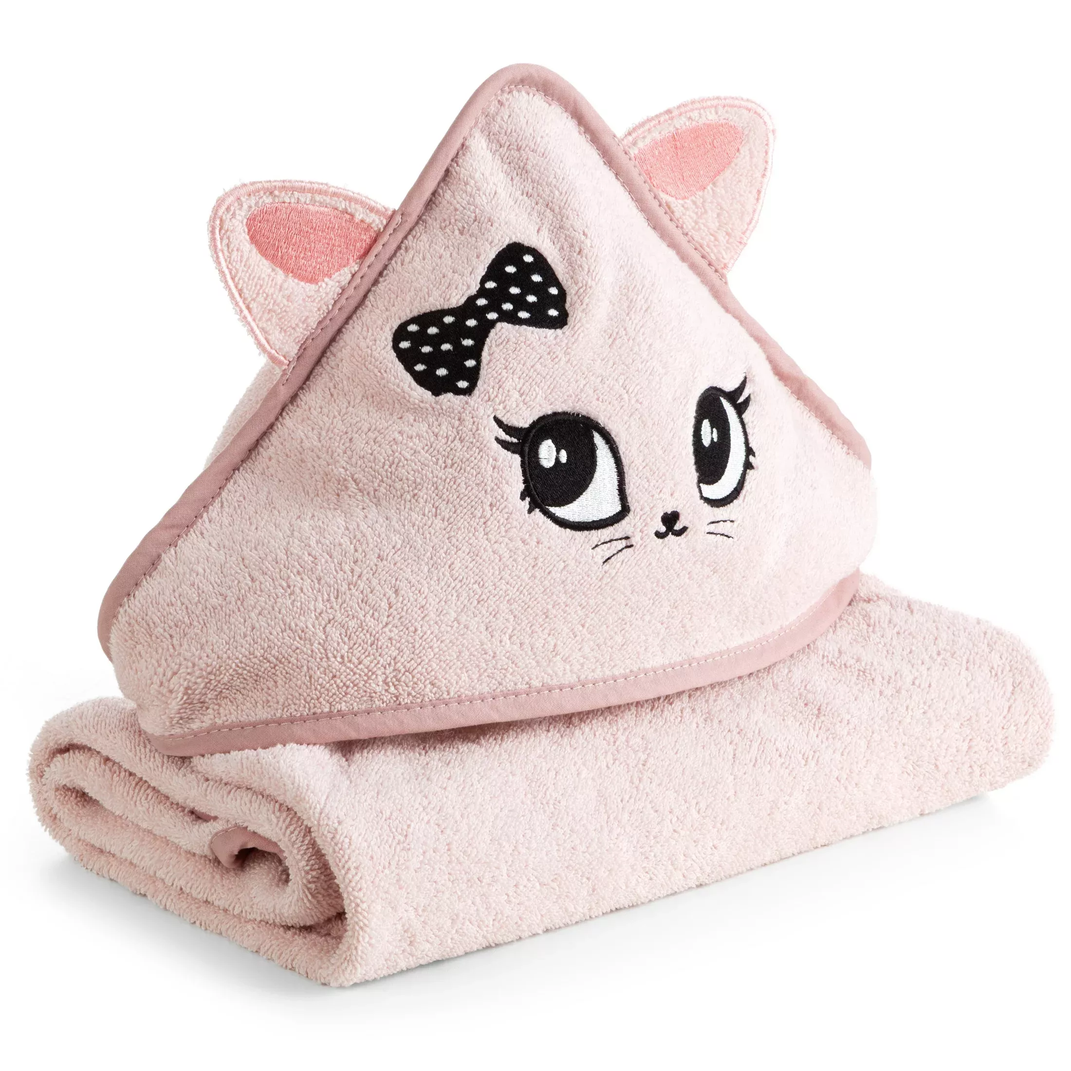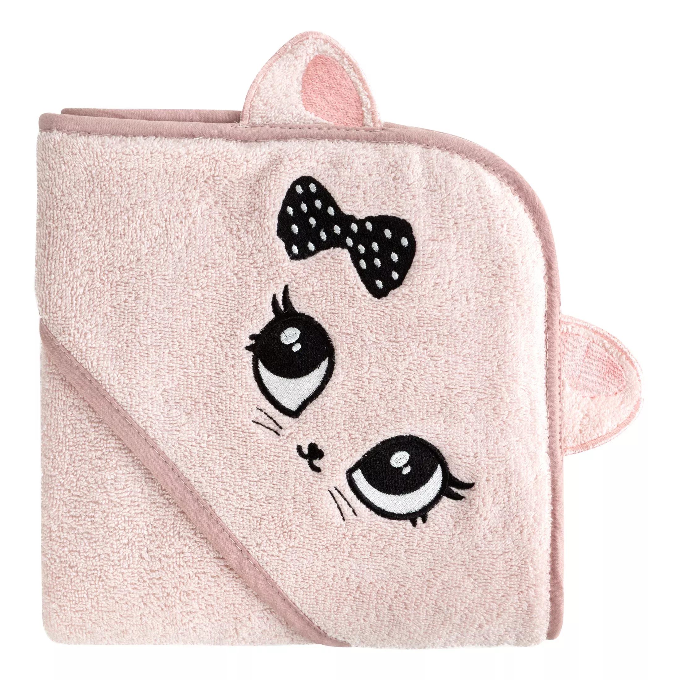 Dětská osuška s kapucí a s oušky, vzor Baby72, barva růžová, dekorační výšivka kočička