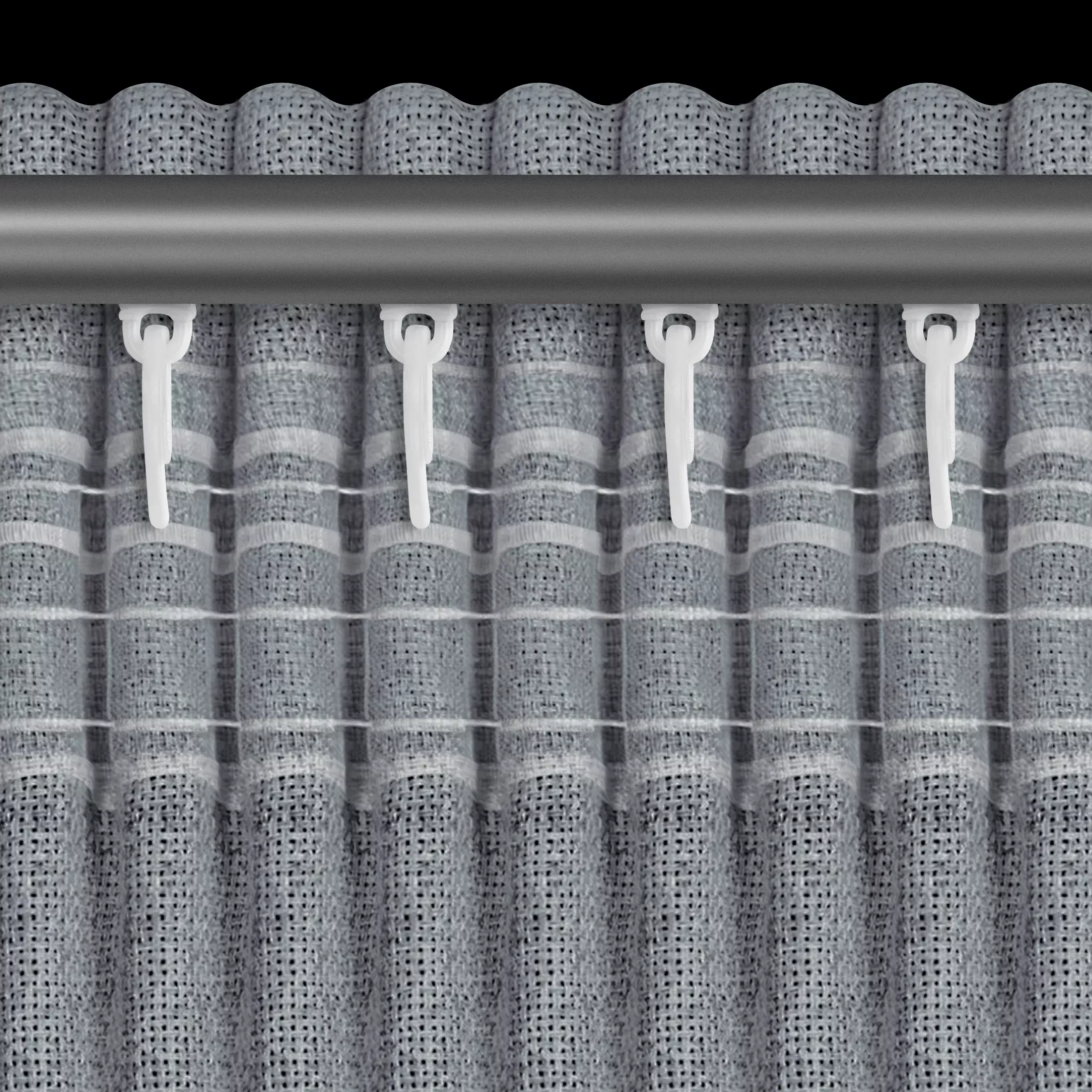 | Zavěšení | za stužky řasící pásky na háčky na garnýži, na háčky na stropní kolejničce, shora za okraj pásky žabkami, přímo na garnýžovou tyč do tunýlku za páskou |