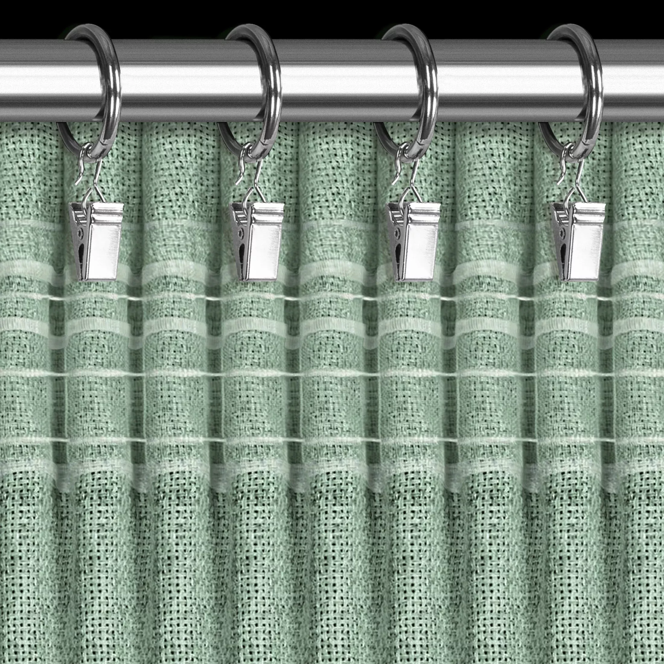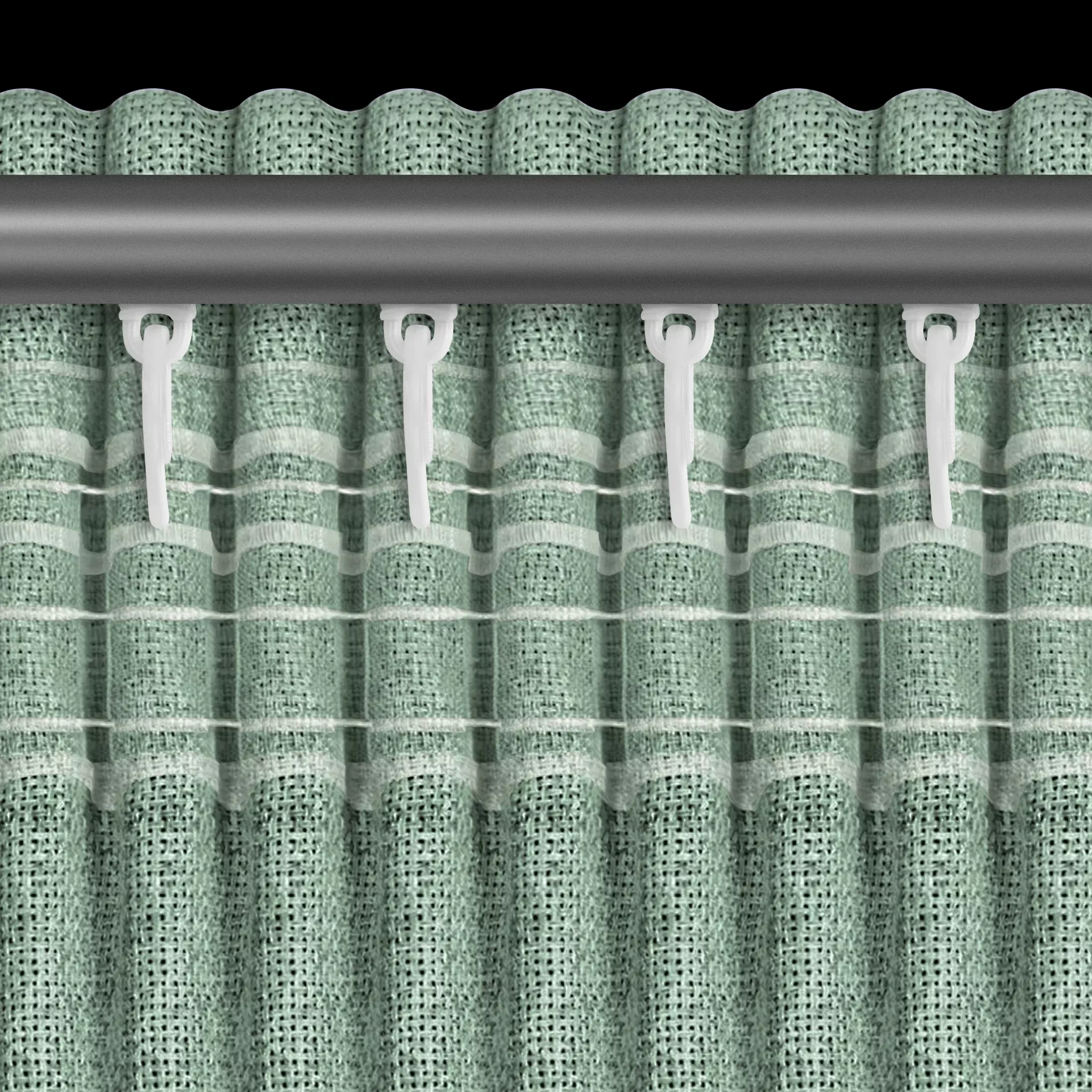 | Zavěšení | za stužky řasící pásky na háčky na garnýži, na háčky na stropní kolejničce, shora za okraj pásky žabkami, přímo na garnýžovou tyč do tunýlku za páskou |