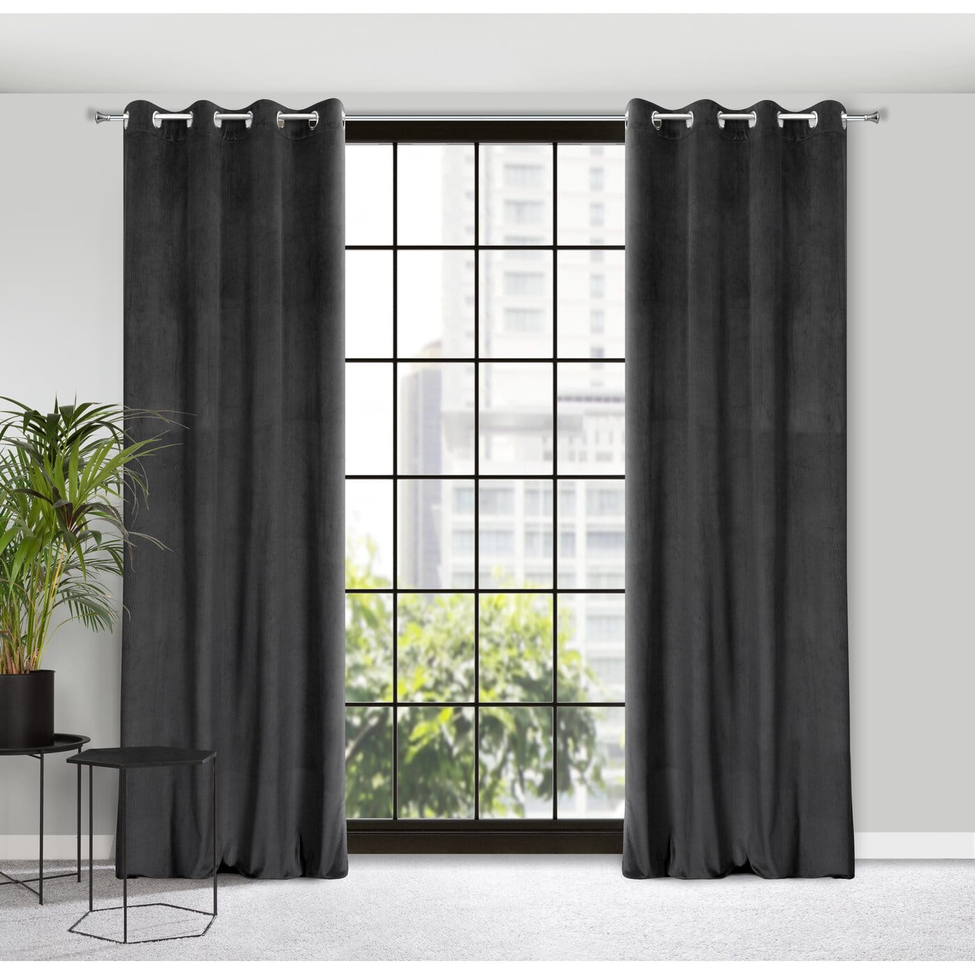 Lili - efektní velvetové závěsy s vlnovým vzorem v látce, černá barva, na kroužcích, velikost 140x250cm, lze zkrátit