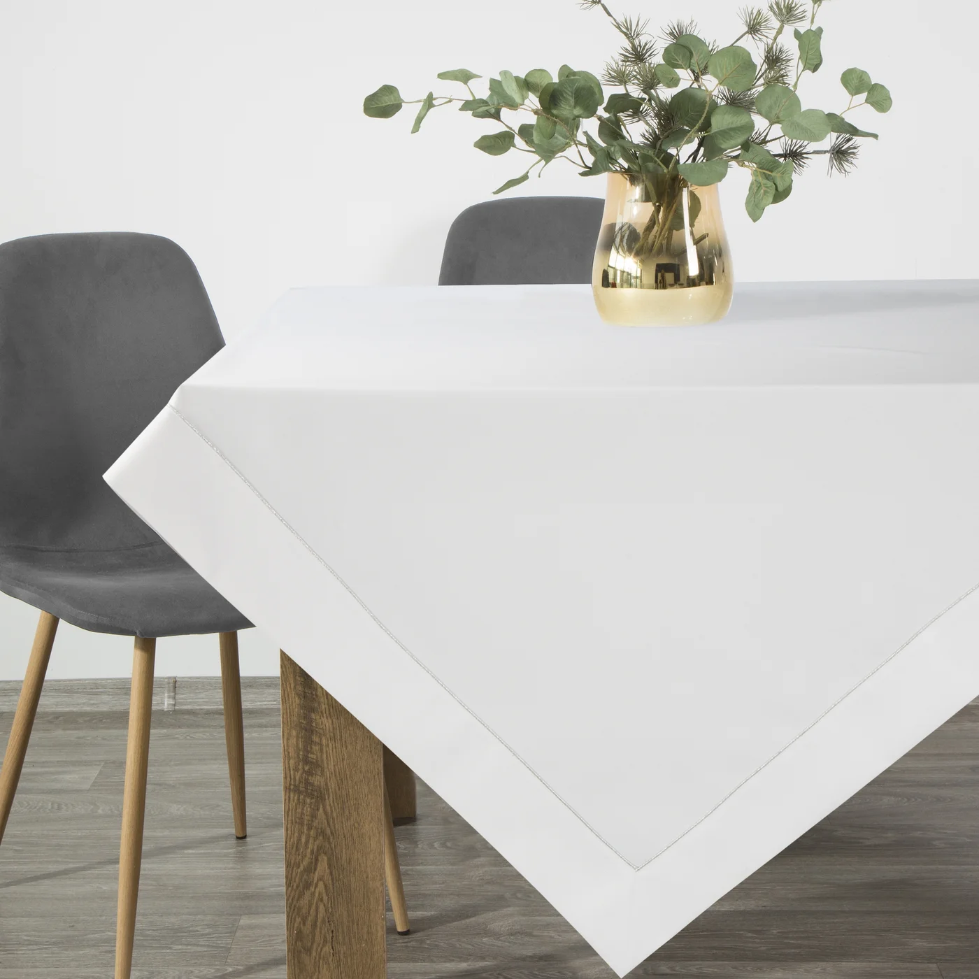 Ubrus Karin, bílá látka + stříbrná paspulková lišta po obvodu, látka s jemně viditelnou strukturou, elegantní široký lem, velikost 140x180cm.