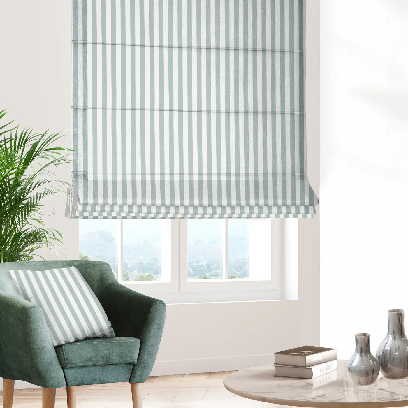 Římská roleta šitá na míru, látka Elit3, bavlněná směsová látka púřírodního plátěného vzhledu, vzor svislé pruhy ve světle tyrkysové barvě