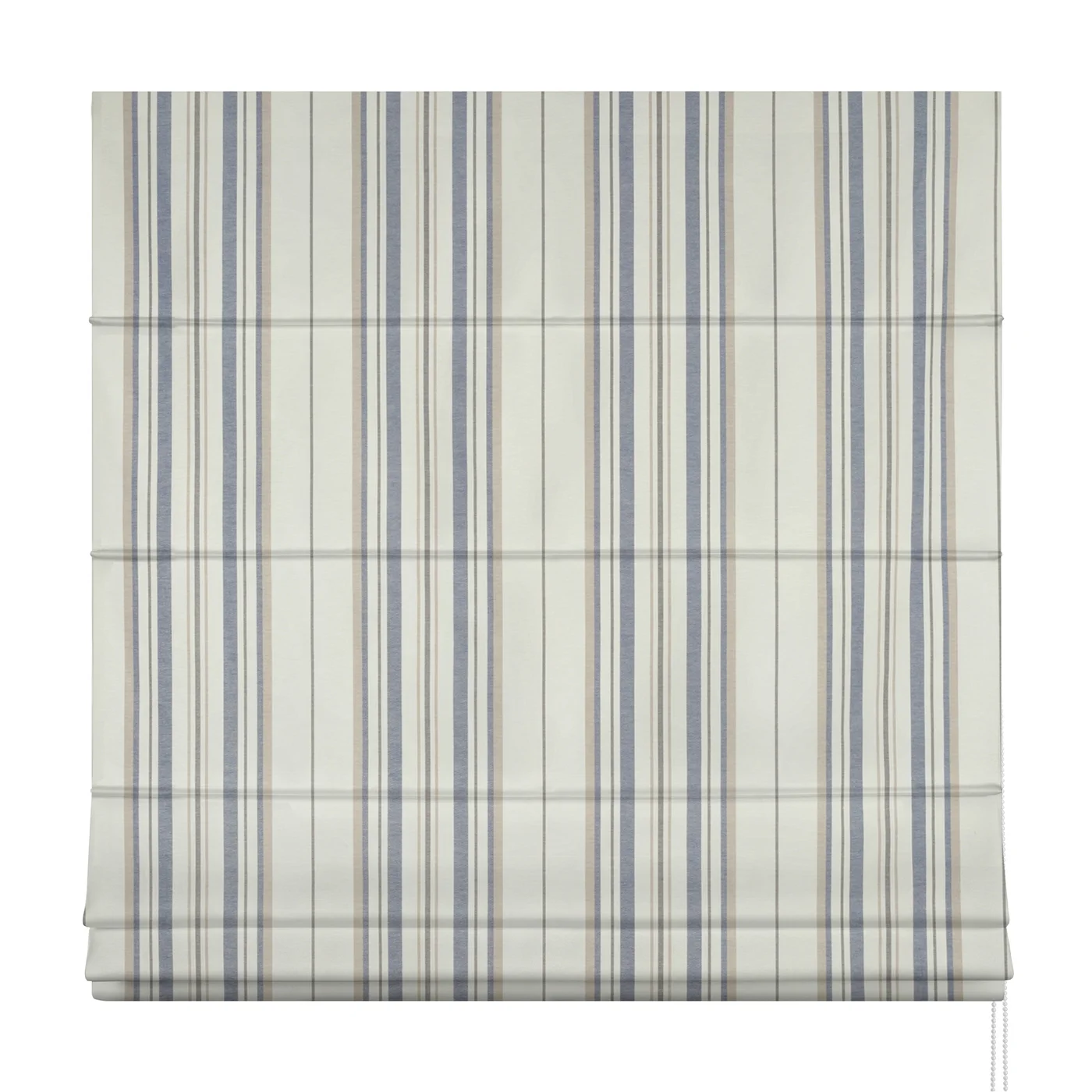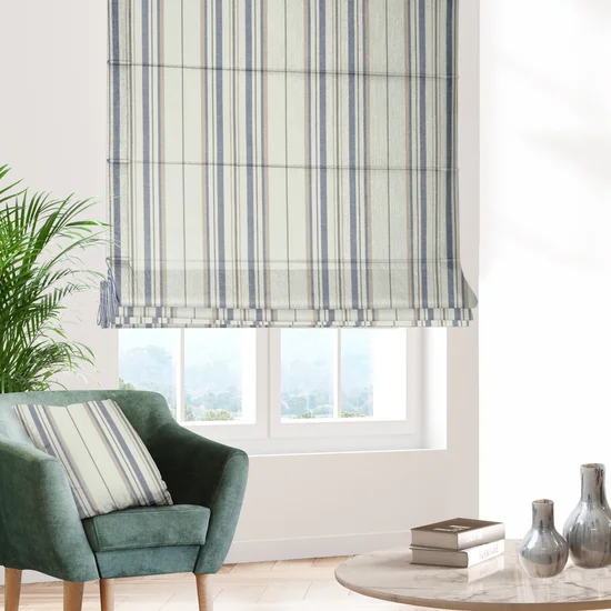 Římská roleta šitá na míru, látka Elit6, bavlněná směsová látka přírodního plátěného vzhledu, vzor svislé pruhy ve světle modré barvě