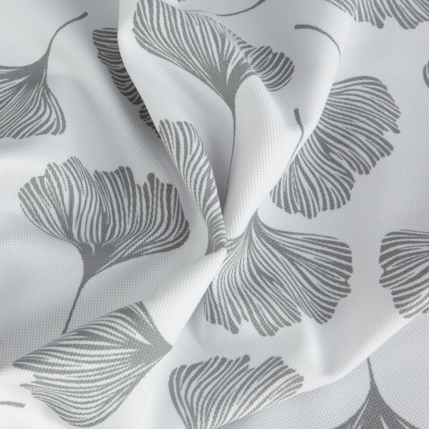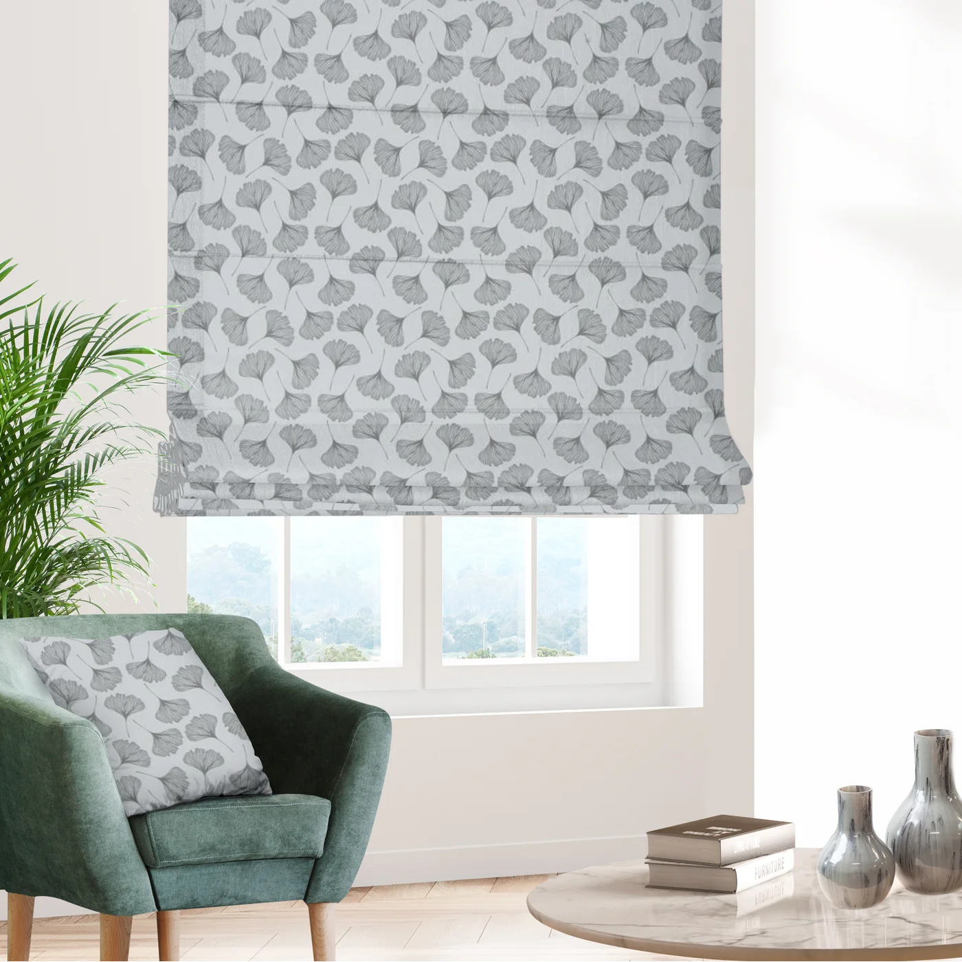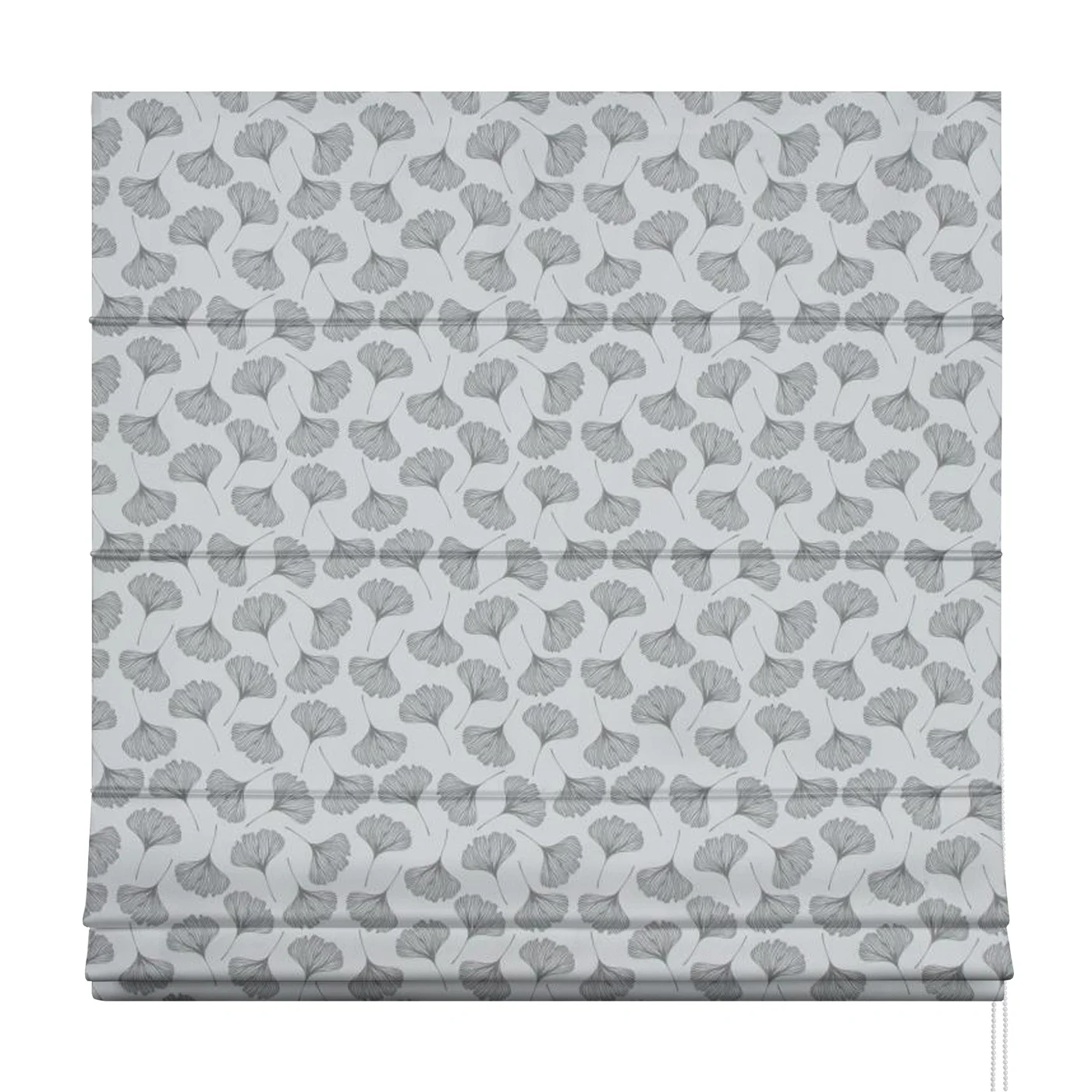 Římská roleta šitá na míru, vzor Noya1040, hustěji tkaná látka, šedý botanický vzor na bílém podkladu