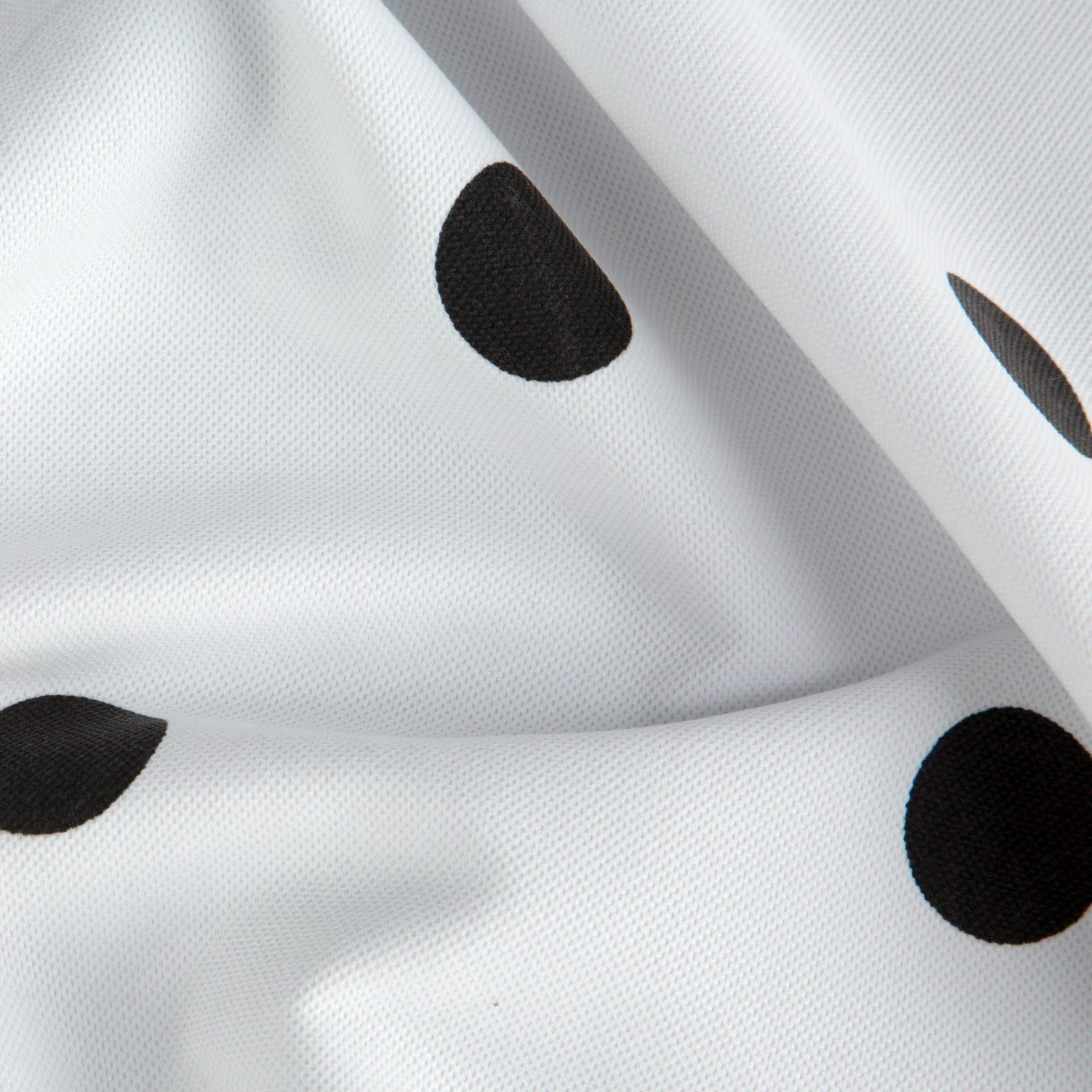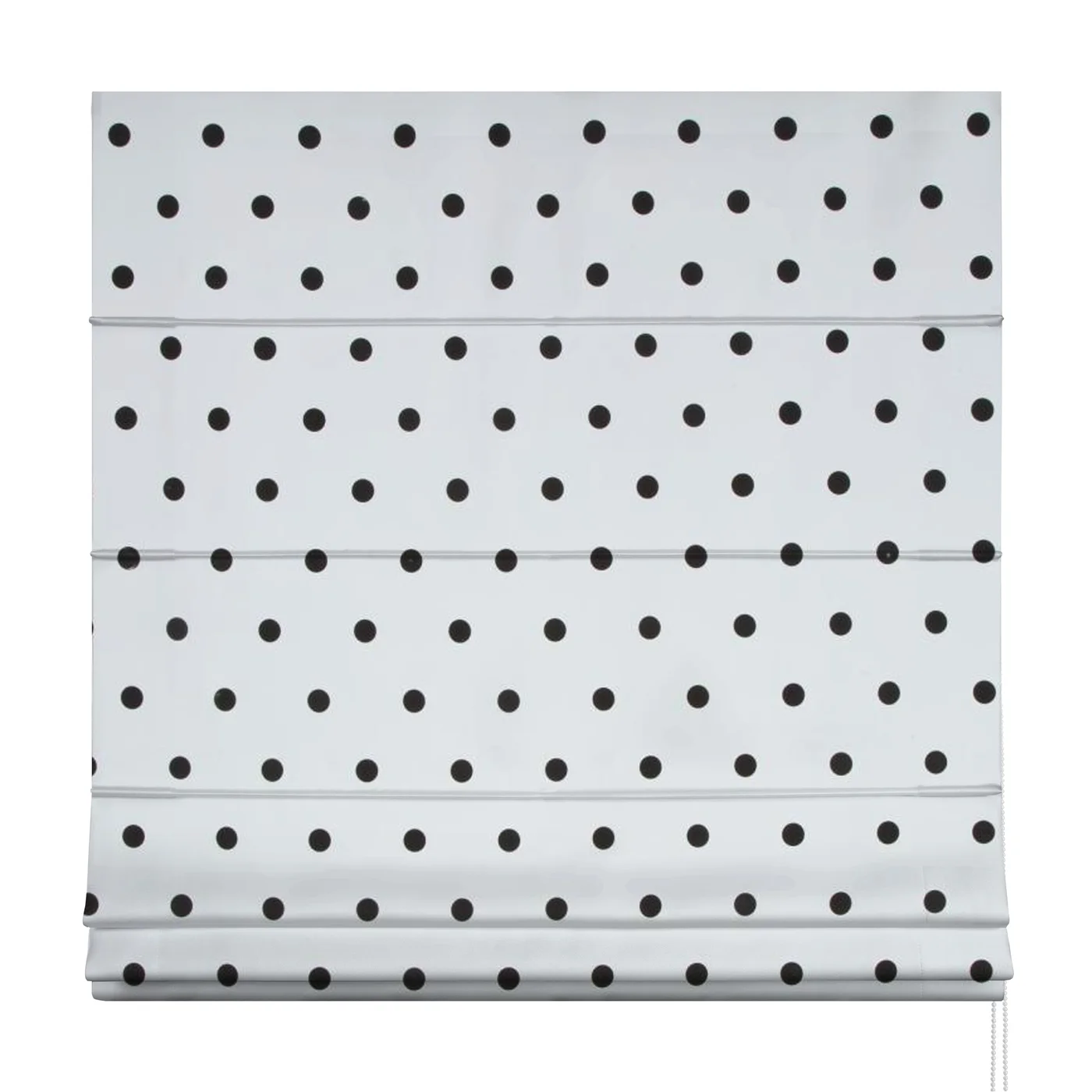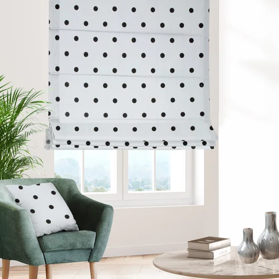 Římská roleta šitá na míru, vzor Noya1048, hustěji tkaná látka, černé puntíky na bílém podkladu
