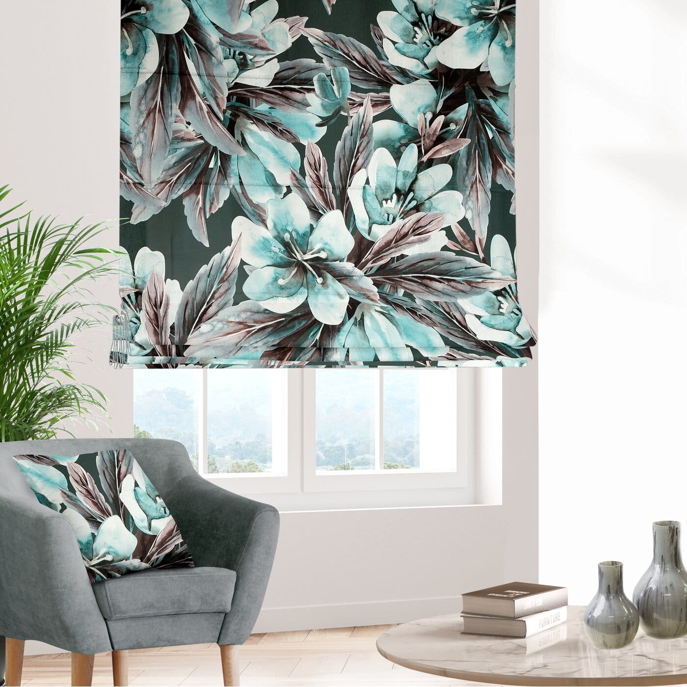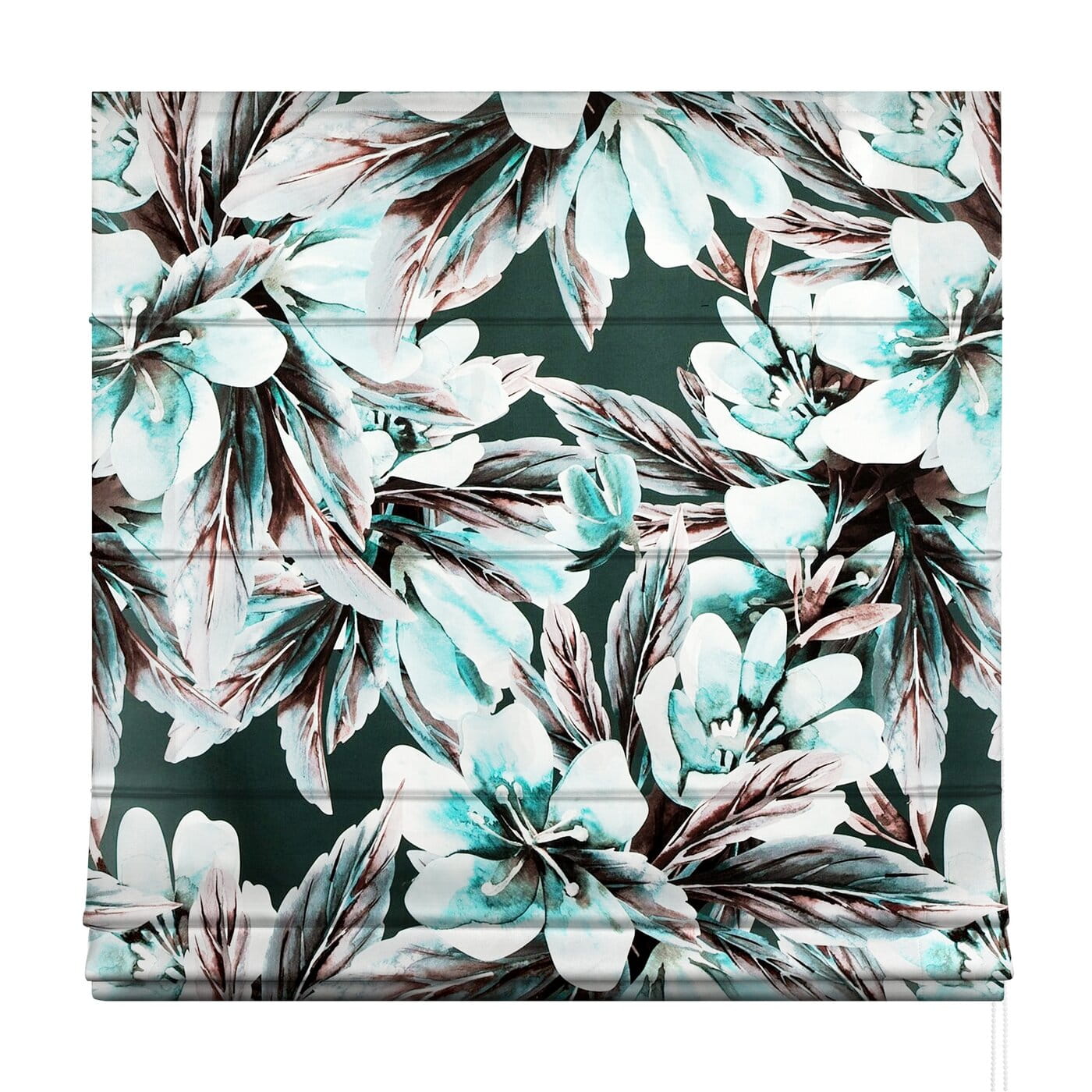 Římská roleta šitá na míru, látka G695, tyrkysově hnědá koloristika, potisk velkokvětým vzorem