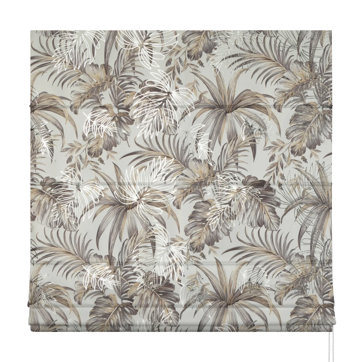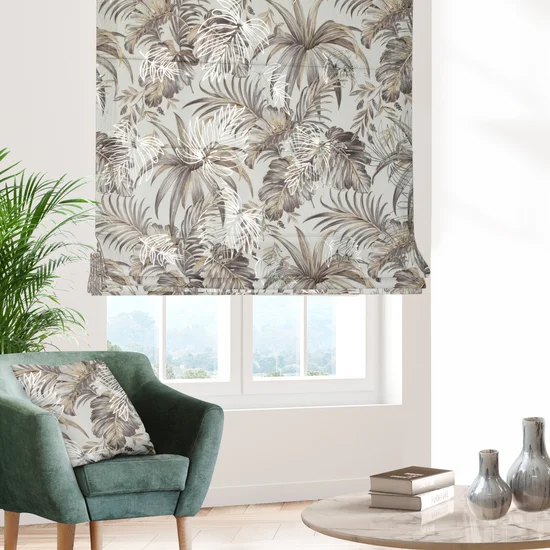 Římská roleta šitá na míru, látka Rodos2, hebký velvet, botanický vzor, listy monstery, béžová koloristika na světlém pokladu, stříbrný siluetový dotisk