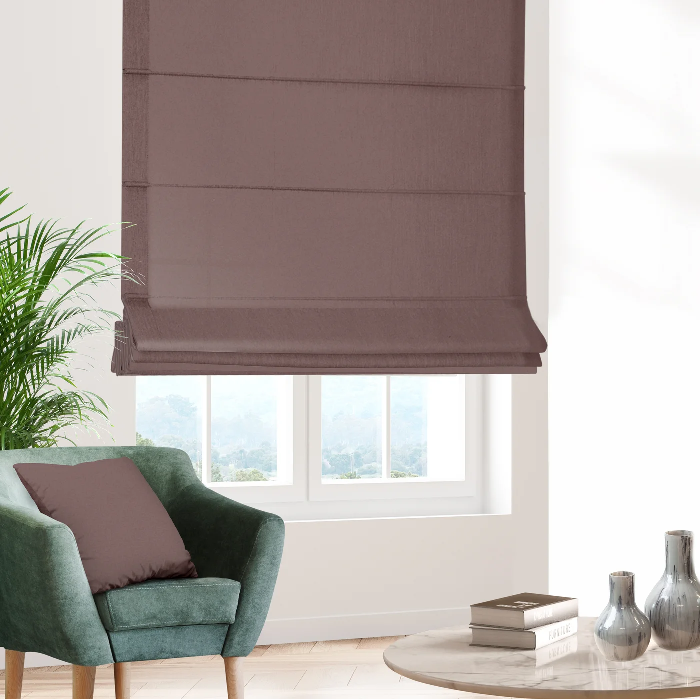 Počítejte s tím, že u římských rolet je látka rolety na okně opticky vždy o něco světlejší (zdroj denního světla je za látkou), než na obrázku detailu látky.