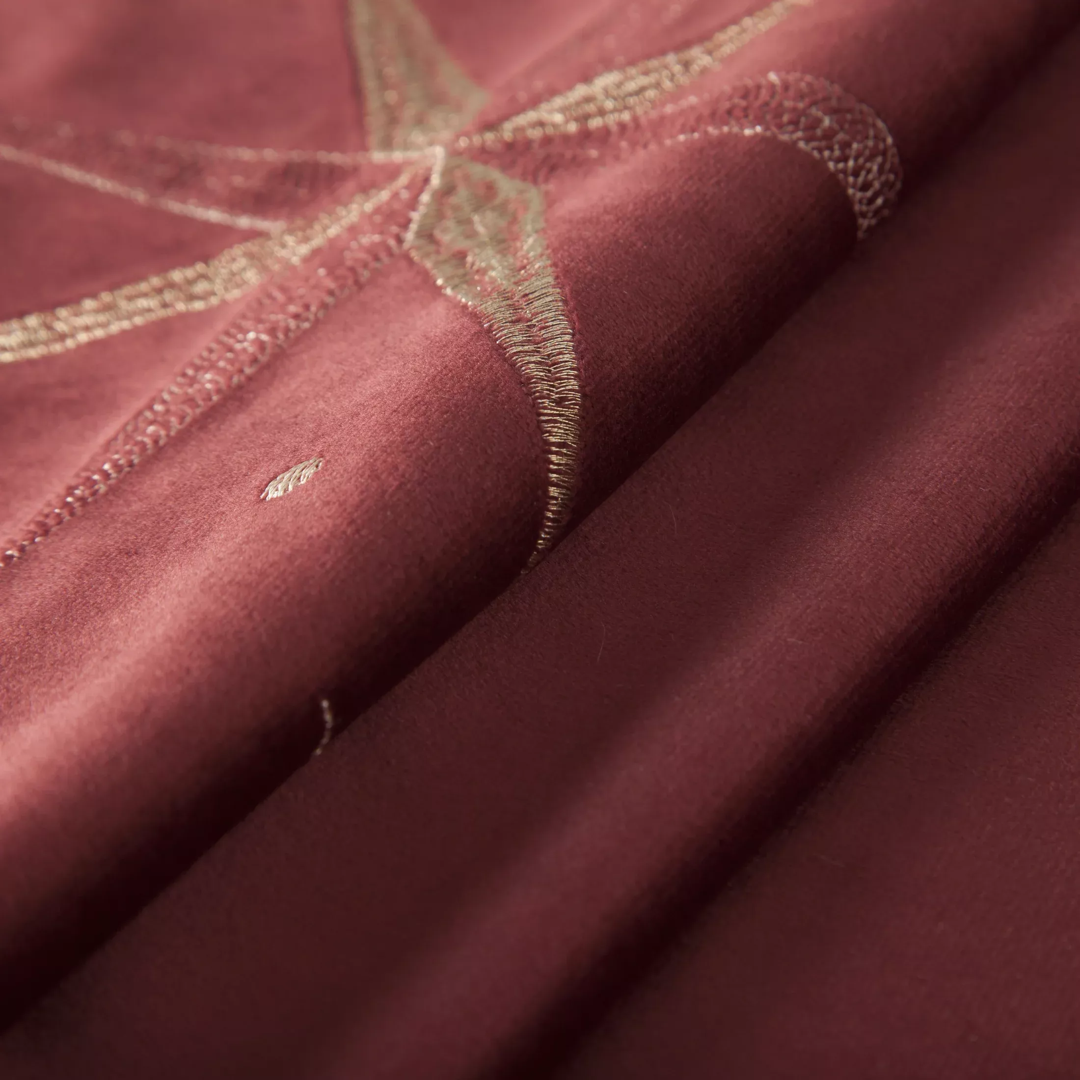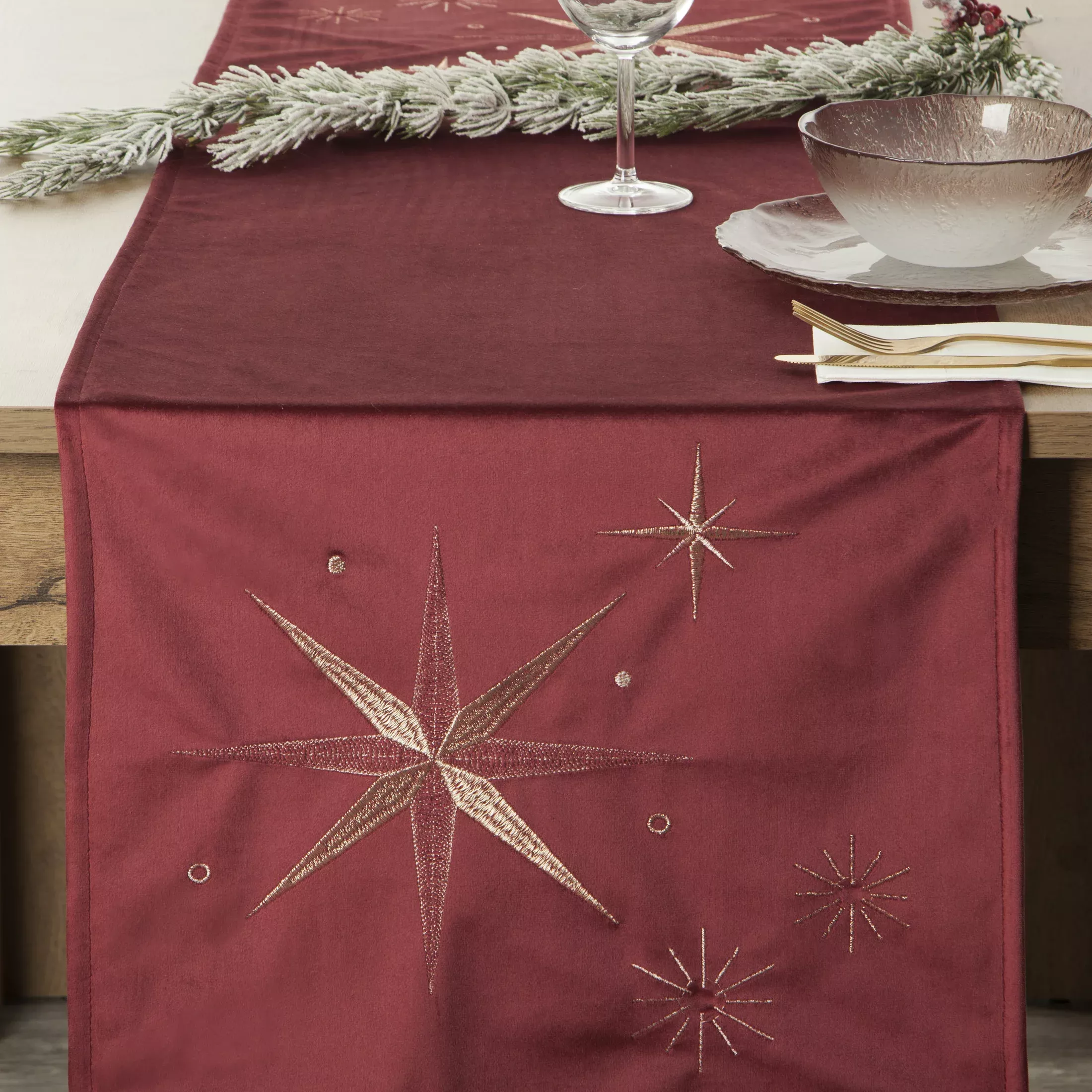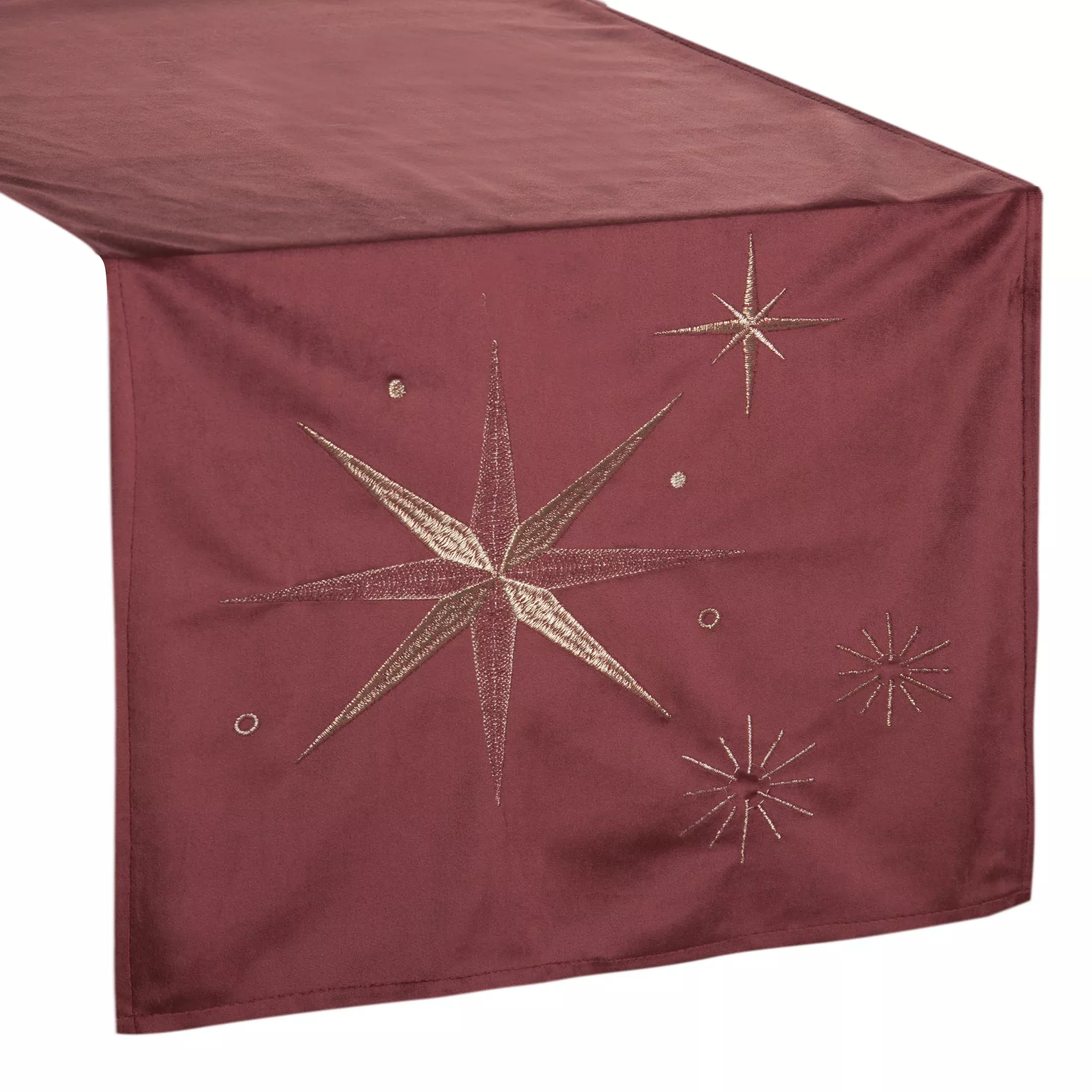 Dekorační stolní běhoun Christmas27, velvet - samet barvy bordó, dekorační výšivka v šampaňské barvě, velikost 40x140cm.