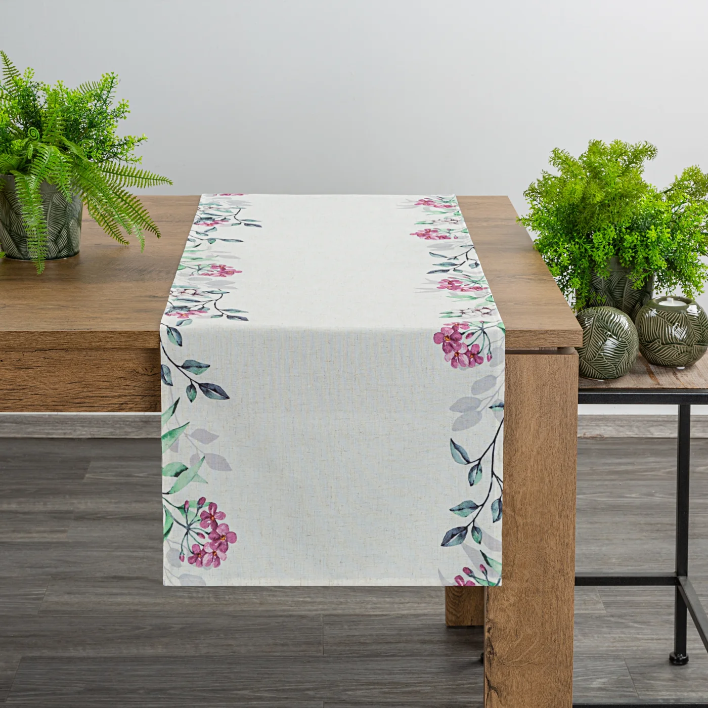 Stolní běhoun Natura7, květový stylizovaný motiv na světlém podkladu, směsová látka se lnem, velikost 40x180cm