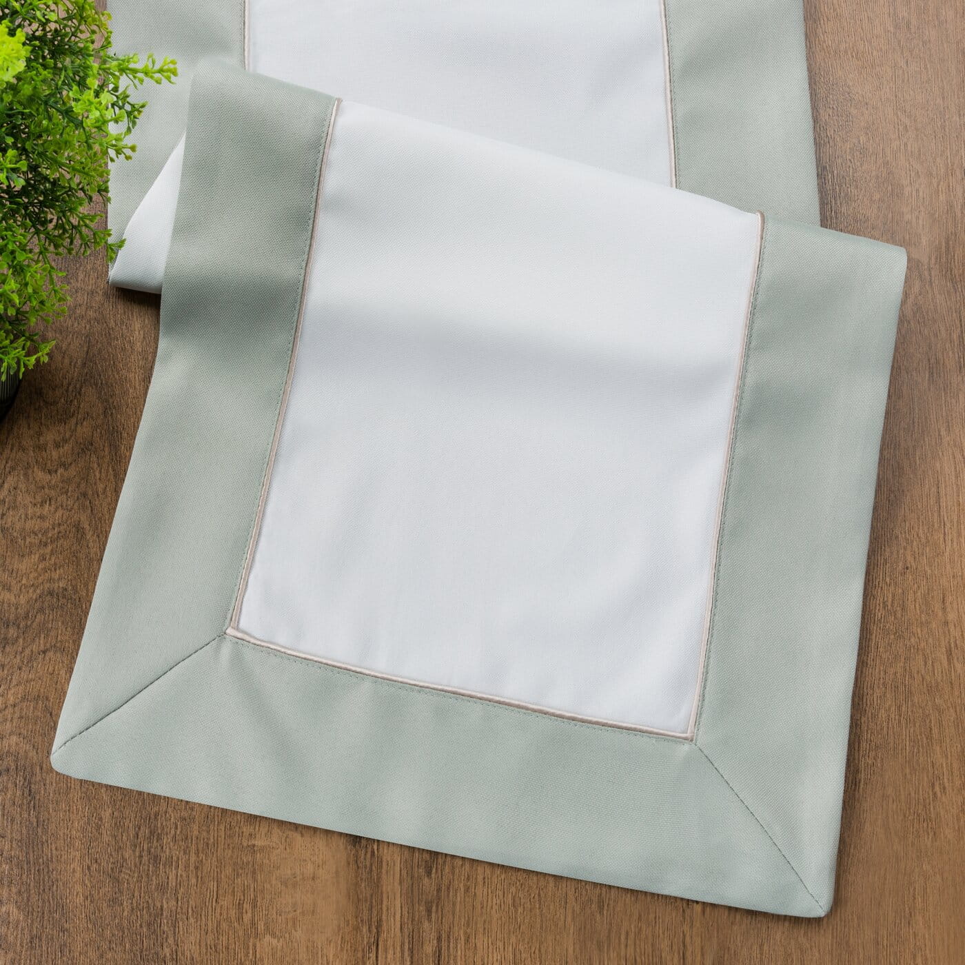 Stolní běhoun Sandi, široký lem v jemně olivové barvě, střed v přírodní světlé barvě, na rozhraní ozdobná béžová paspulka