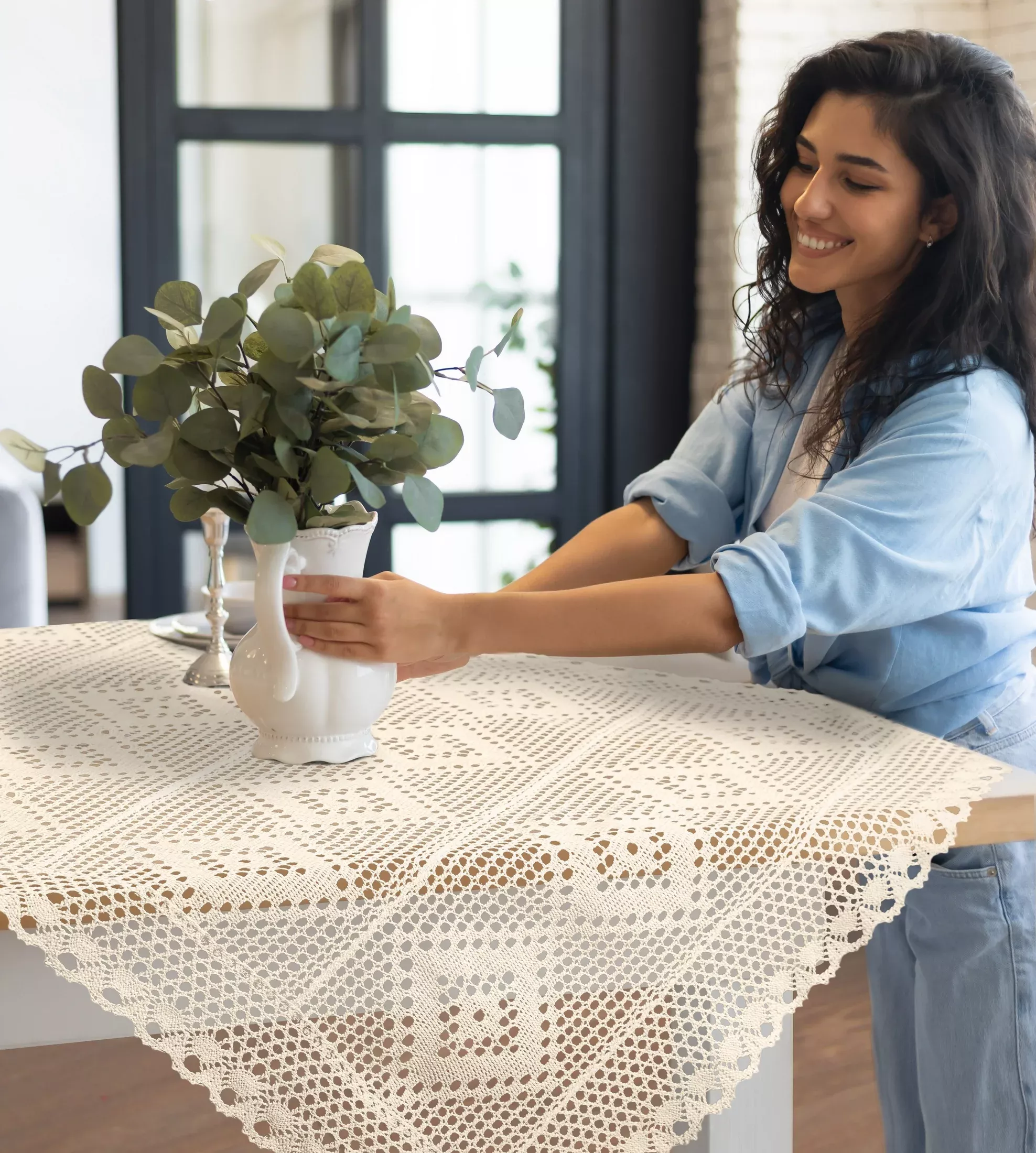 Stolní dekorační ubrus Olivia SB, romantický rustikální boho styl, imitace háčkování, velikost 85x85cm, barva světle béžová.
