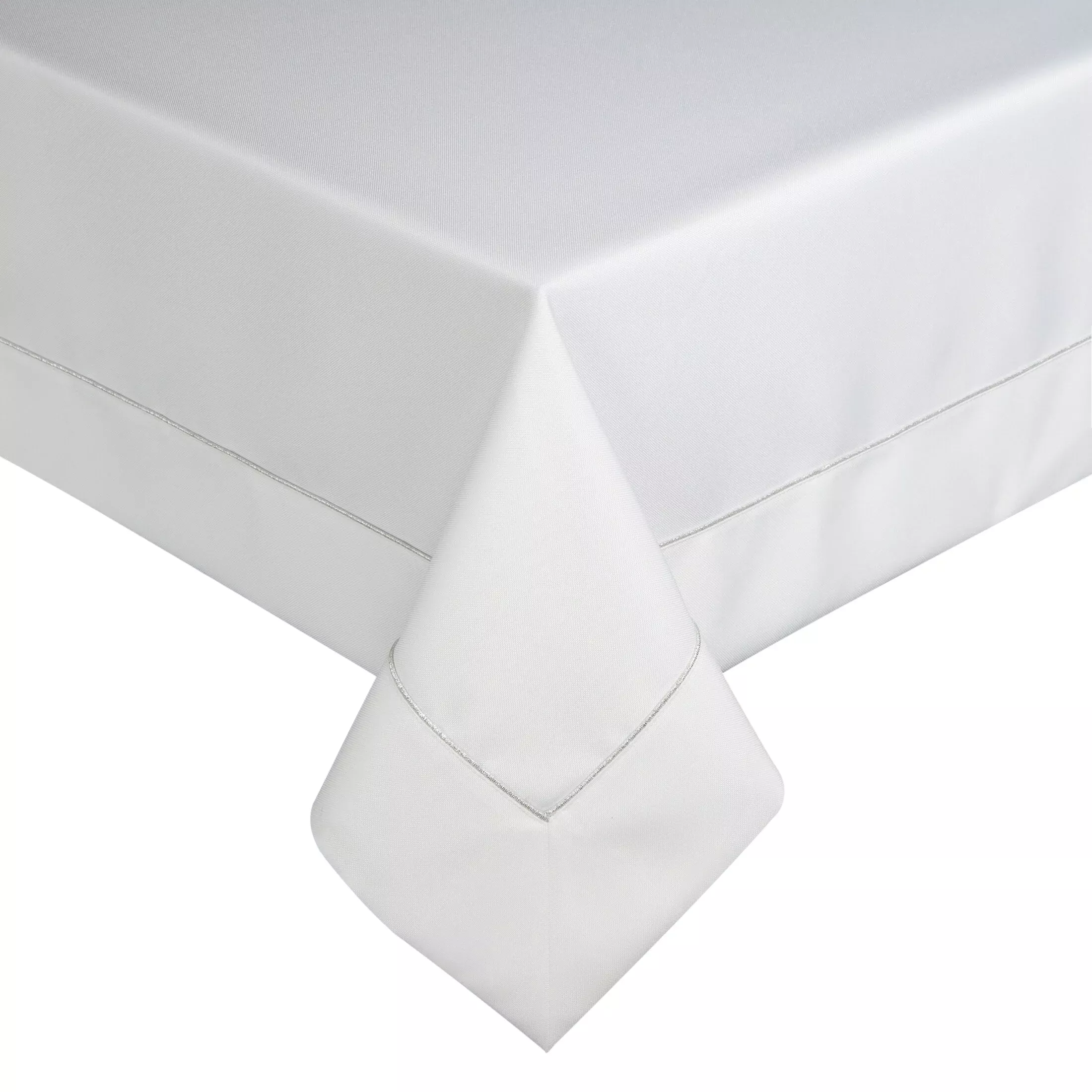 Ubrus Madele, bílá látka + stříbrná paspulková lišta po obvodu, látka s jemně viditelnou strukturou, elegantní široký lem, velikost 140x180cm.