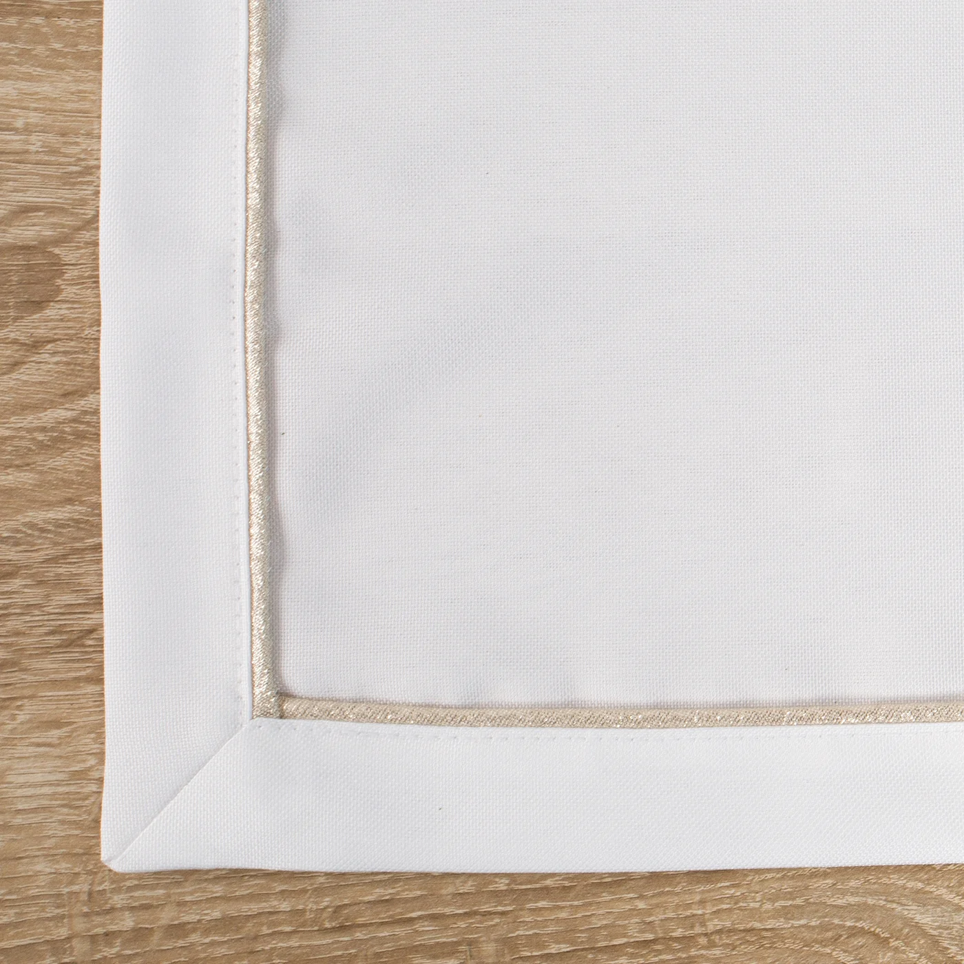 Ubrus Madele, bílá látka + zlatavá paspulková lišta po obvodu, látka s jemně viditelnou strukturou, elegantní široký lem, velikost 140x180cm.