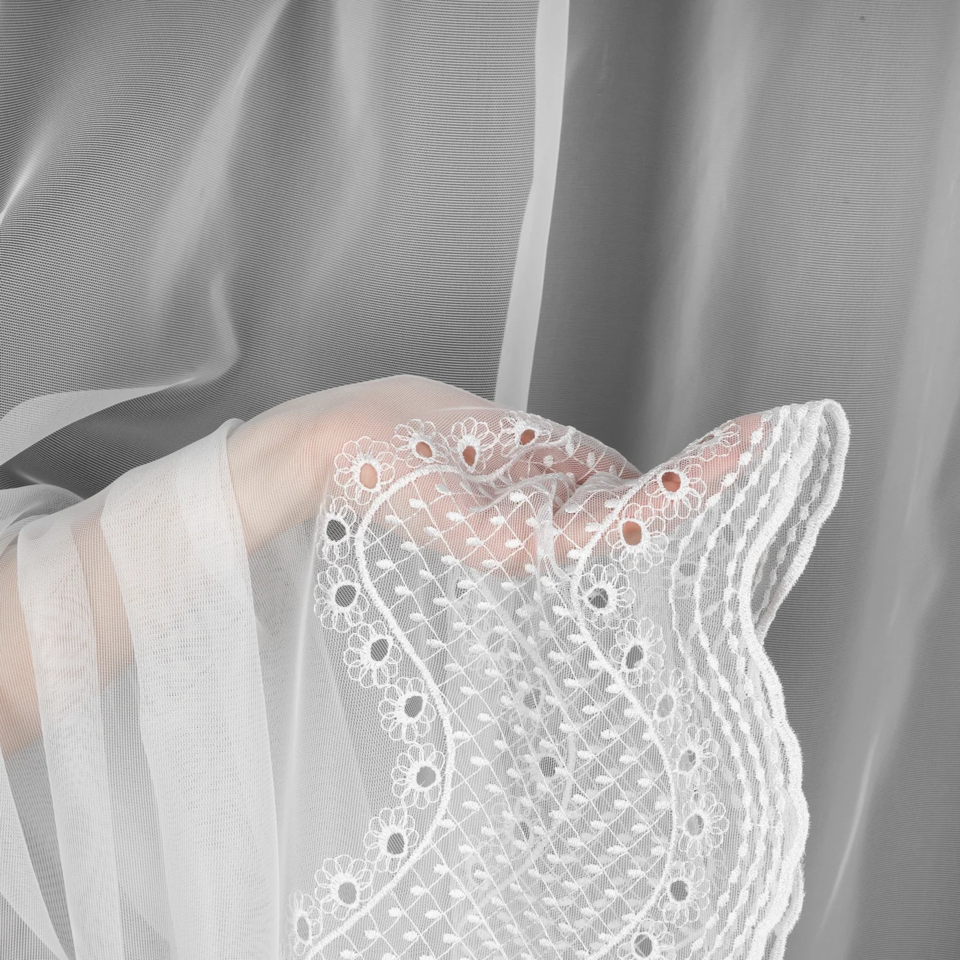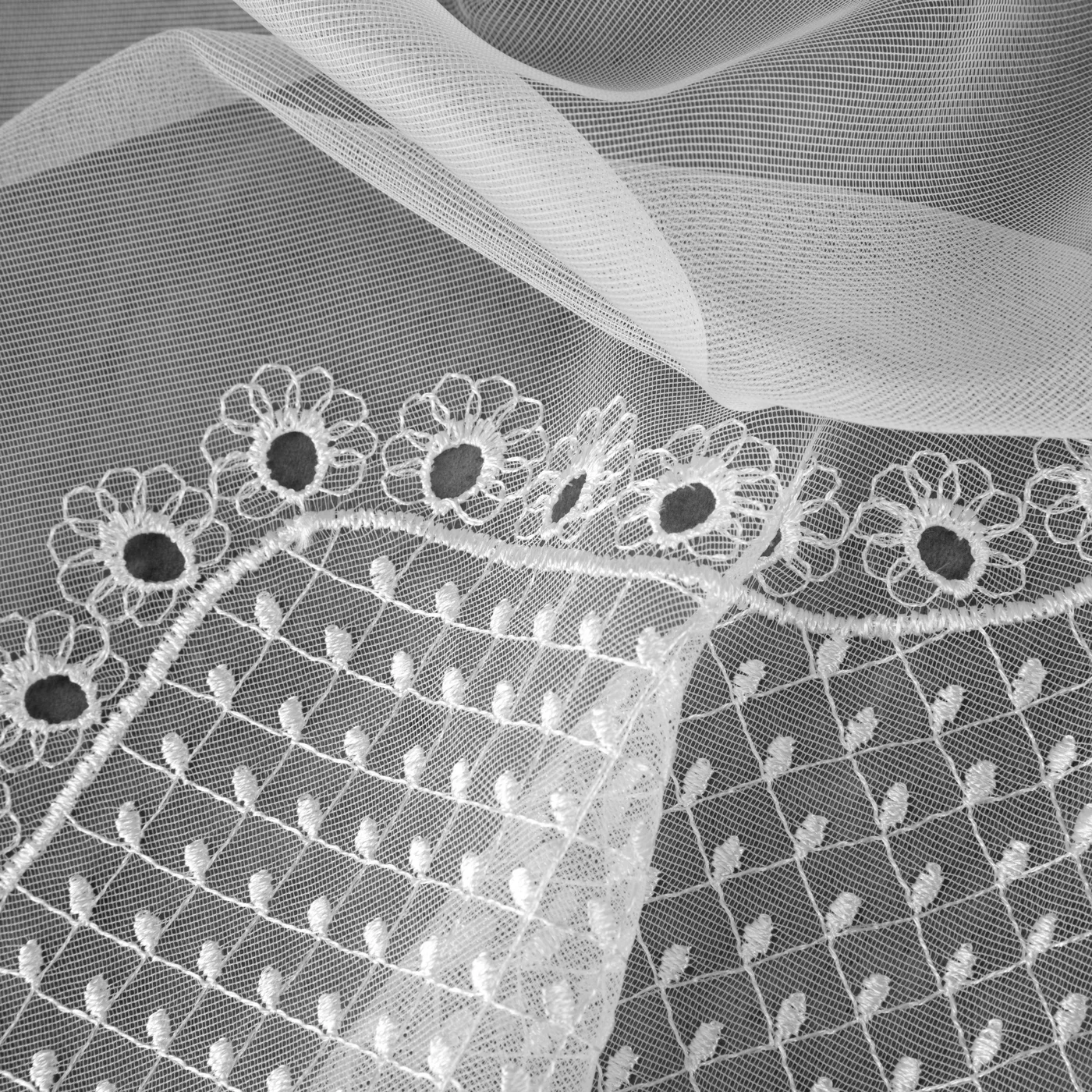 Záclona F15559, bílá matná látka typ peru, dole ažurová výšivka, šití na míru