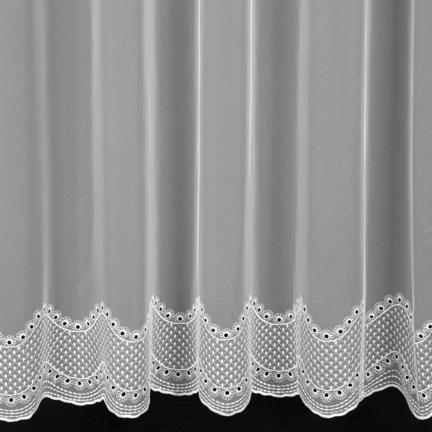 Záclona na míru F15559, záclonovina typu peru, dole ažurová výšivka, barva bílá