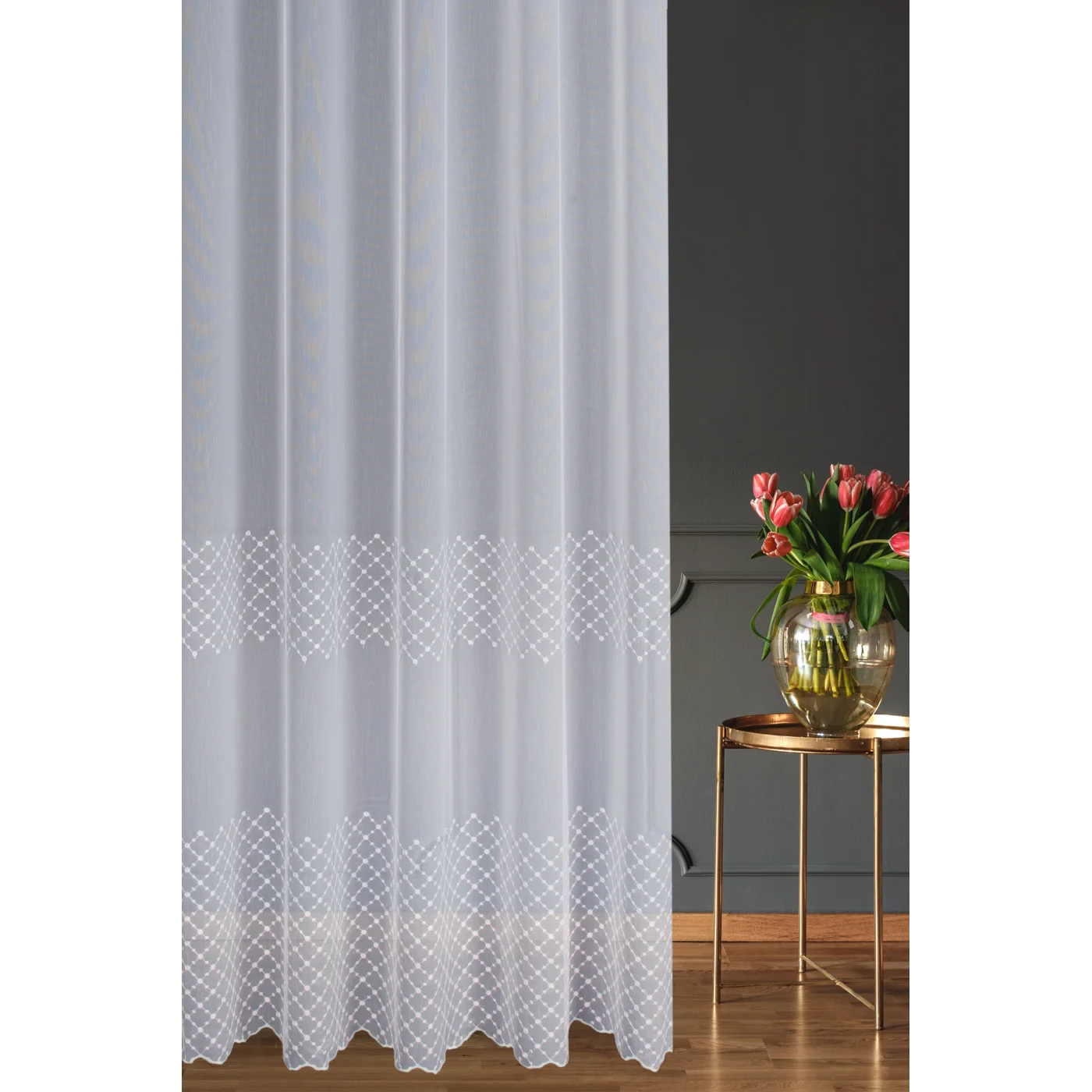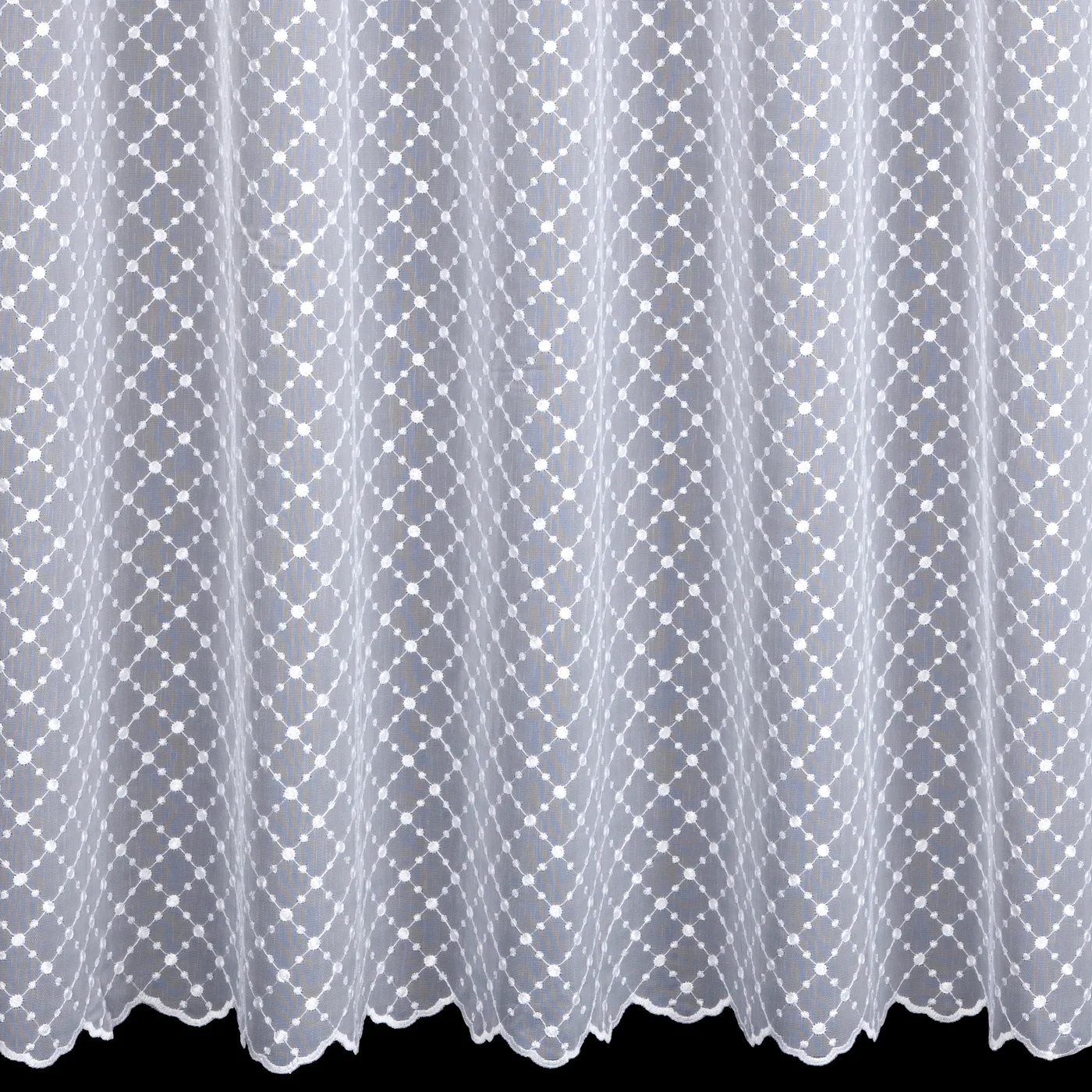 Záclona F16045, bílá, výšivka geometrický vzor ve 2 pruzích, šití na míru