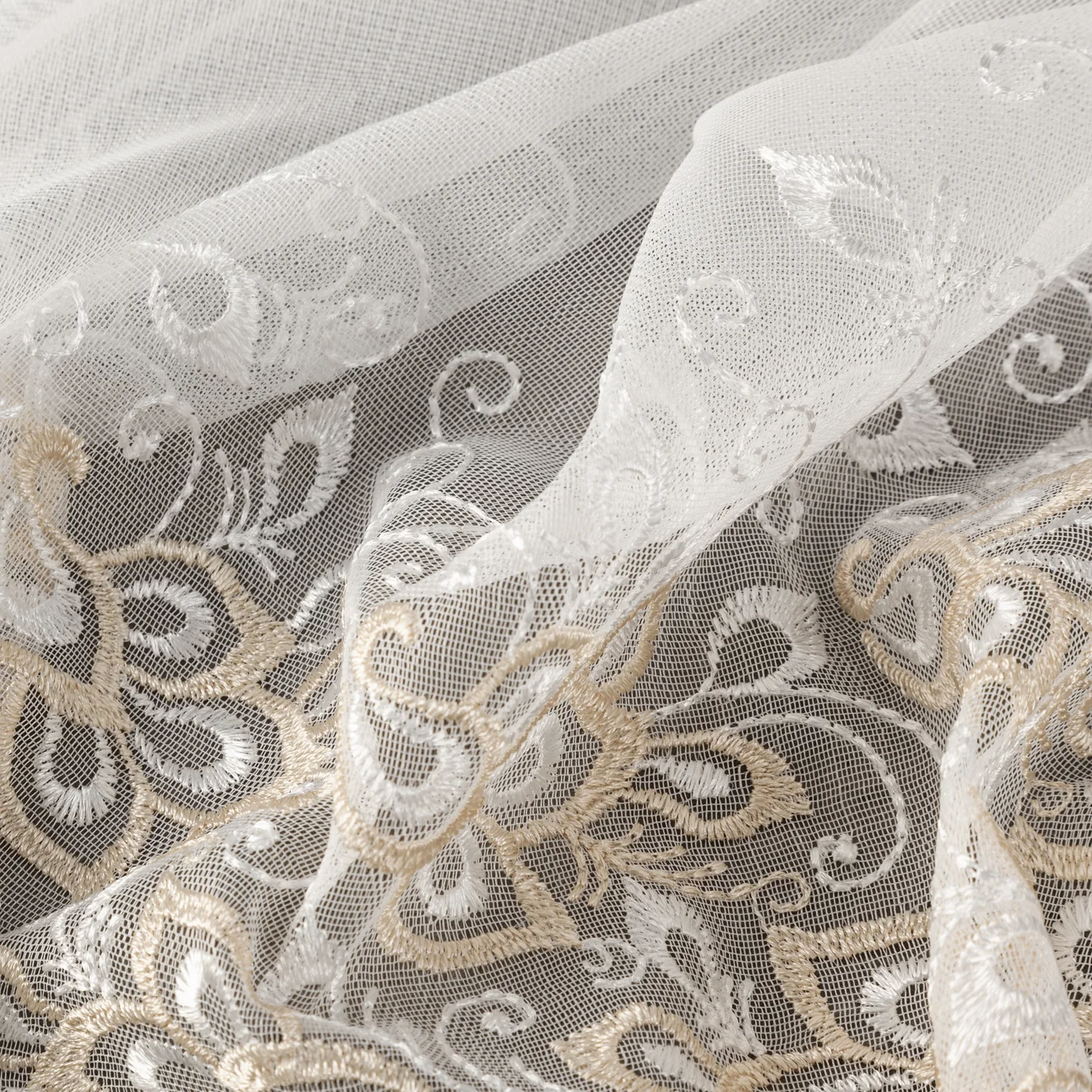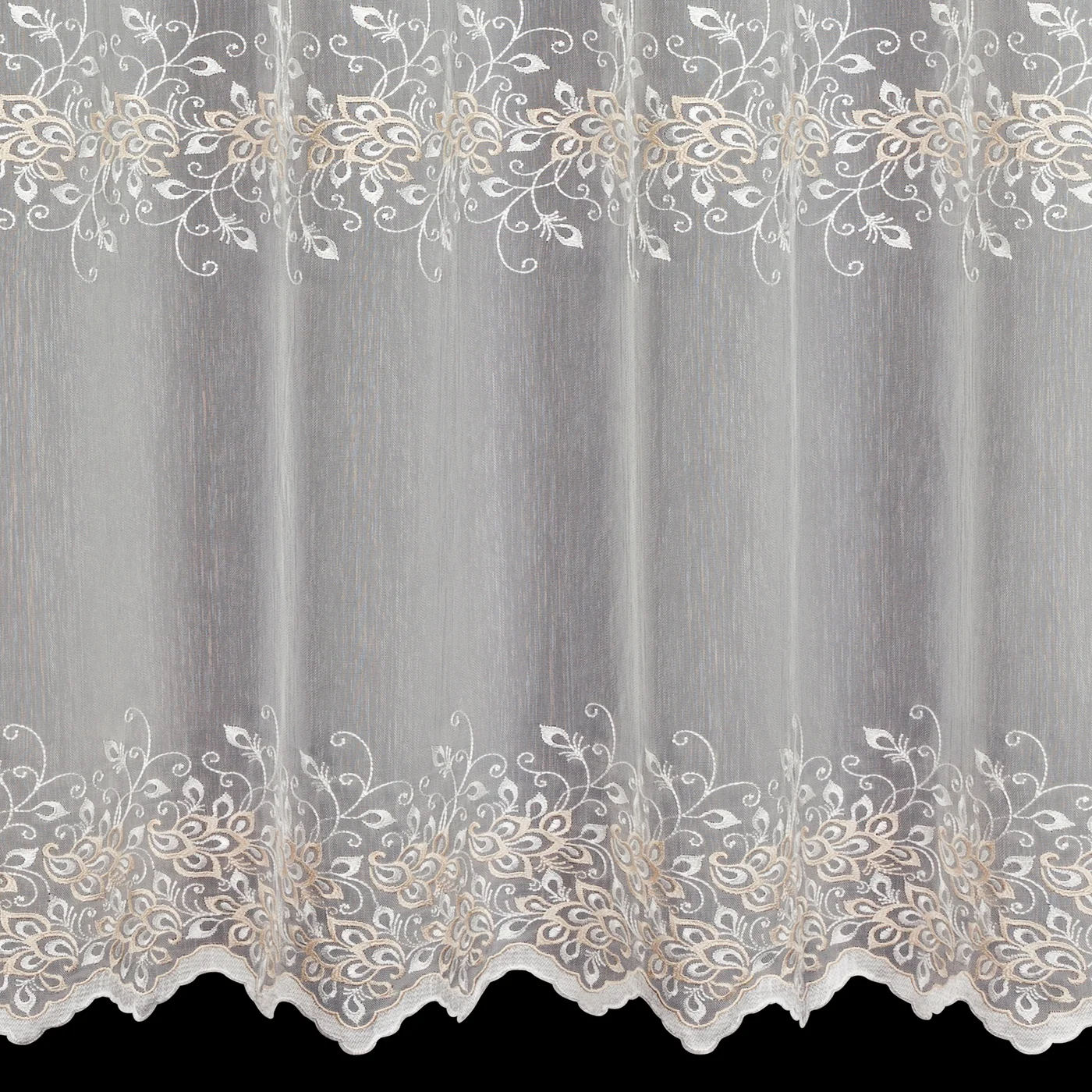 Záclona na míru F28015B, typ Aden, krémová, romantická ornamentová dvoubarevná výšivka ve 2 pásech