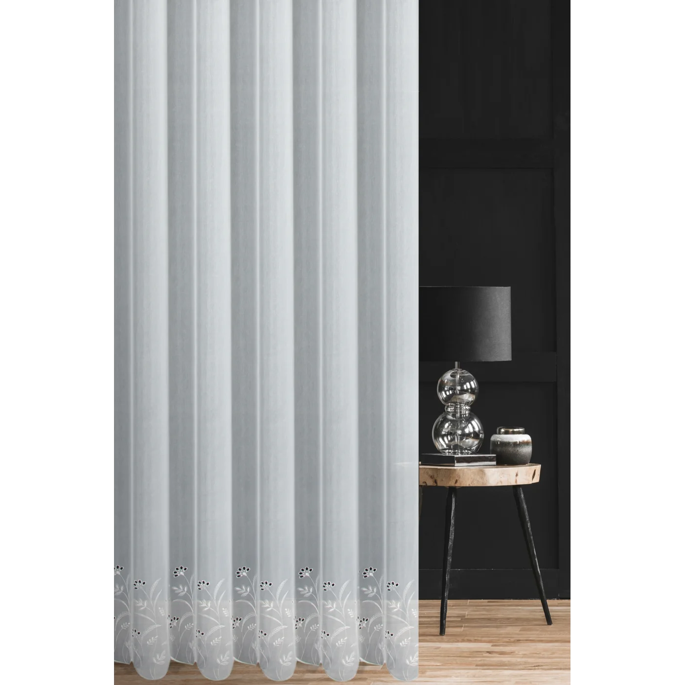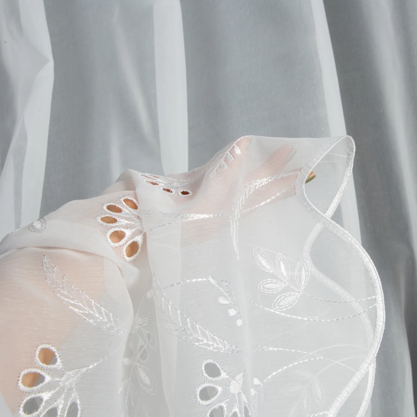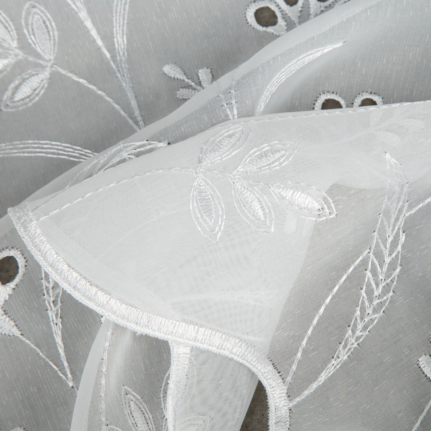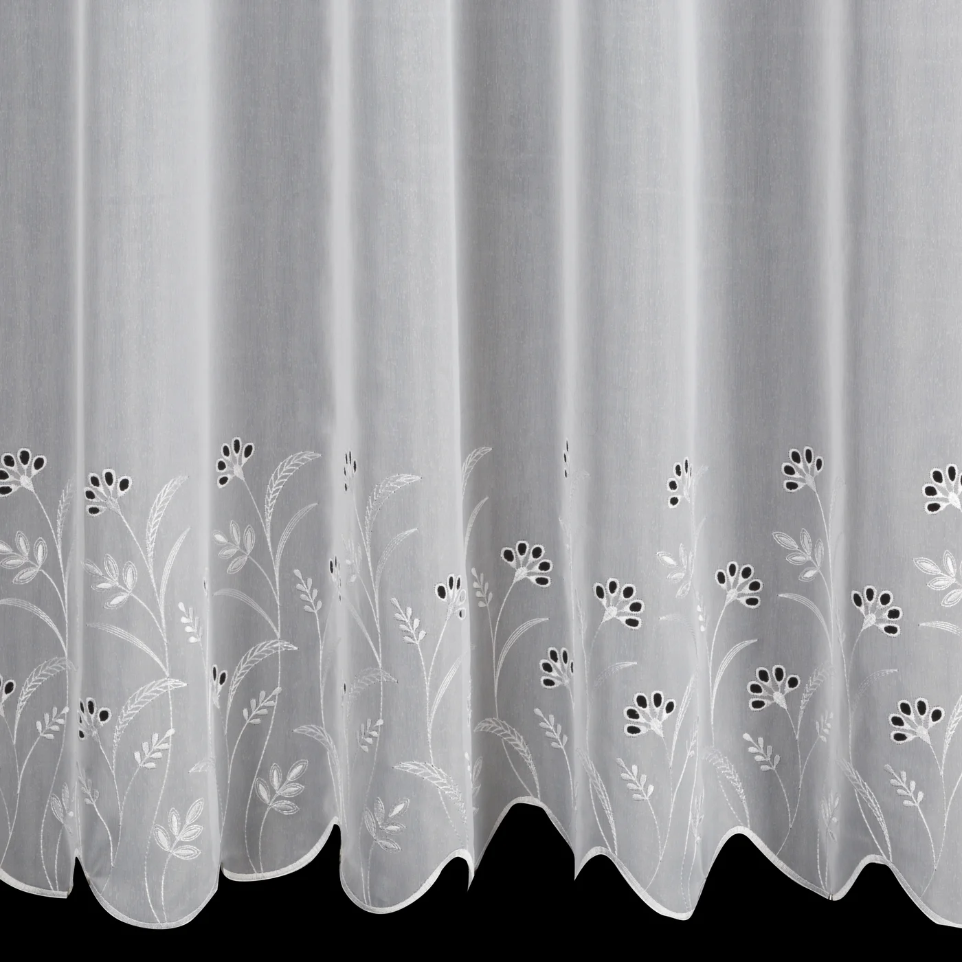 Záclona na míru F33849, matná záclonovina s ažurovou výšivkou přírodním motivem v dolní části
