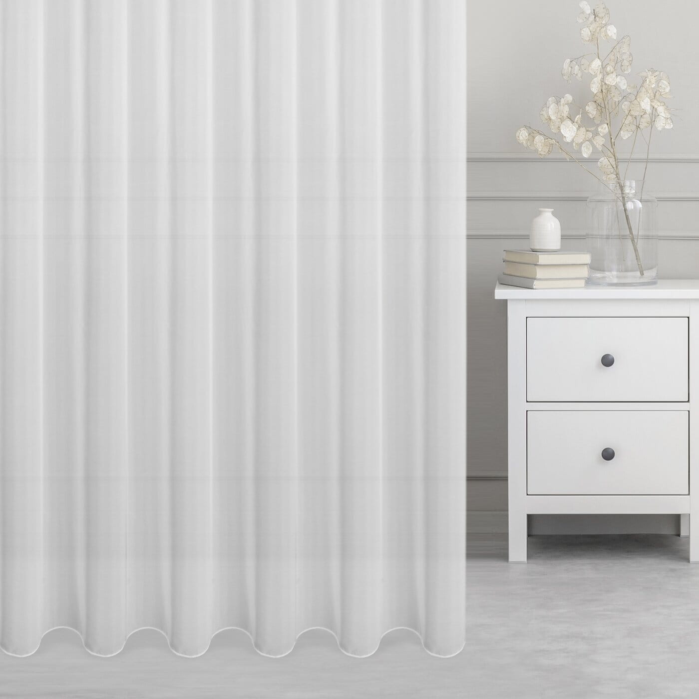 Záclona Firia370, šití na míru, XXL výška až 355cm, jakostní matný bílý voál, dole se zátěžovým stehem