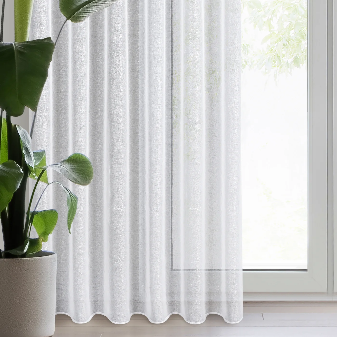 Látka je hustěji tkaná, lze tak záclonu použít i do silně nasluněných oken