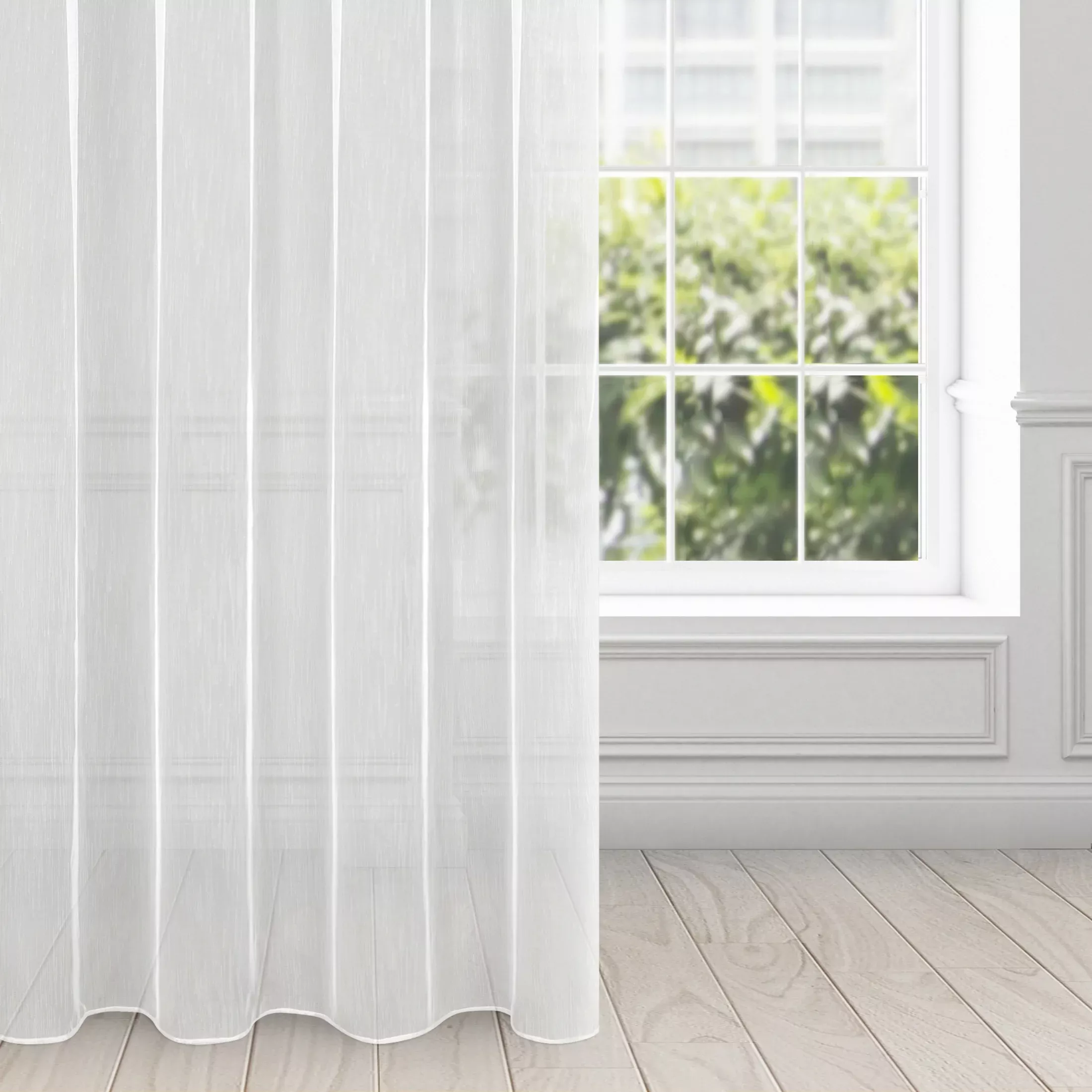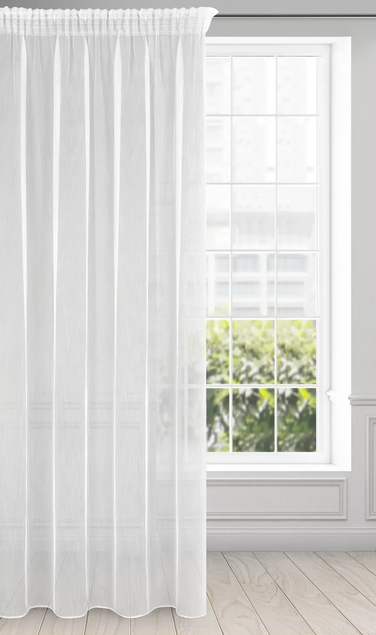 Záclona Nicea, elegantní bílá záclona, vzor deštíku, velikost 140x270cm, řasící páska, lze zkrátit
