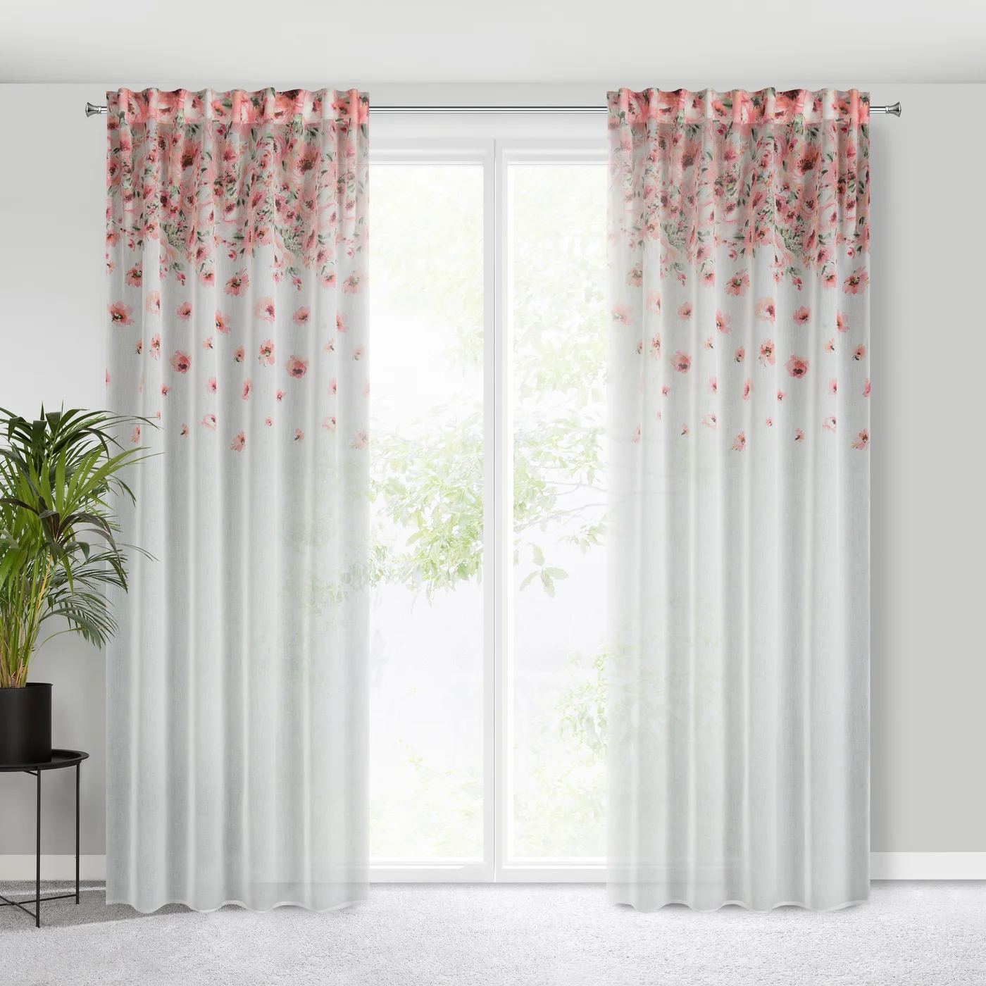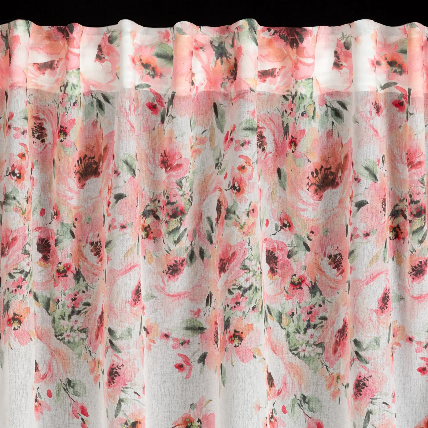 Záclona Olivia - bílá hustší etamína, v horní části potisk růžovými květy
