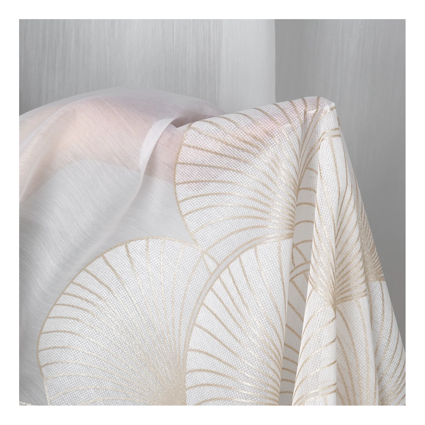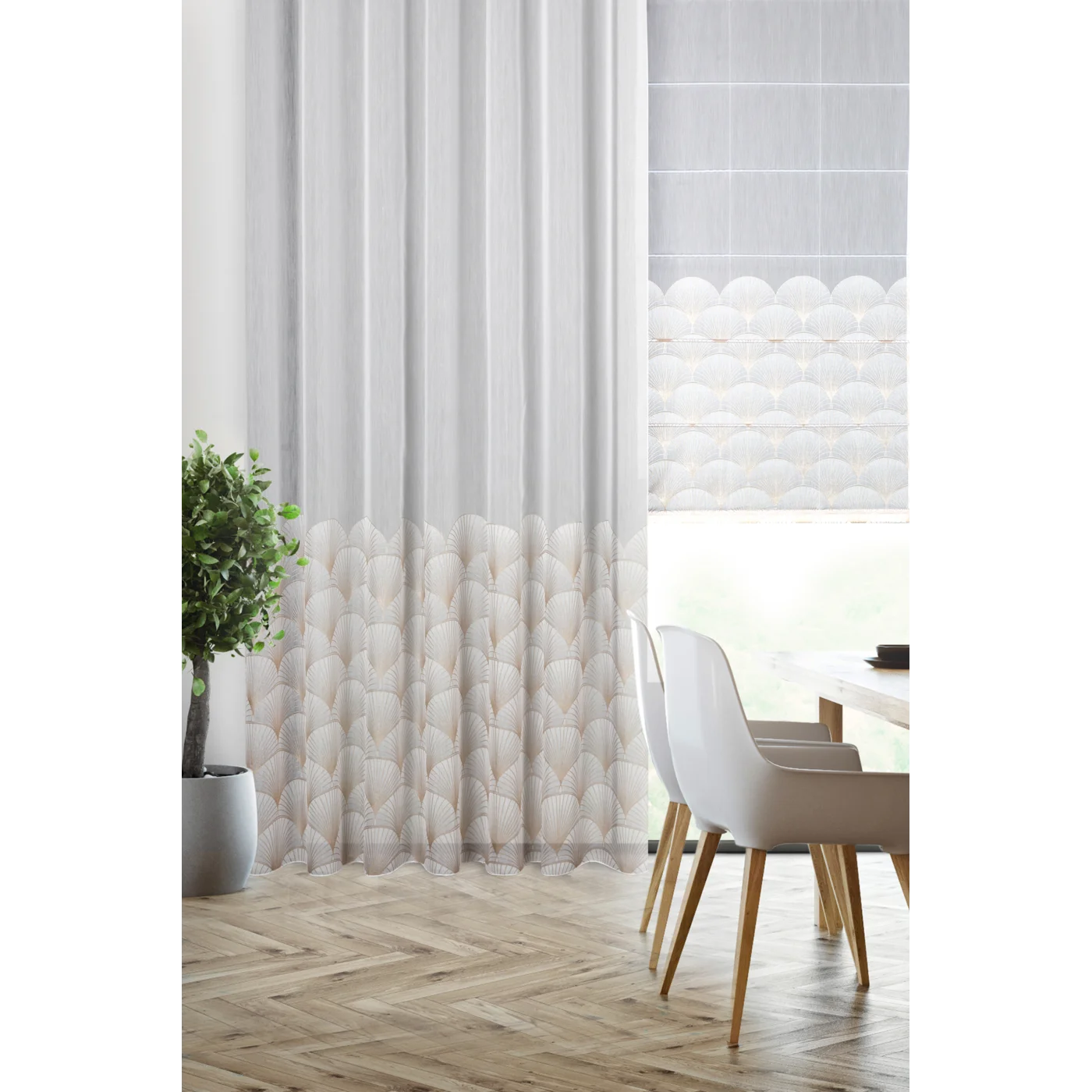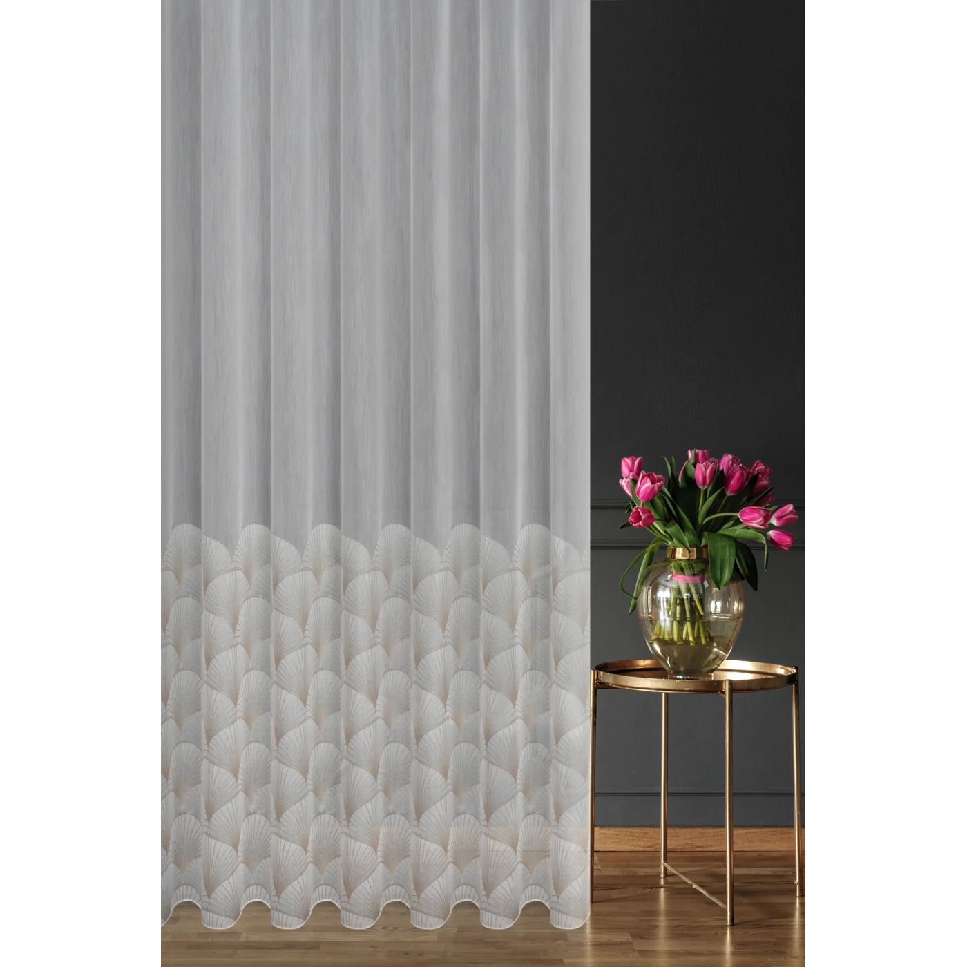 Záclona Rabi3, šití na míru, matný bílý batist, dolní část se zlatavým potiskem ve stylu Art Deco, dole zátěžový steh