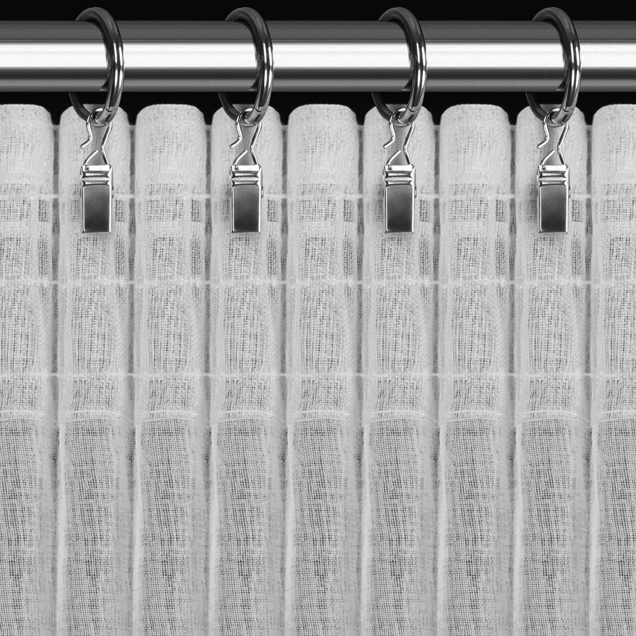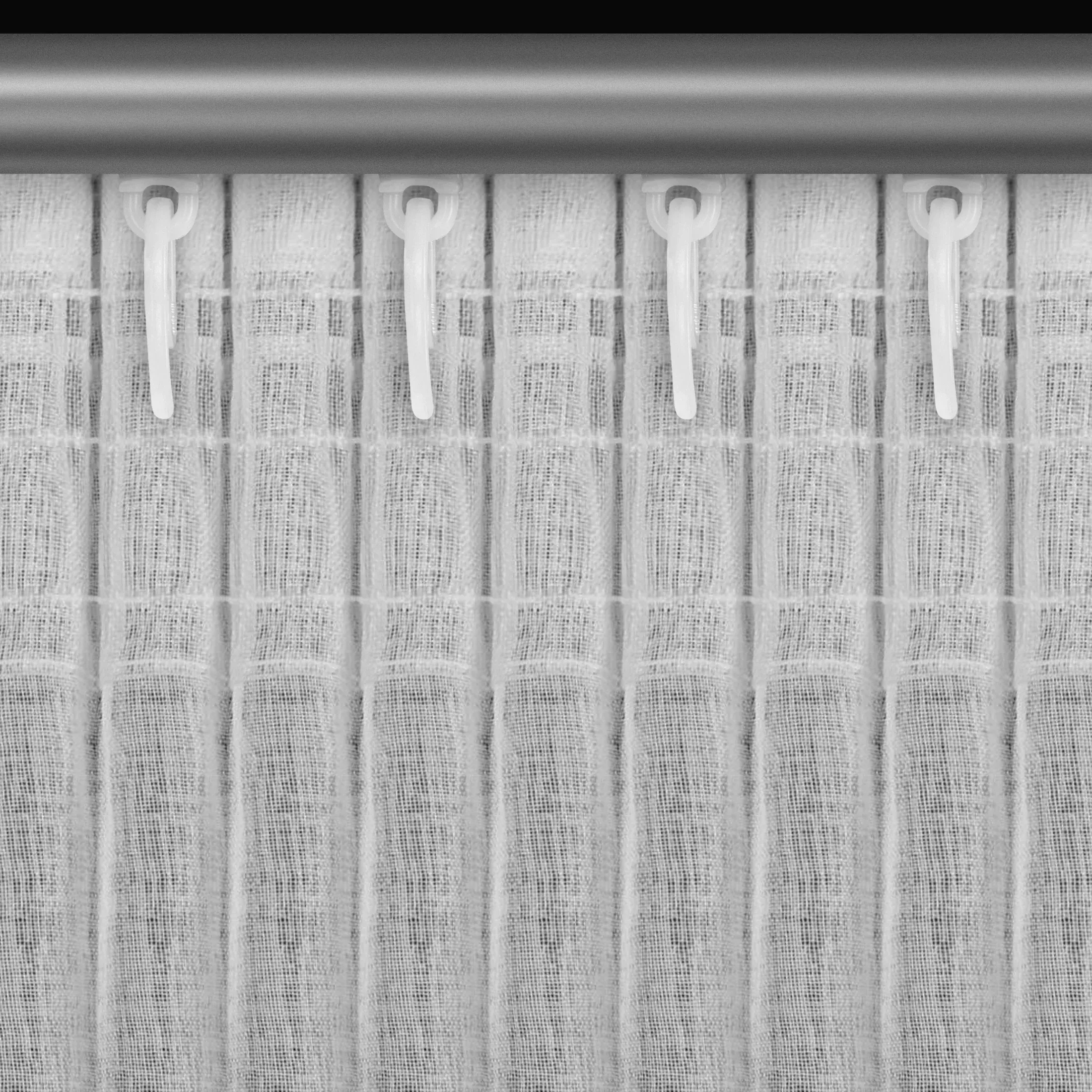 | Zavěšení | za stužky řasící pásky na háčky na garnýži, na háčky na stropní kolejničce, shora za okraj pásky žabkami, přímo na garnýžovou tyč do tunýlku za páskou |