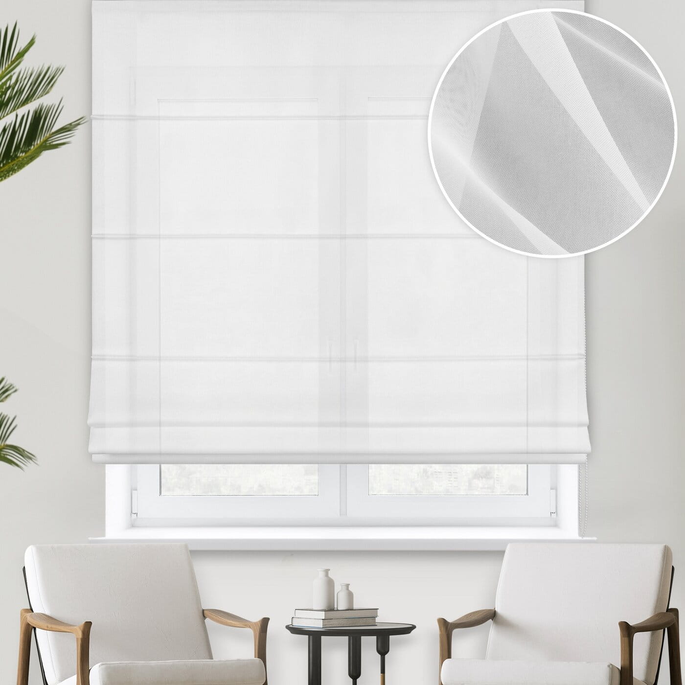 Záclonová římská roleta Left, bílý voál, bez vzoru, šití na míru