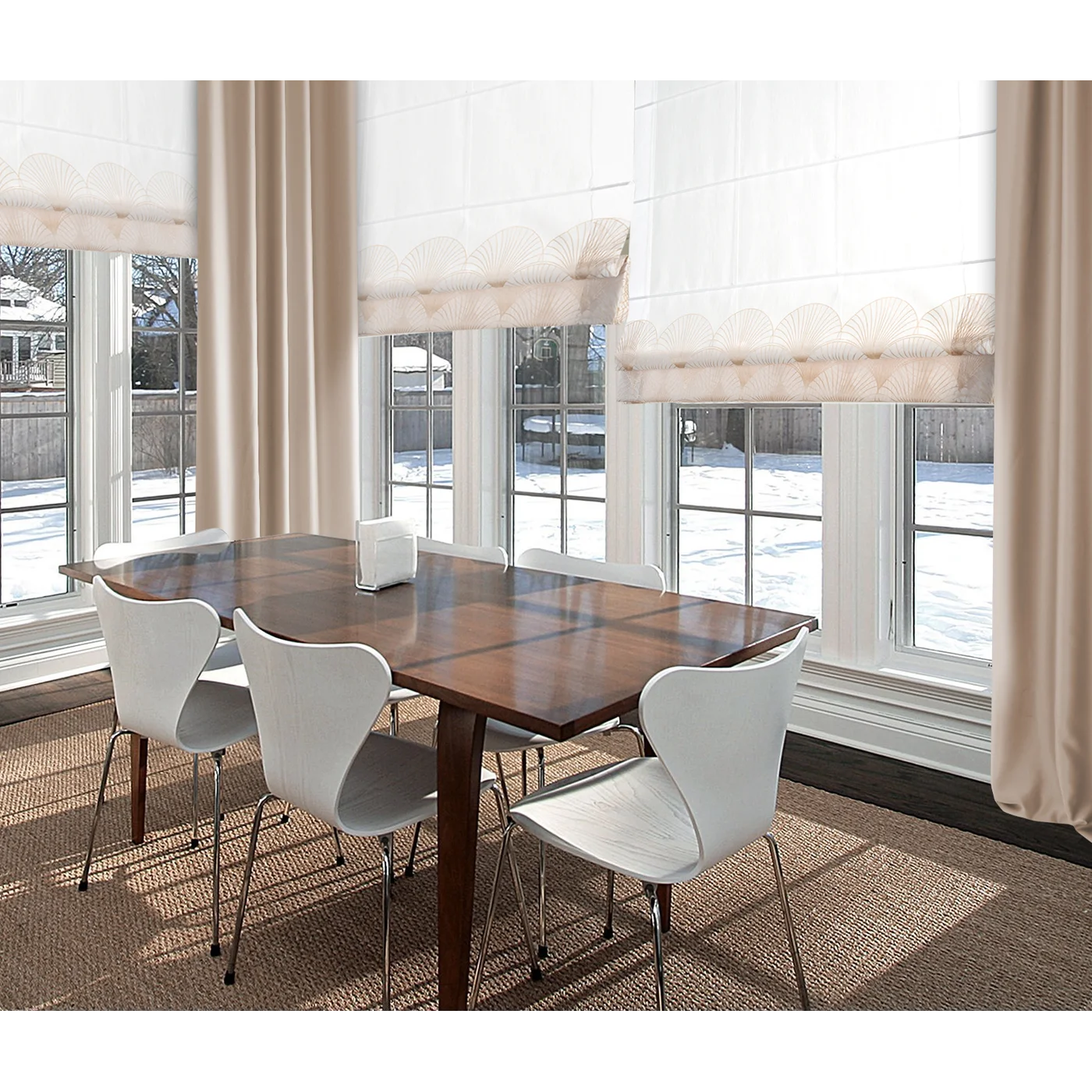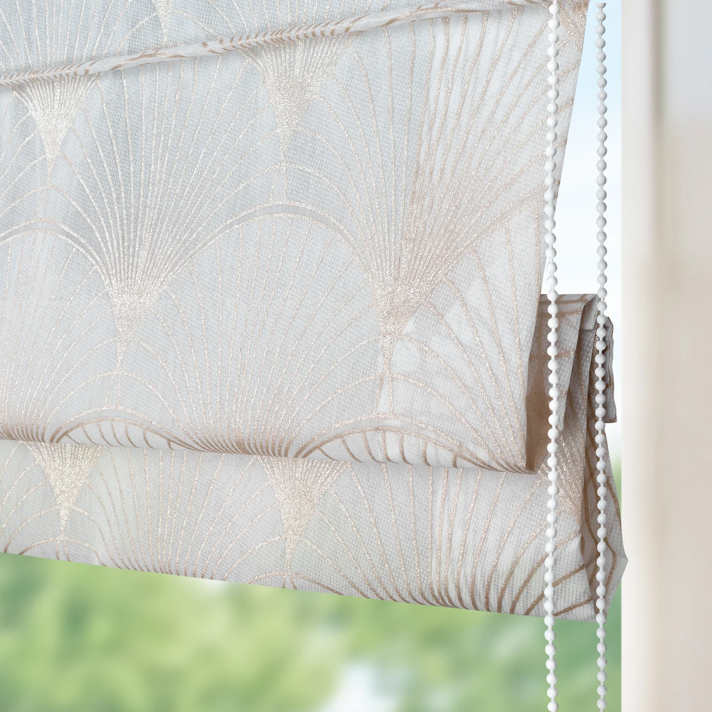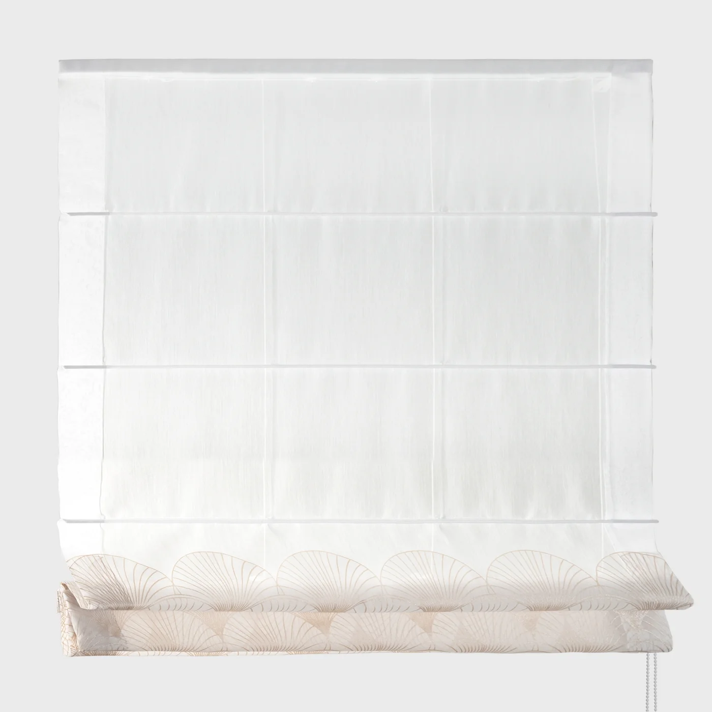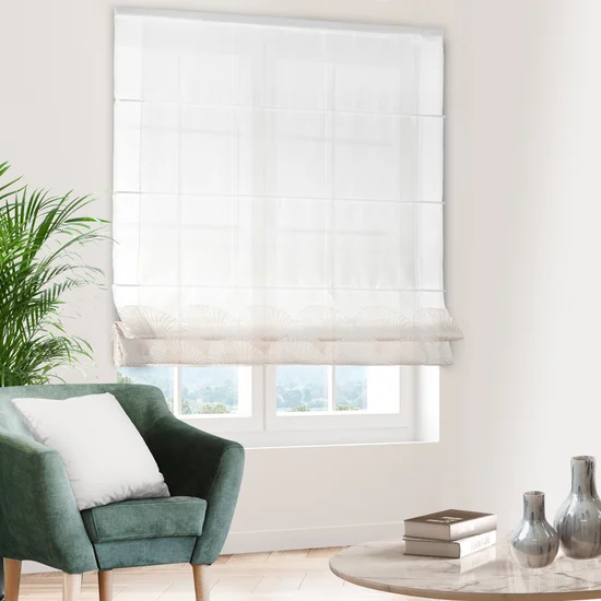 Římská roleta na míru Rabi3, matný bílý batist, dolní část se zlatavým vzorem Art Deco.