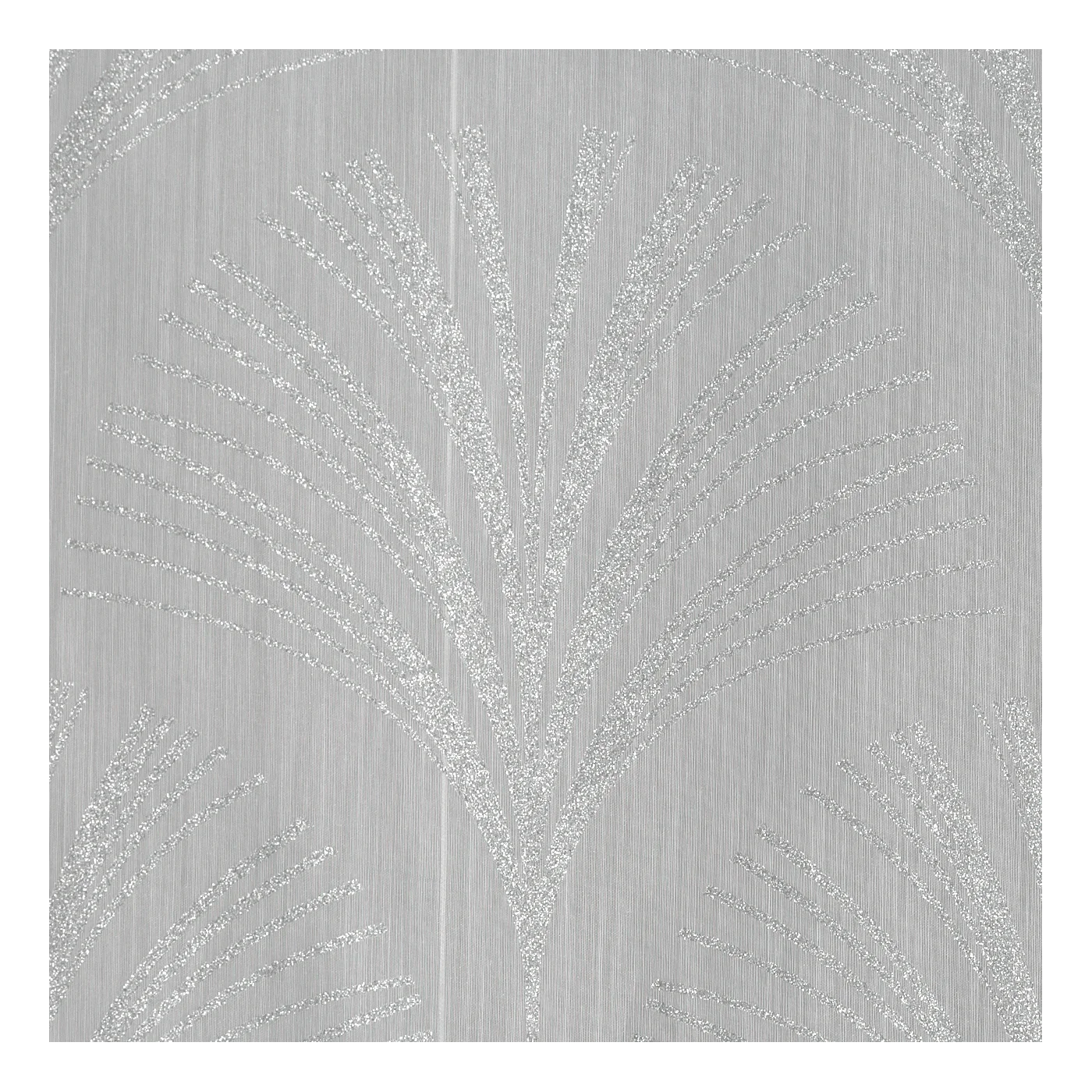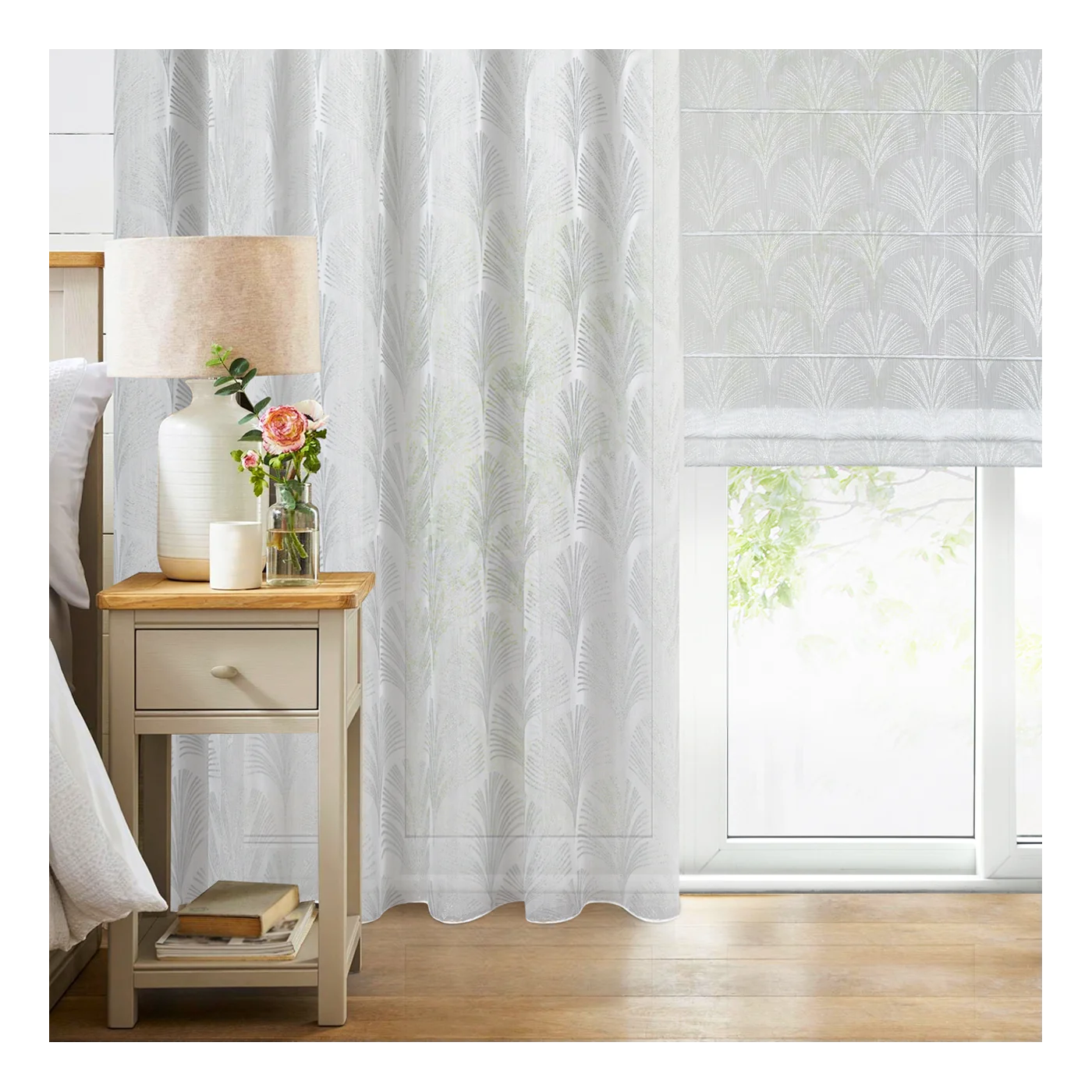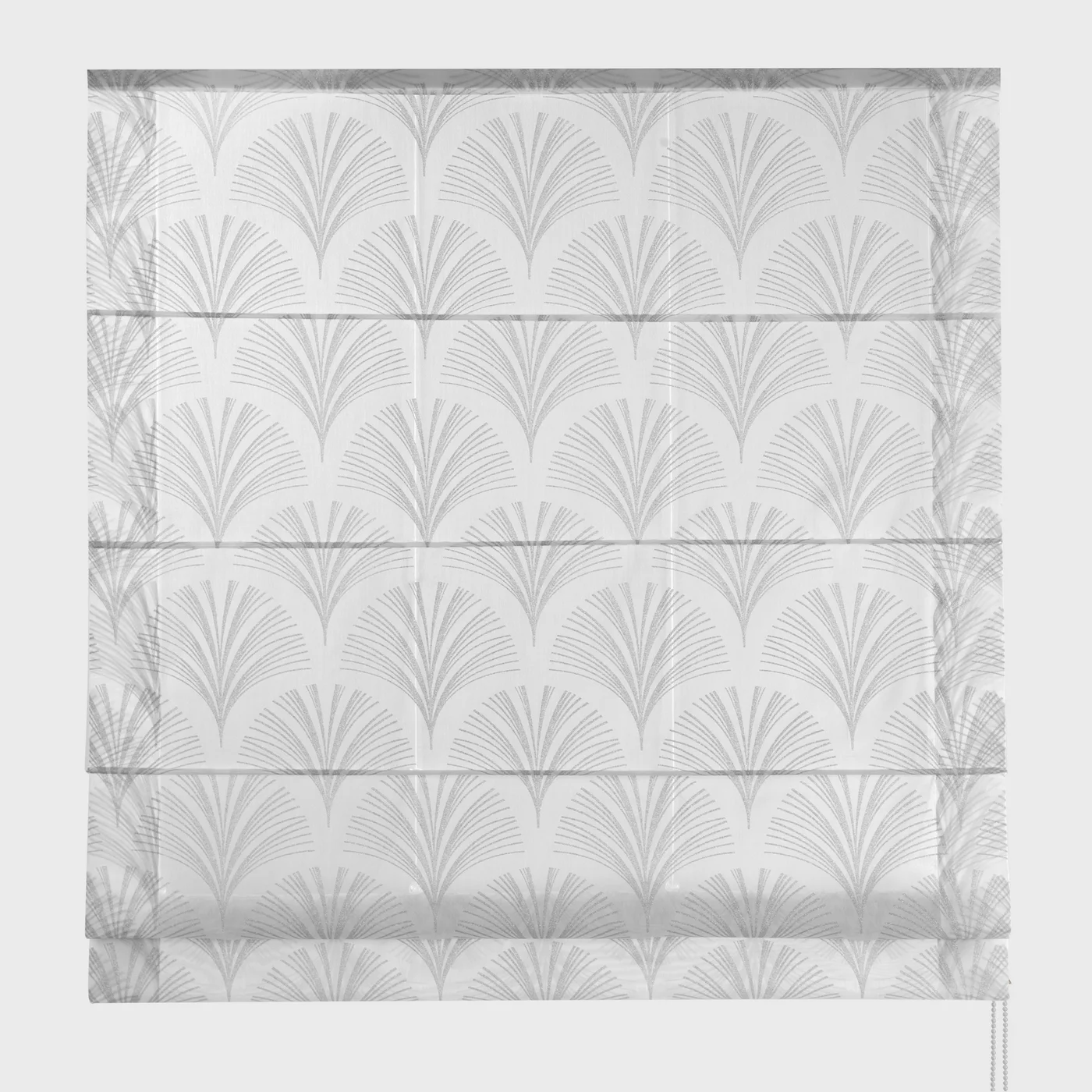 Záclonová římská roleta Rabi8, matný bílý batist, stříbřitý potisk styl Art Deco, šití na míru