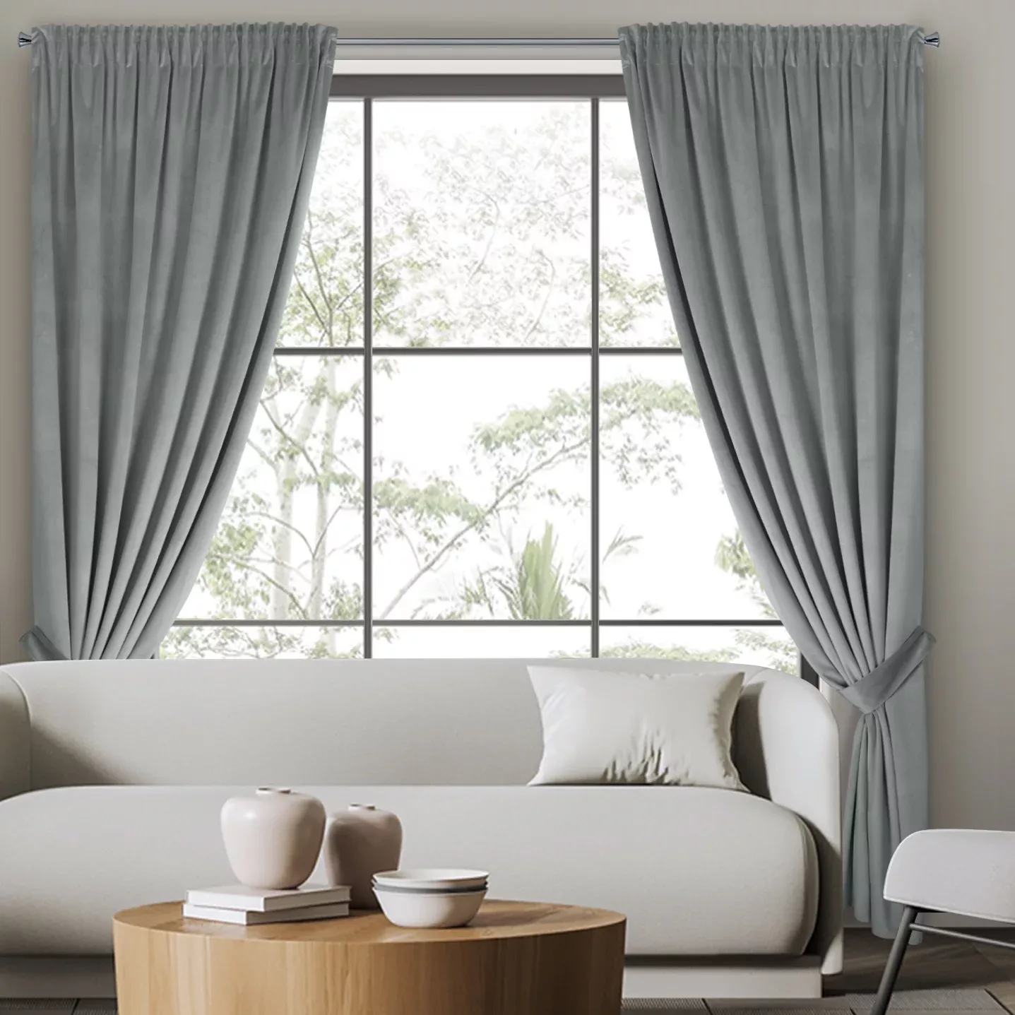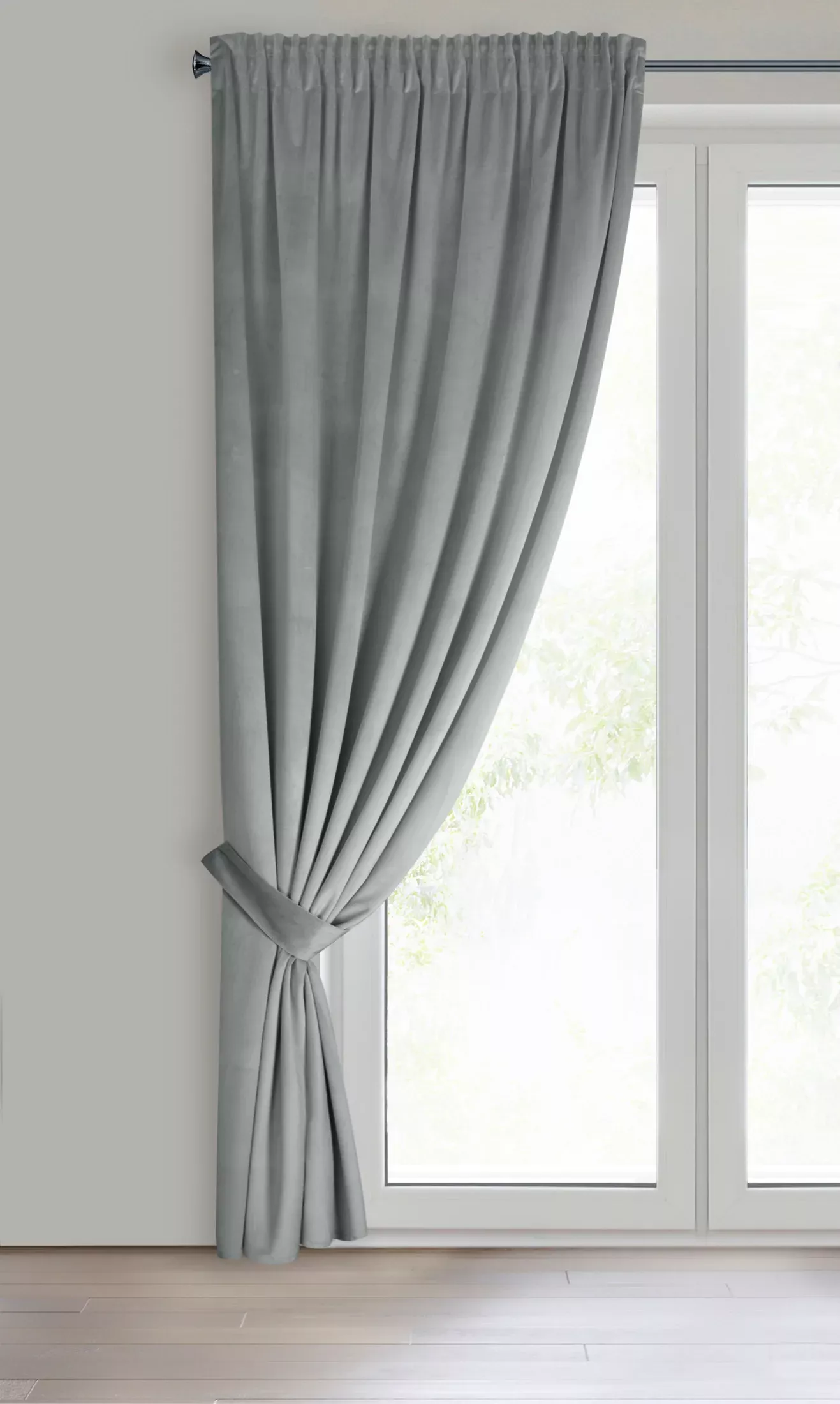 Závěs Antara, komplet s vázačkou pro boční upnutí, látka příjemný velvet, barva světle šedá, univerzální řasící páska s možností tunýlku