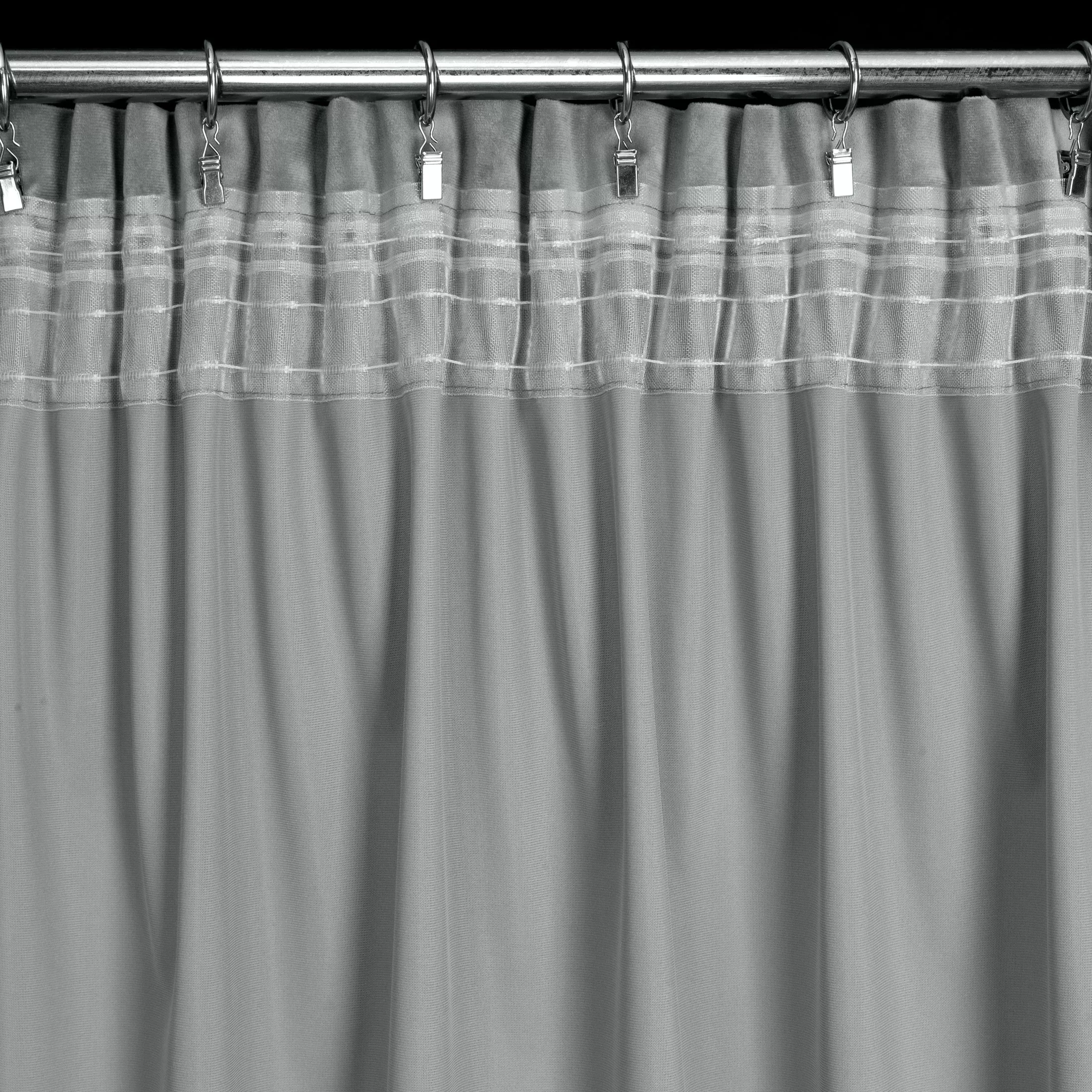 | Zavěšení | za stužky řasící pásky na háčky na garnýži, na háčky na stropní kolejničce, shora za okraj pásky žabkami, přímo na garnýžovou tyč do tunýlku za páskou |