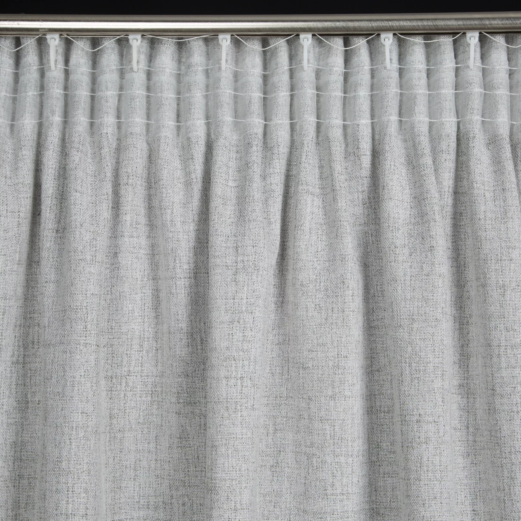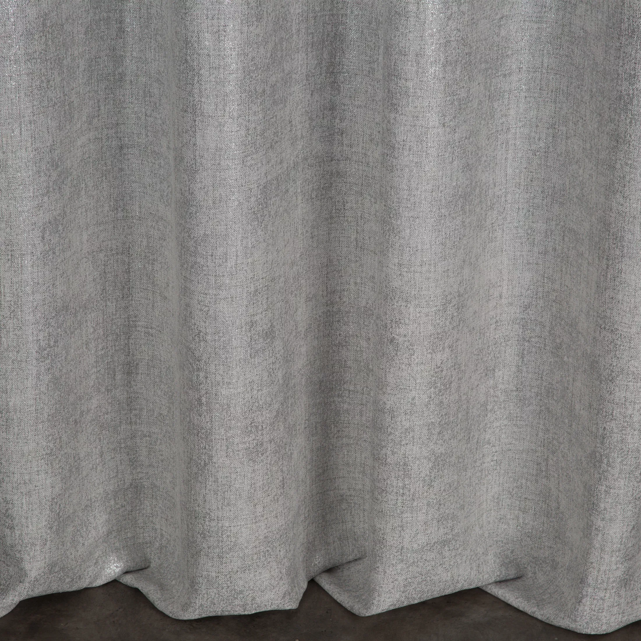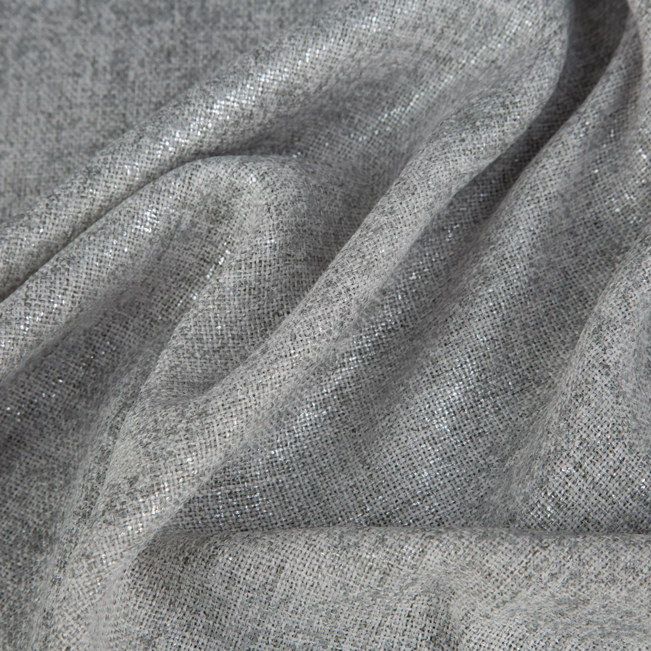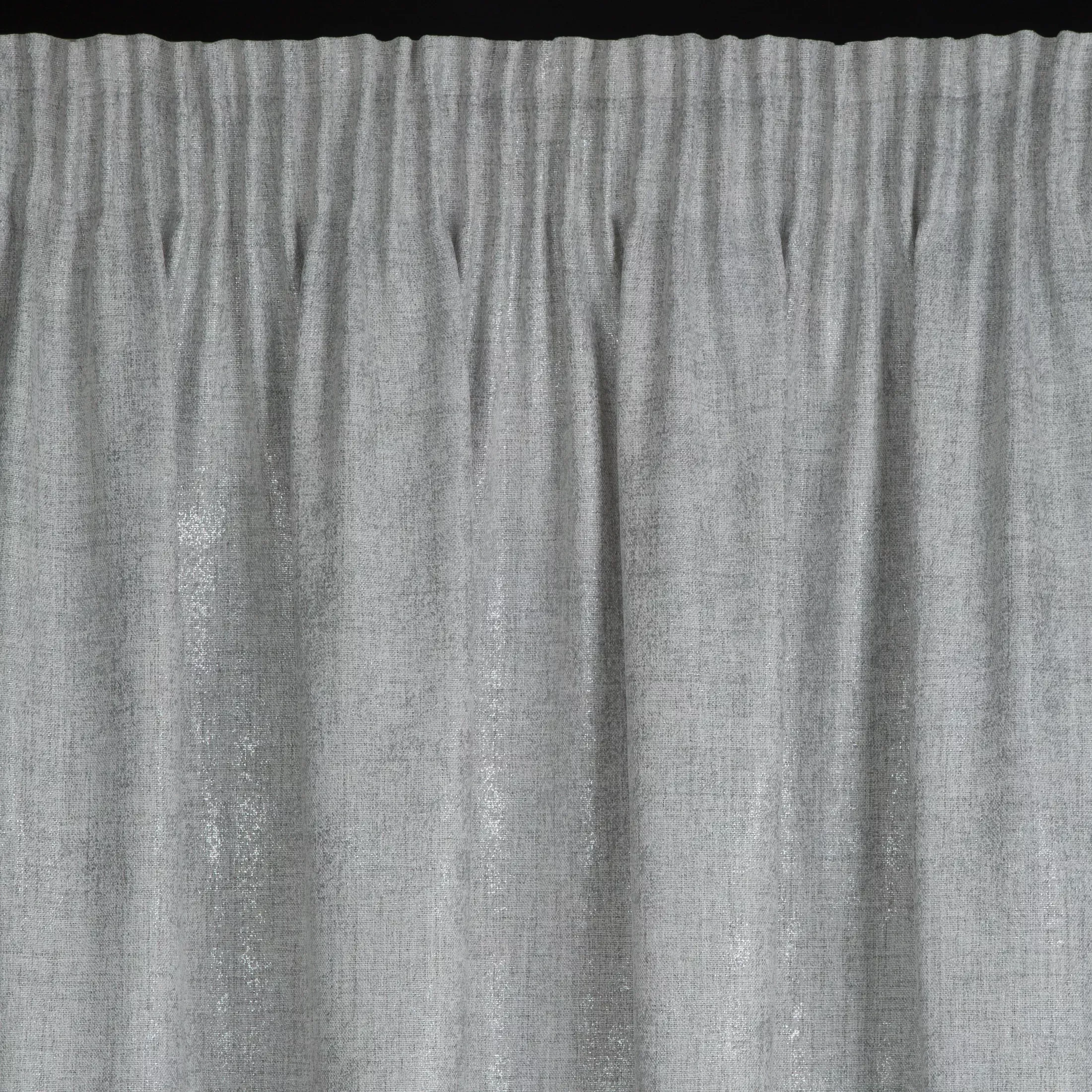 Závěs Blanka, látka plátěného vzhledu volněji tkaná, univerzální řasící páska, barva šedostříbrná melanž, jemný stříbřitý nepravidelný potisk dodá efekt metalízy