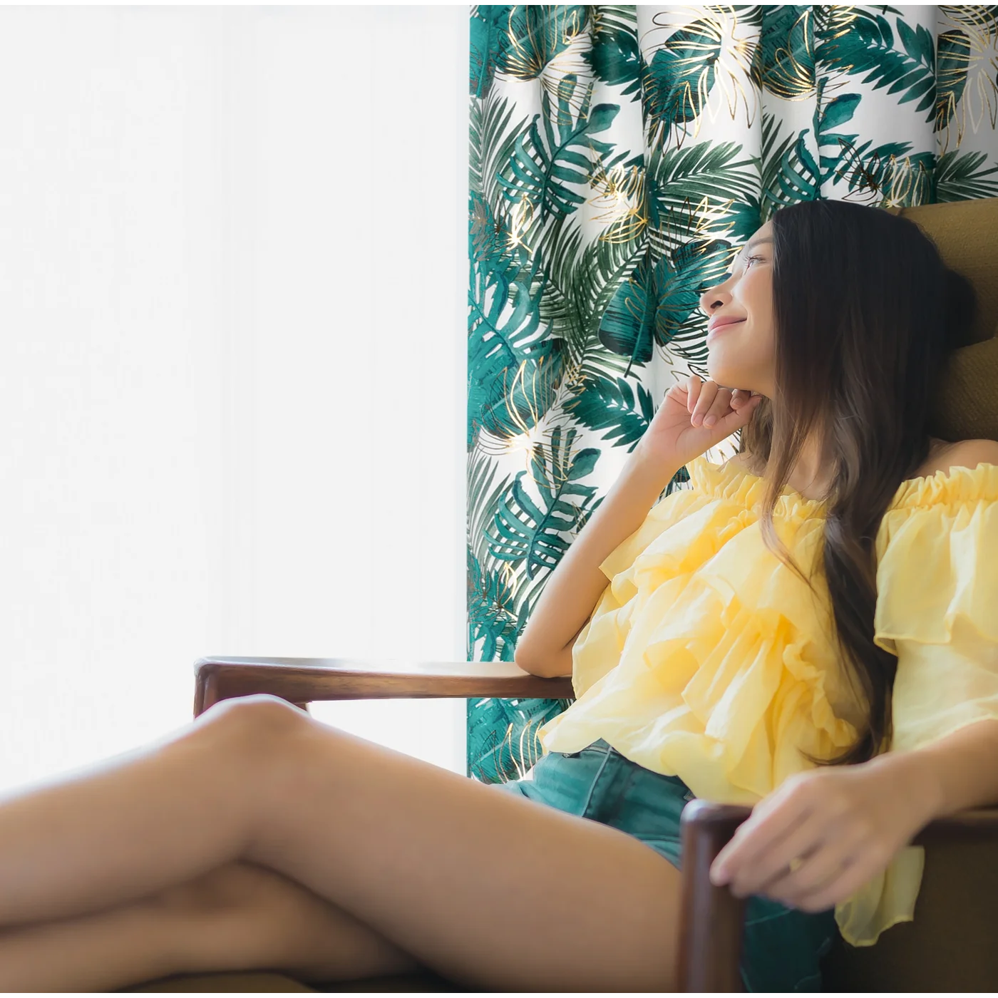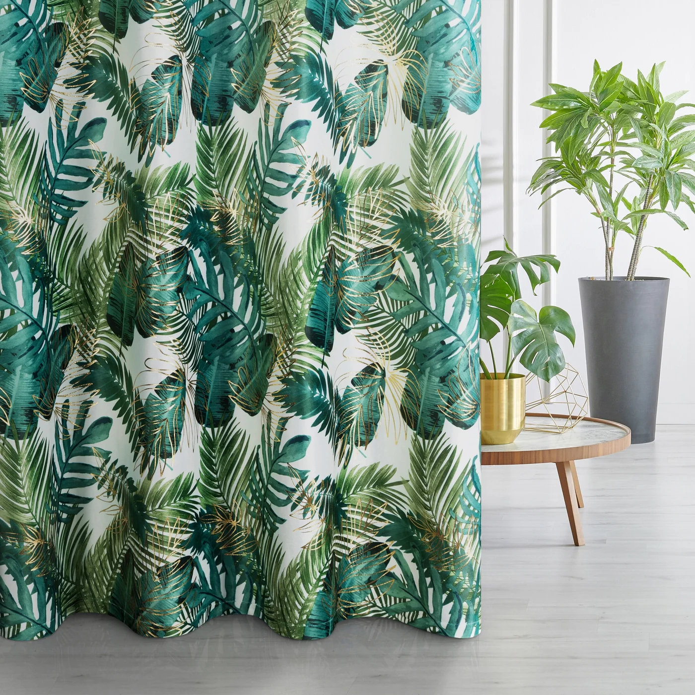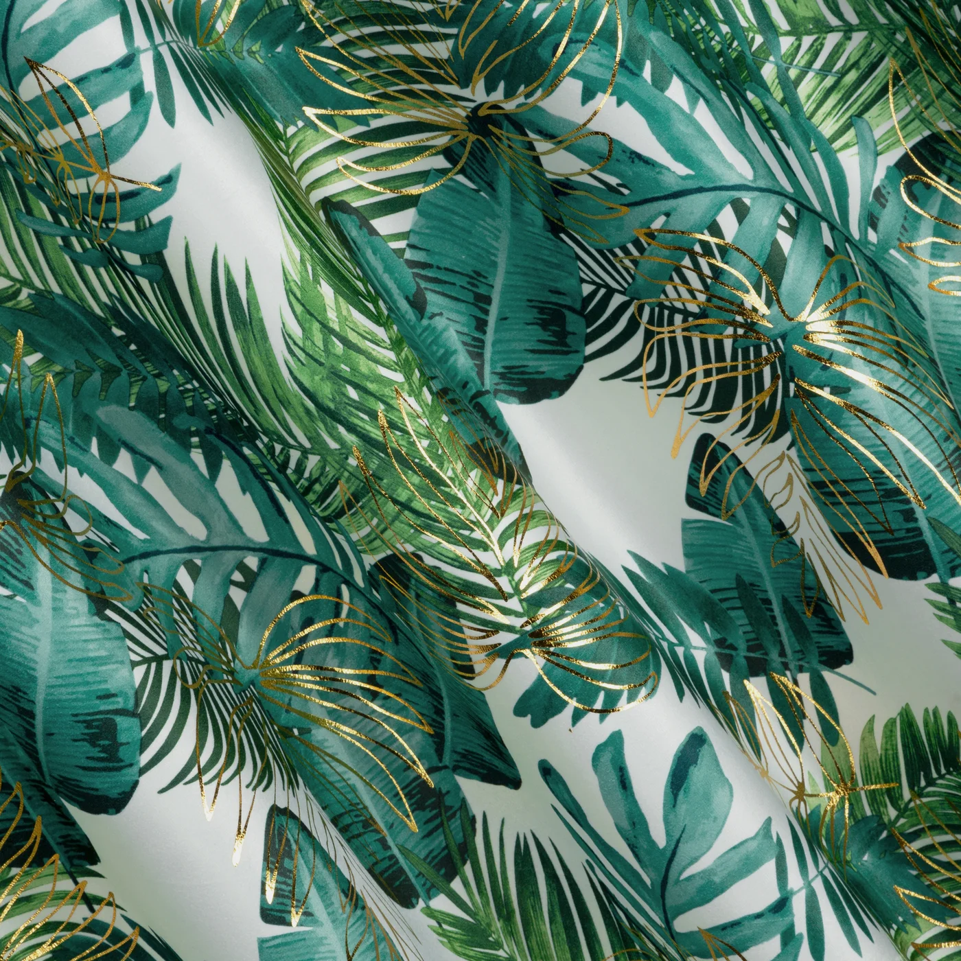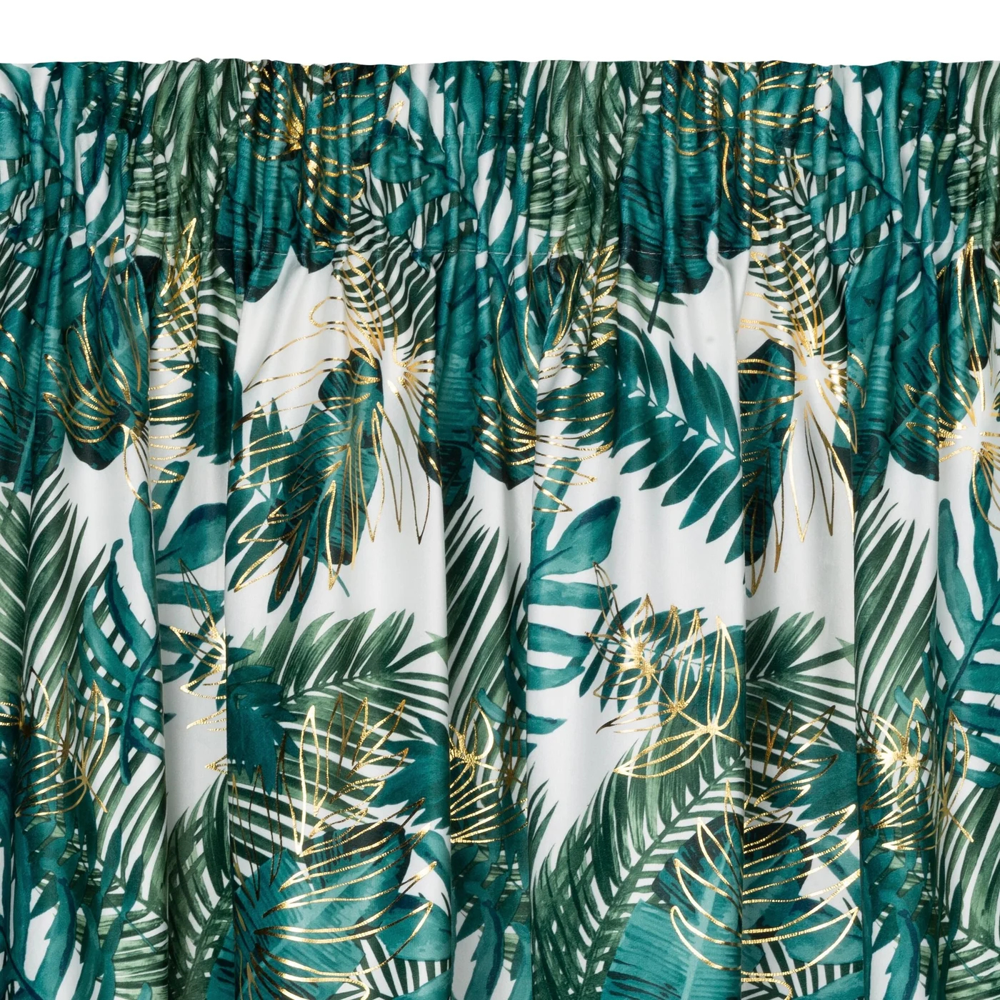 Závěs Davos Z, trendy potisk vzorem exotických listů v syté koloristice + dekorace dotisk zlatými siluetami listů, řasící páska