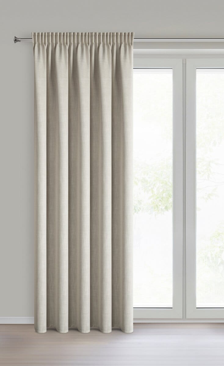 Závěs Leya, hladká matná látka s jemnou strukturou, barva béžová melanž, univerzální řasící páska, zavěšení na háčky, žabky, možnost použití tunýlku za řasící páskou
