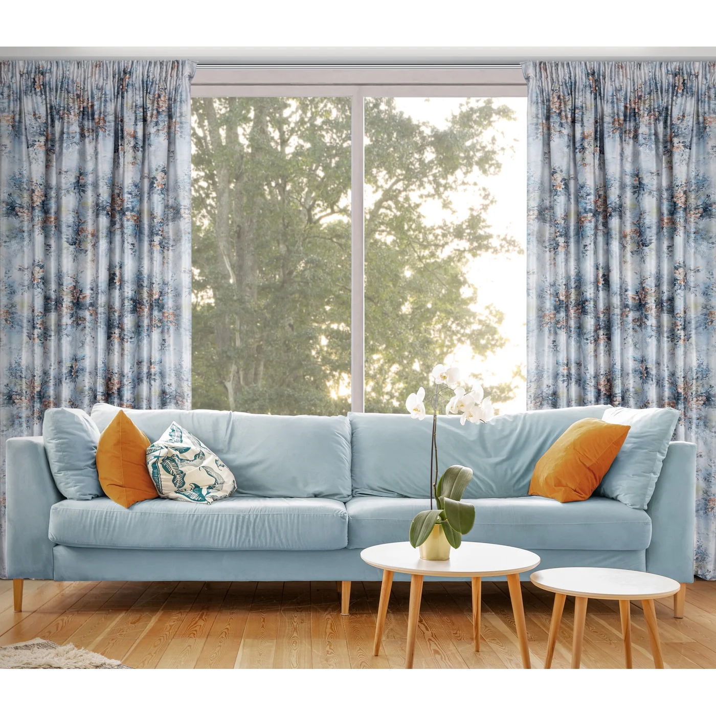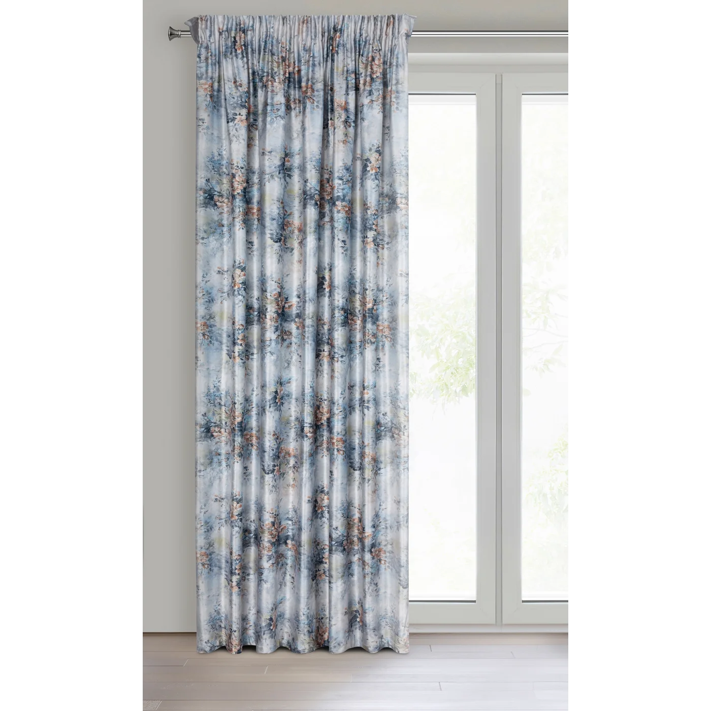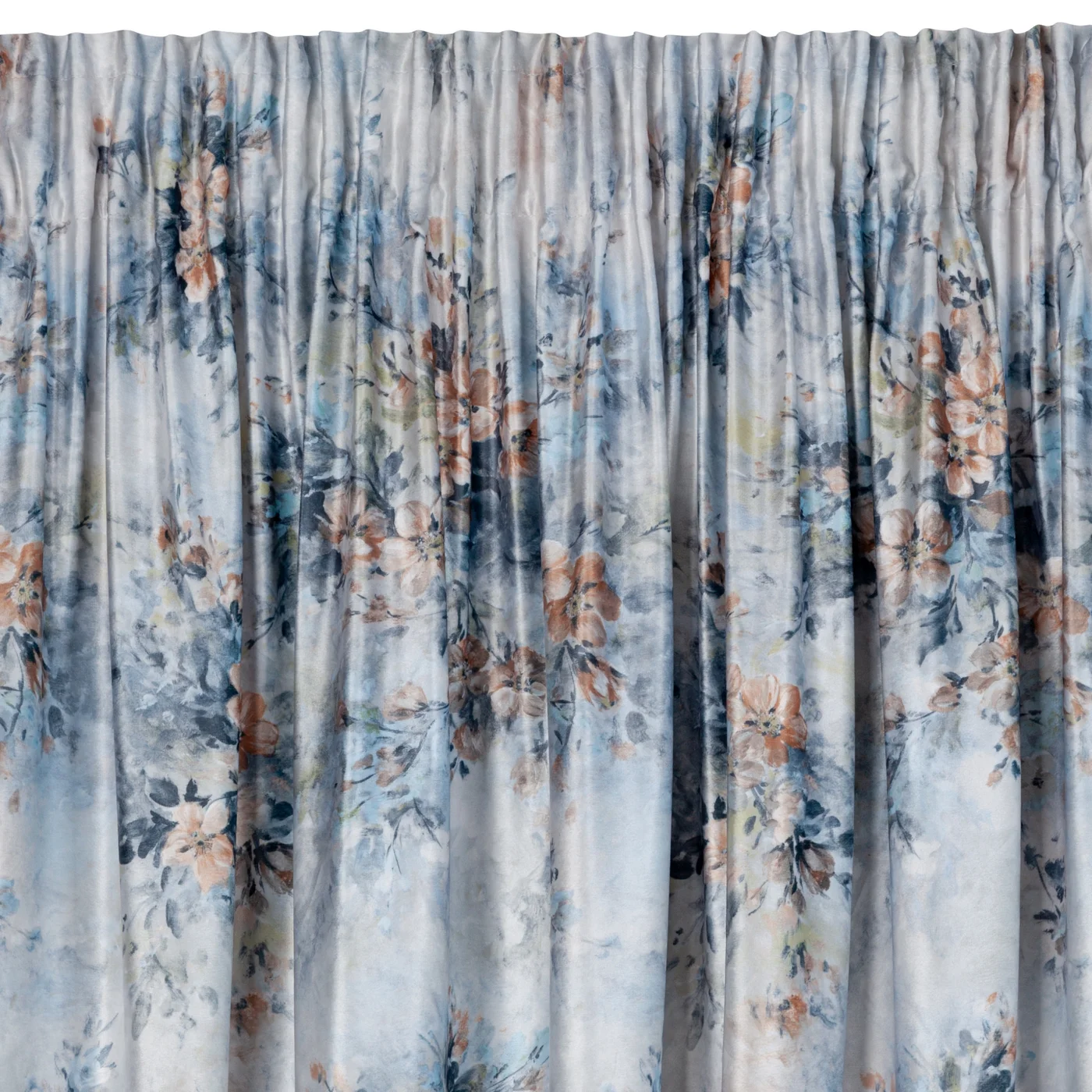 Závěs Marisa2, hebký velvet s romantickým květovým potiskem v modrém ladění, univerzální řasící páska se skrytým tunýlkem