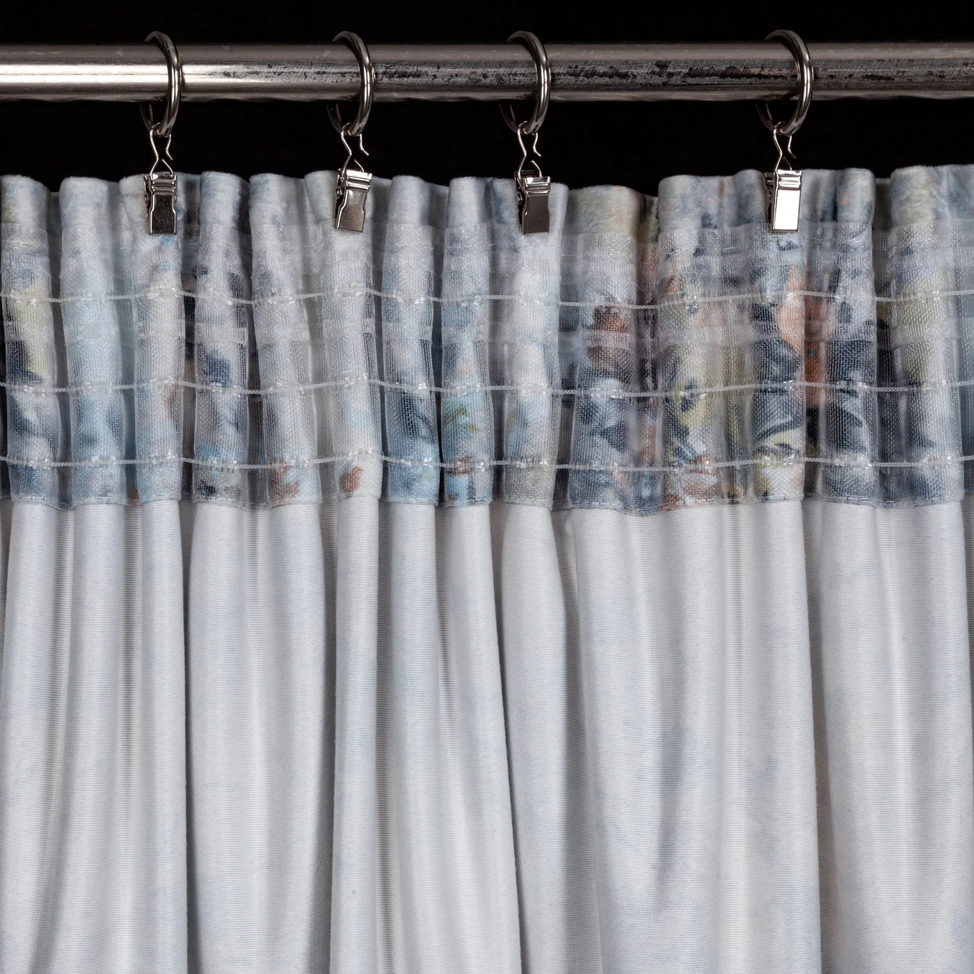 Zavěšení na háčky, žabkami nebo přímé nasunutí na garnýžovou tyč do tunýlku.