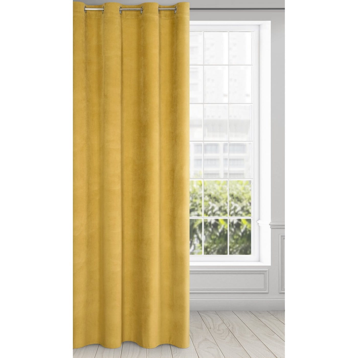Závěs Milo, medová žlutá, velvet + drobný eco splot, na kroužcích, velikost 140x250cm, lze zkrátit