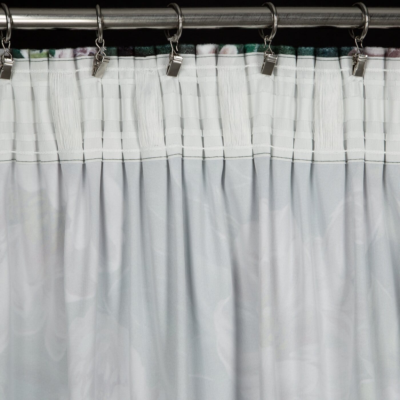 | Zavěšení | za stužky řasící pásky na háčky na garnýži, na háčky na stropní kolejničce, žabkami shora za okraj látky nebo za řasící pásku, pomocí skrytých poutek přímo na garnýžovou tyč |